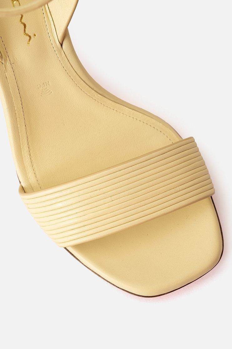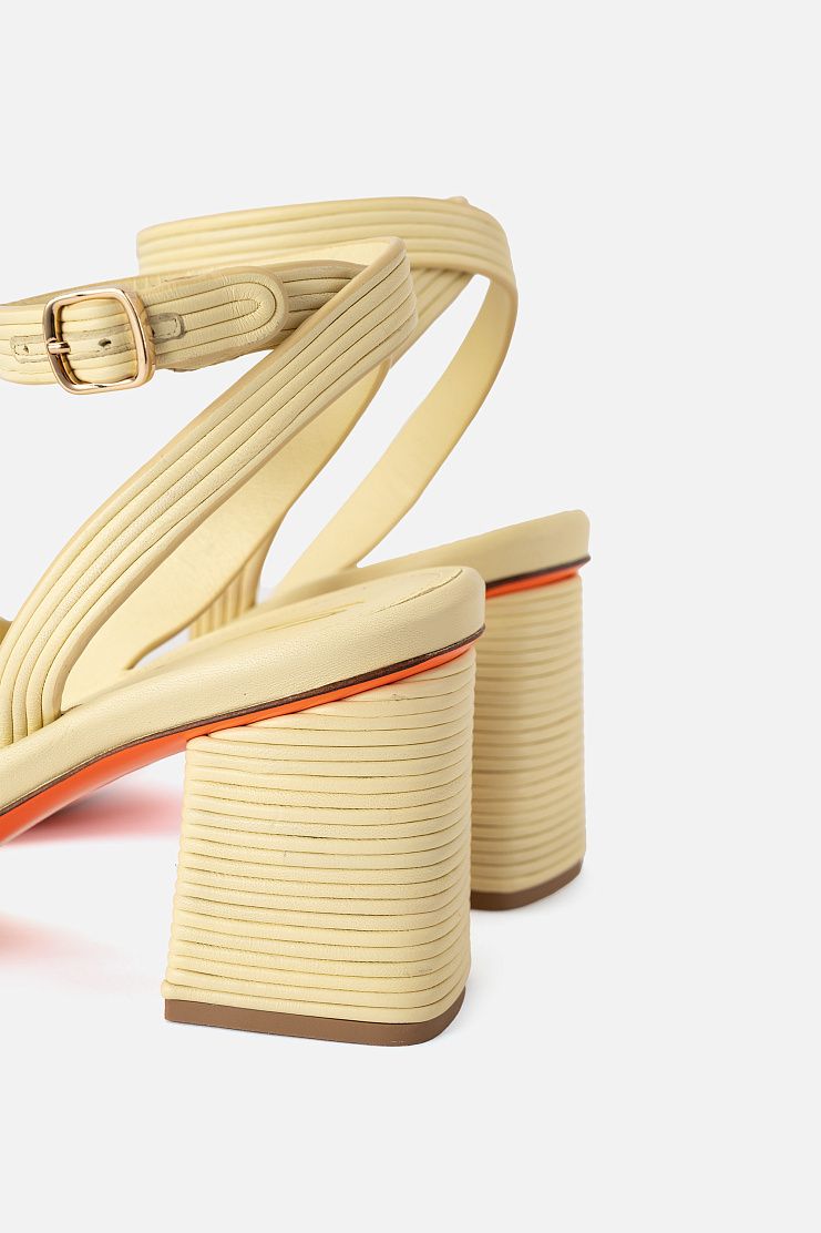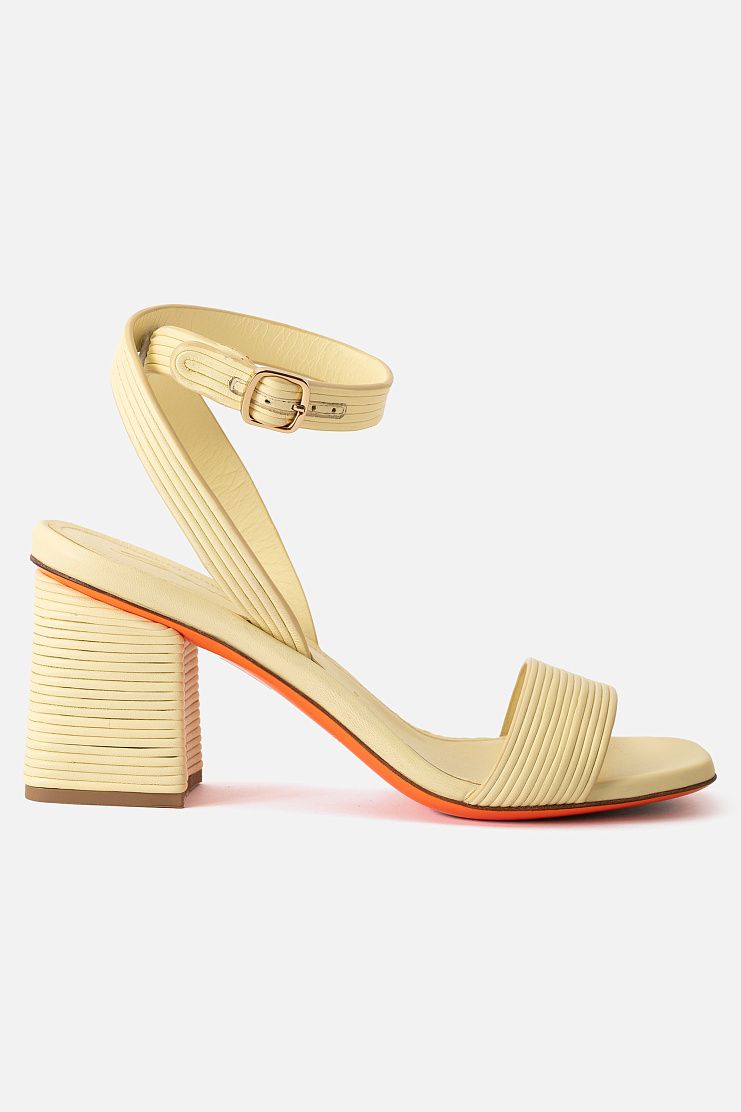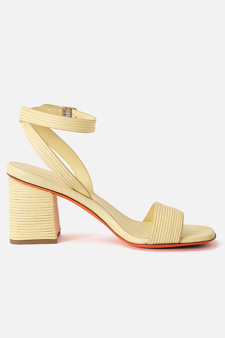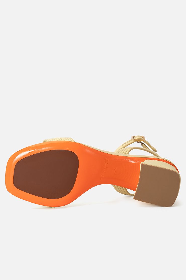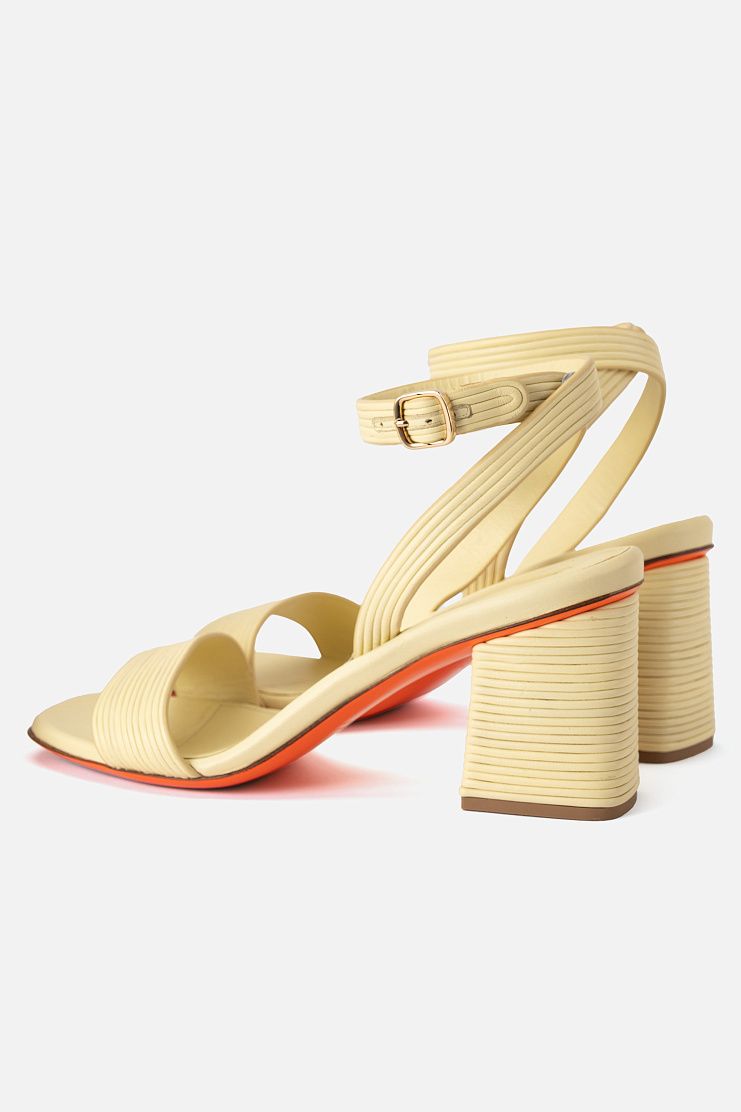 Босоножки на устойчивом блочном каблуке изготовили из узких кожаных шнуров. Модель дополнена ремешками, которые обвивают щиколотку и застегиваются с помощью пряжек. Узнаваемый элемент декора Santoni — подошва фирменного оранжевого оттенка.