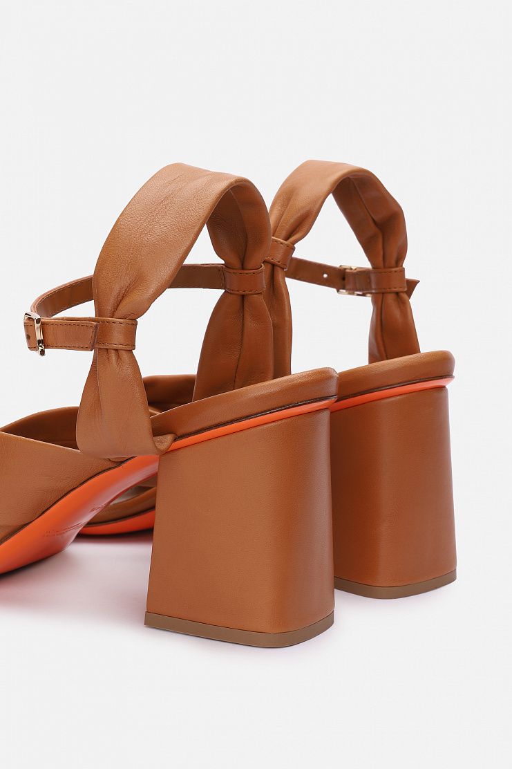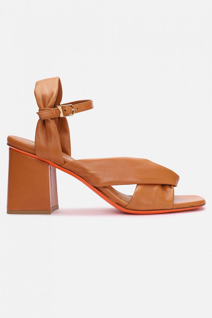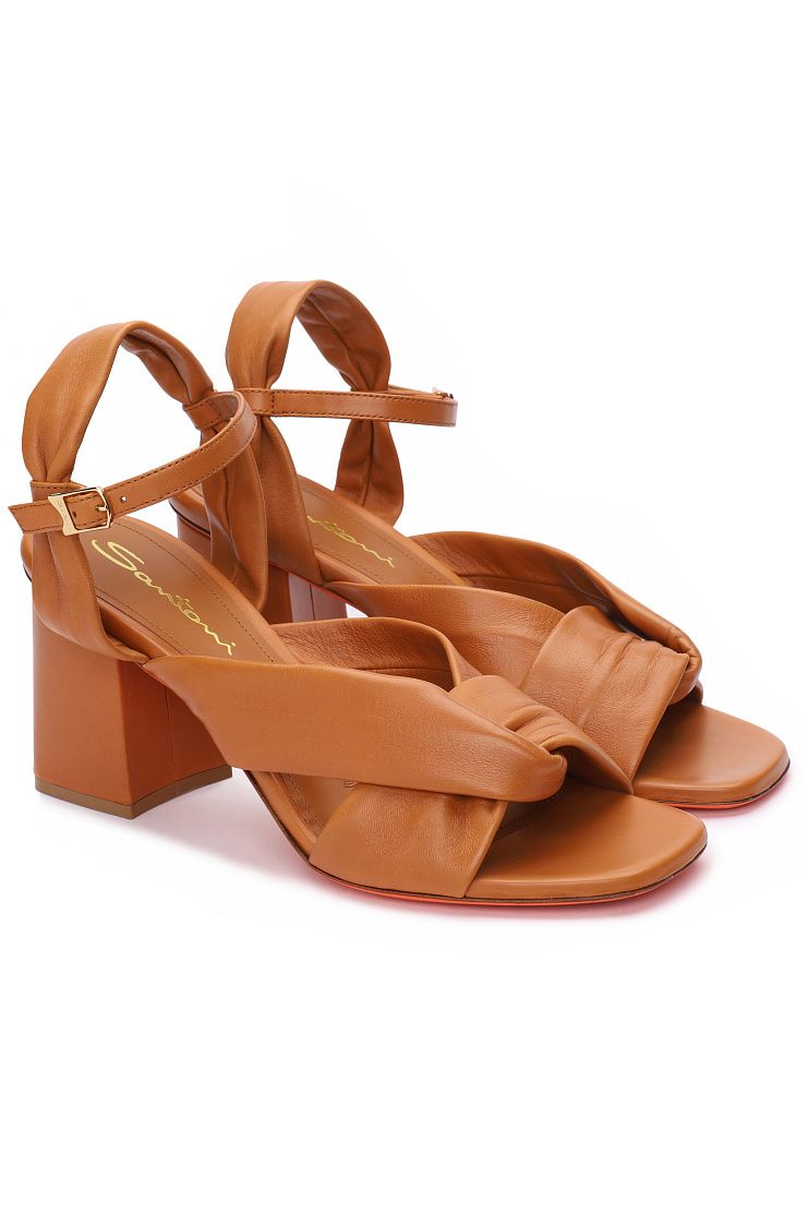 Босоножки с объемными перемычками из мягкой кожи и ремешком на застежке в области щиколотки. Модель имеет кожаную подкладку и широкий средний каблук. Каждая пара обуви бренда Santoni оснащена чипом с технологией NFC, гарантирующей оригинальность продукта.