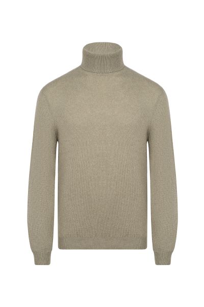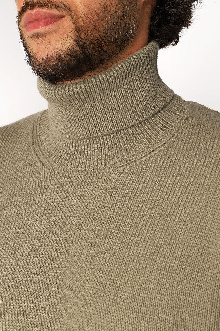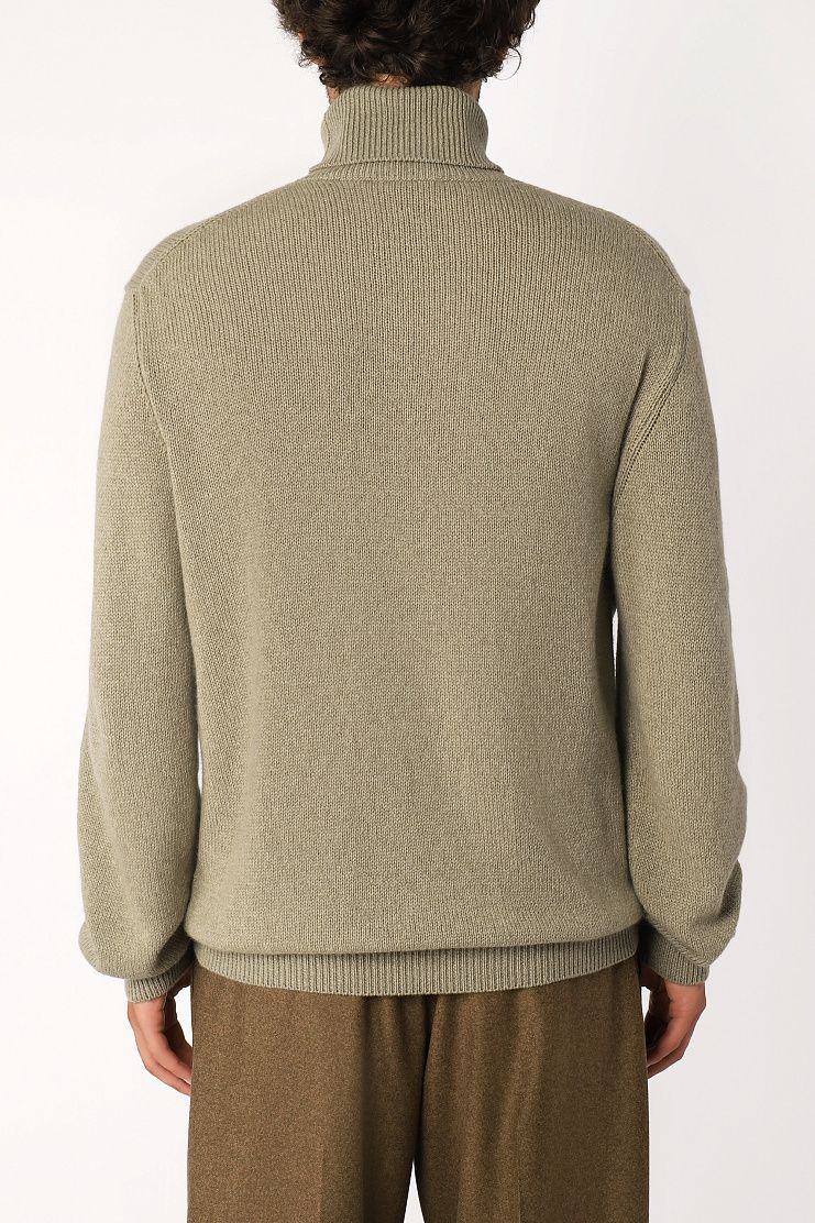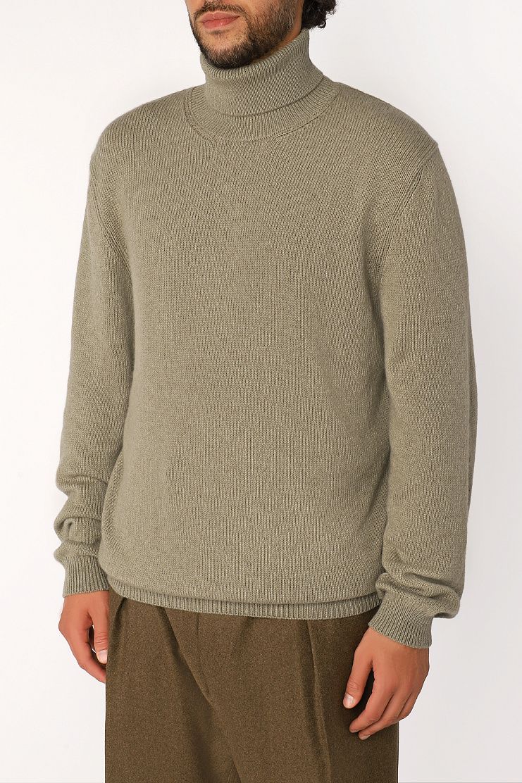 Бадлон свободного кроя выполнили из мягкого и теплого кашемира. Модель с высоким воротником и спущенной линией плеча дополнили эластичной отделкой в рубчик на манжетах и поясе.