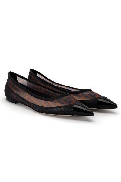 Балетки на небольшом каблуке выполнены из полупрозрачной сетчатой ткани с узором FF. Модель дополнена окантовкой из телячьей кожи и блестящей вставкой с логотипом на зауженном мысе. Отличный вариант для образов в стиле smart casual.