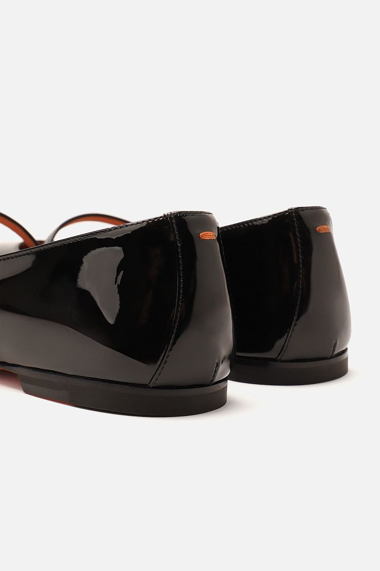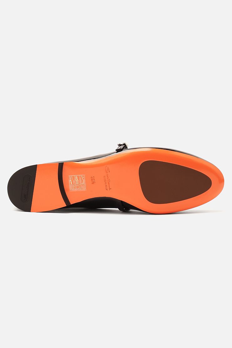 Балетки на невысоком каблуке выполнили из блестящей лаковой кожи. Модель дополнена узкими ремешками с украшенными кристаллами пряжками. Подошва и стичинг фирменного оттенка Arancio Santoni придают фирменный акцент.