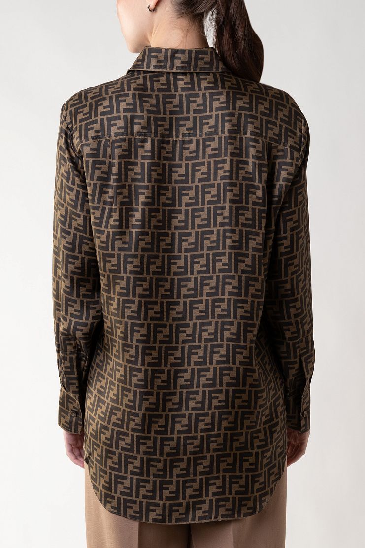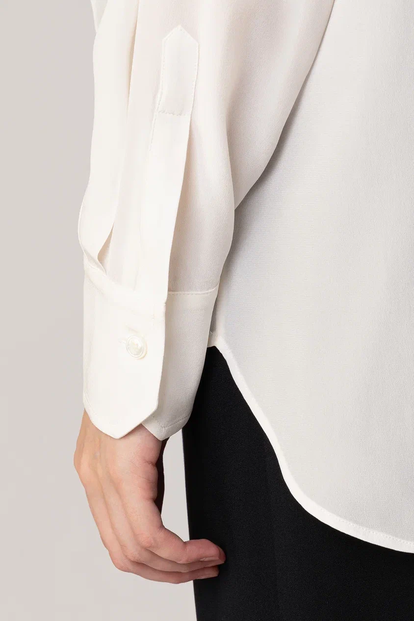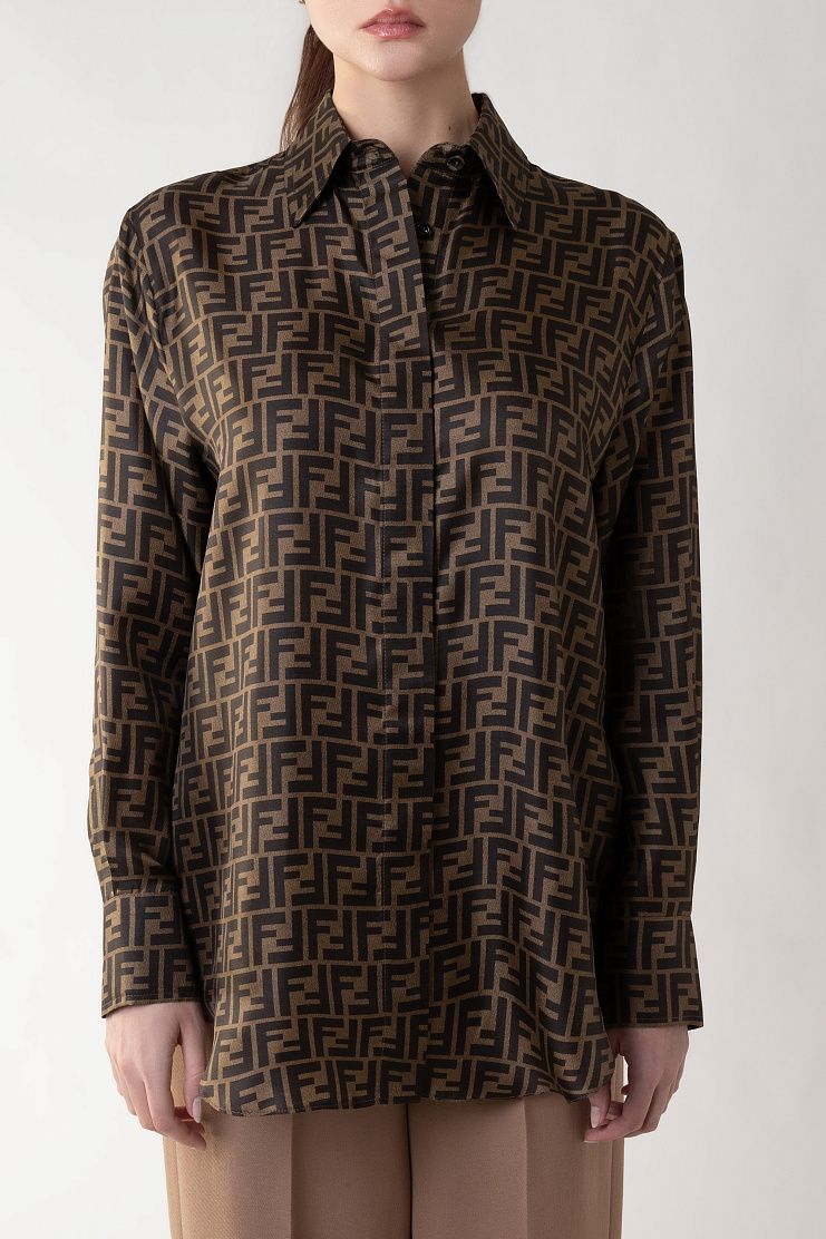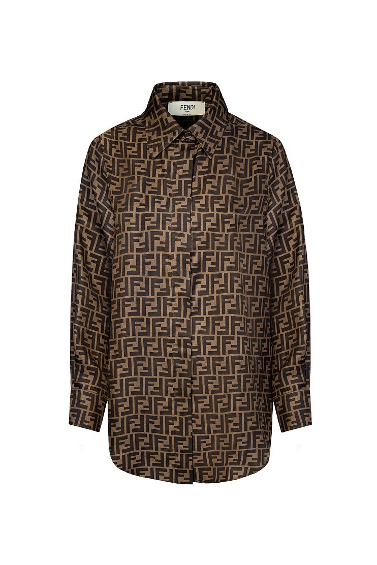 Рубашку свободного кроя сшили из струящегося шелка, украшенного фирменным паттерном бренда. Модель с отложным воротником и фигурным низом застегивается на скрытые под планкой пуговицы. Блузу можно сочетать с однотонными брюками или юбкой, а также носить как второй слой с топом или футболкой.