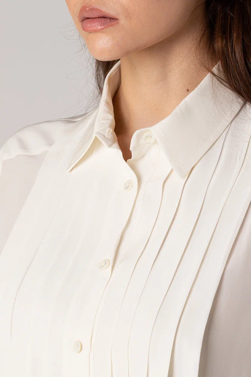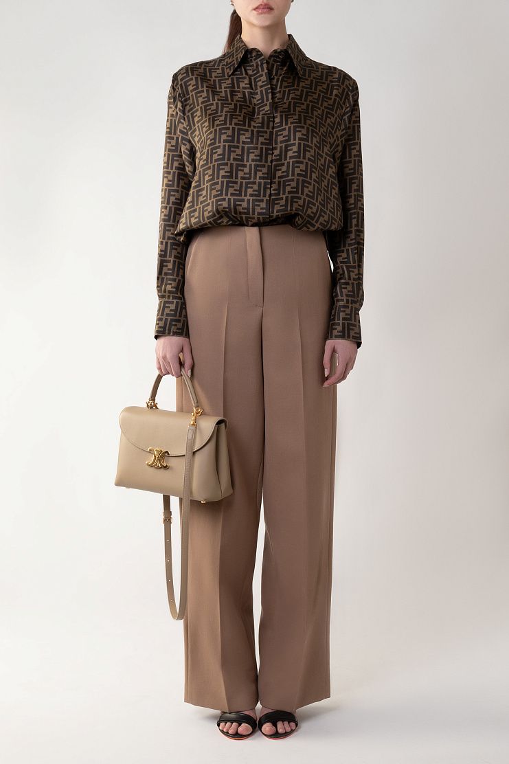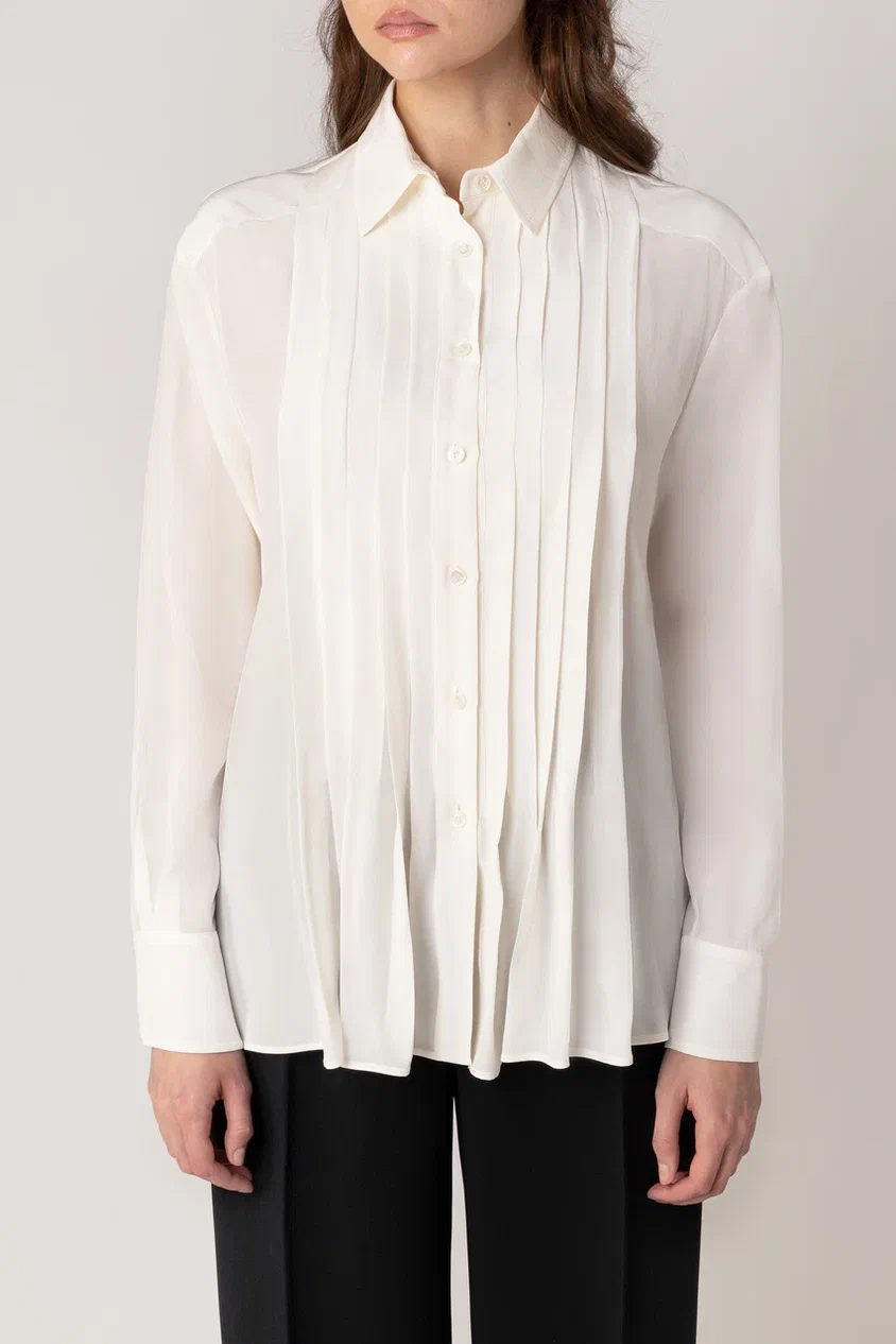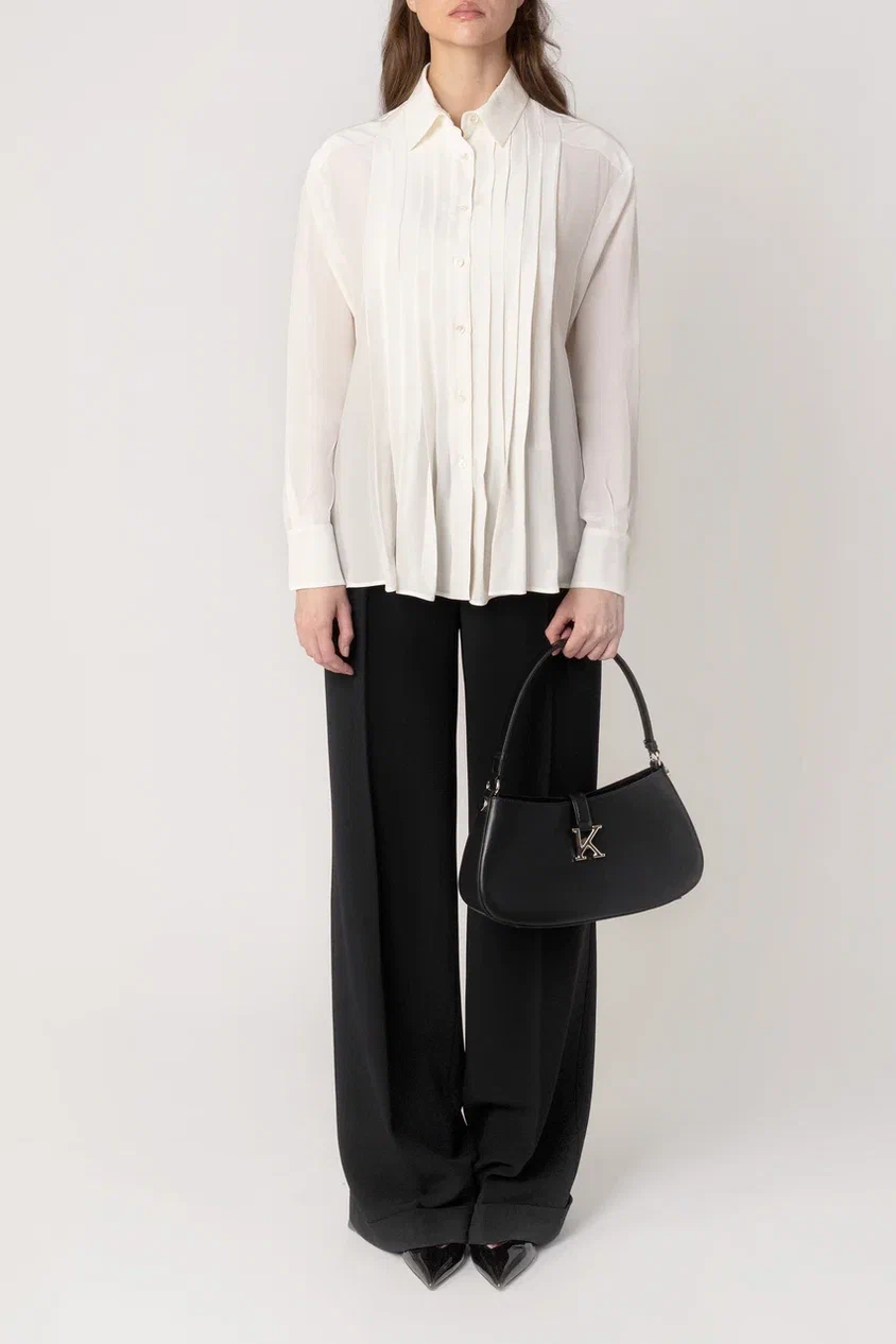 Рубашку свободного кроя сшили из струящегося шелка, украшенного фирменным паттерном бренда. Модель с отложным воротником и фигурным низом застегивается на скрытые под планкой пуговицы. Блузу можно сочетать с однотонными брюками или юбкой, а также носить как второй слой с топом или футболкой.