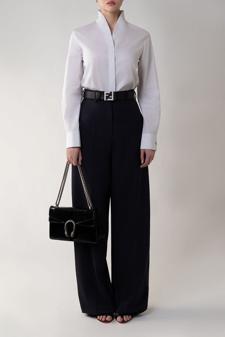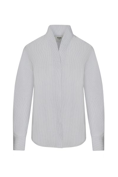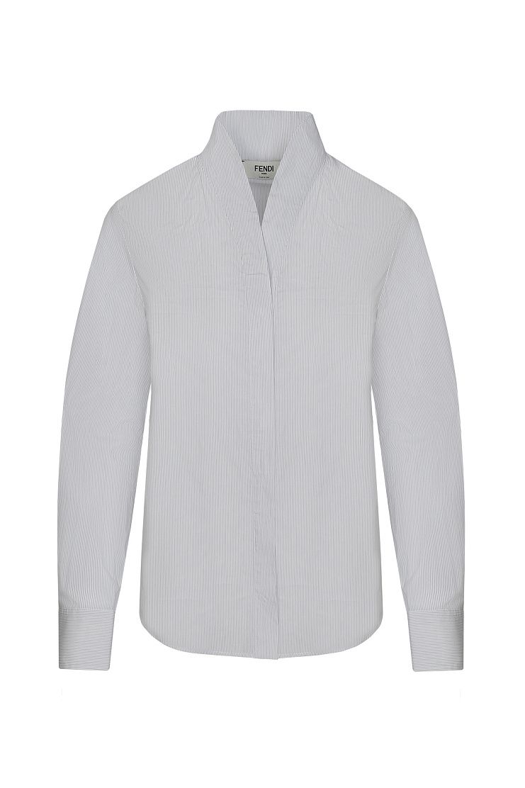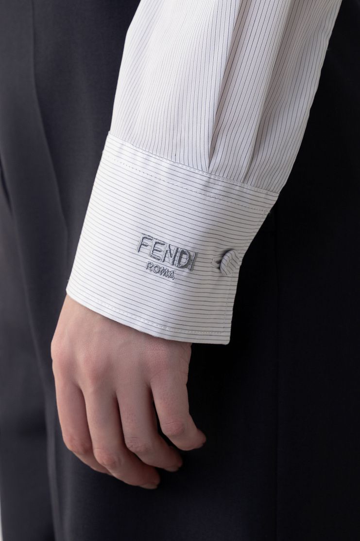 Рубашка приталенного силуэта выполнена из мягкого хлопка в тонкую полоску. Модель с воротником-стойкой, V-образным вырезом и длинными рукавами застегивается на скрытые под планкой пуговицы. Левую манжету изделия декорировали вышитым логотипом Fendi Roma в тон.