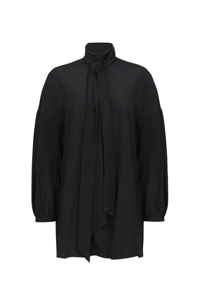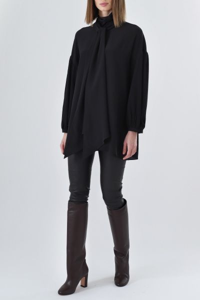 Элегантная блуза из струящейся шелковой ткани отличается деталью воротника в виде шарфа. Модель свободного кроя, со спущенной линией плеч и застежкой на пуговицу, расположенной на спине.