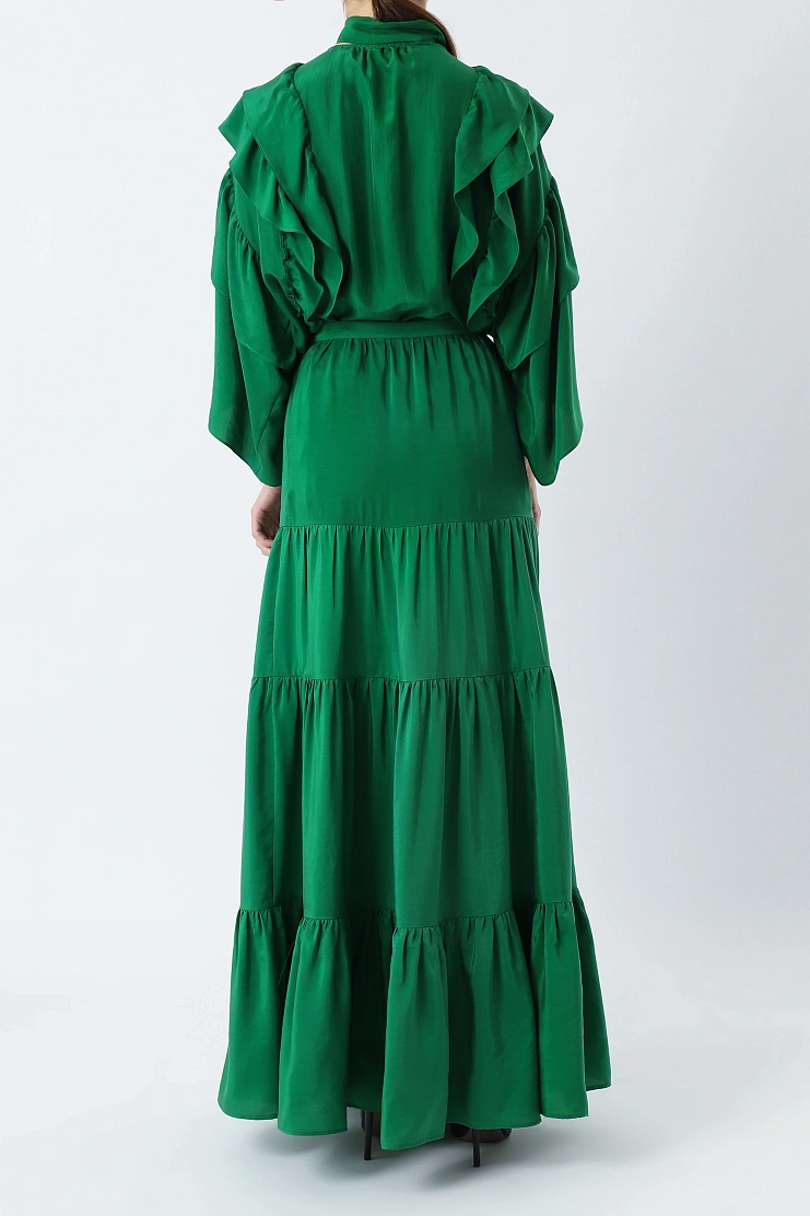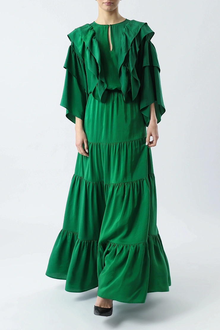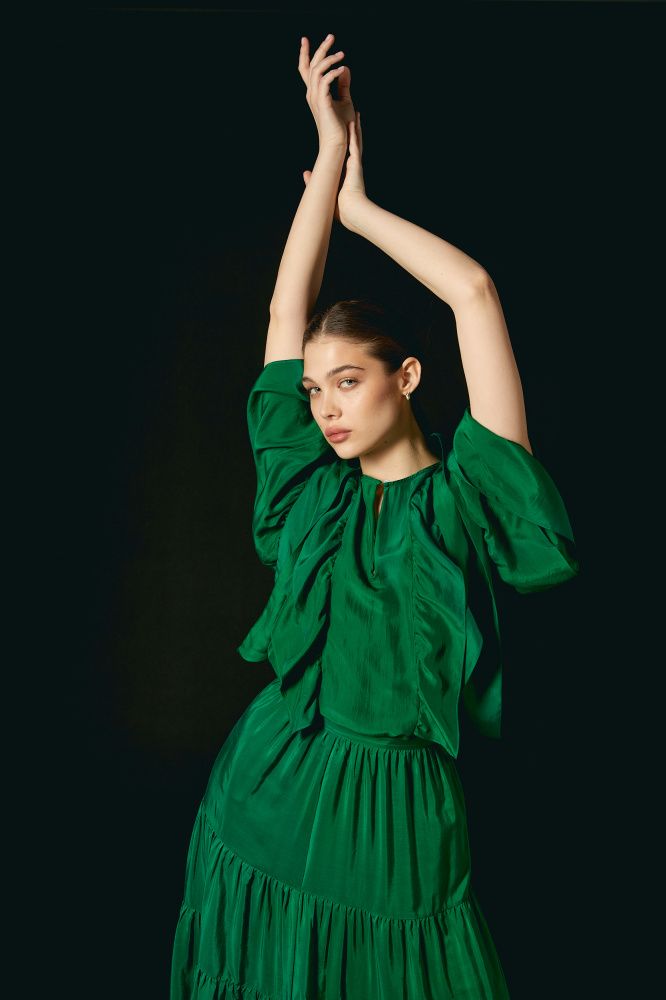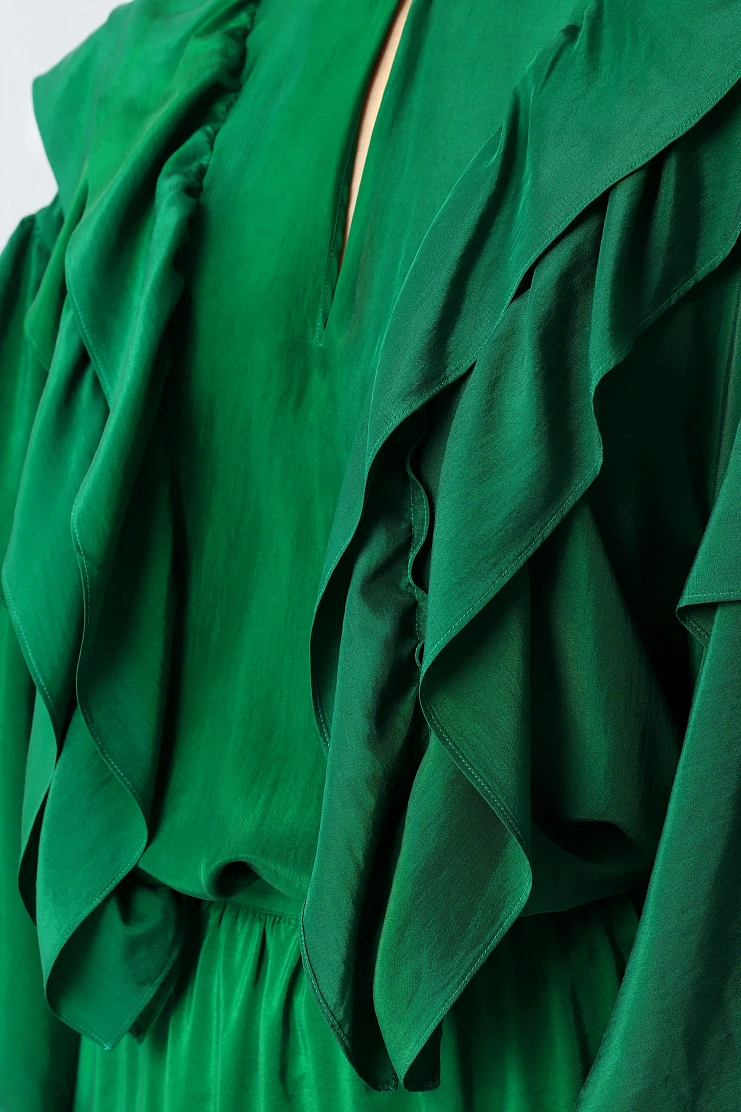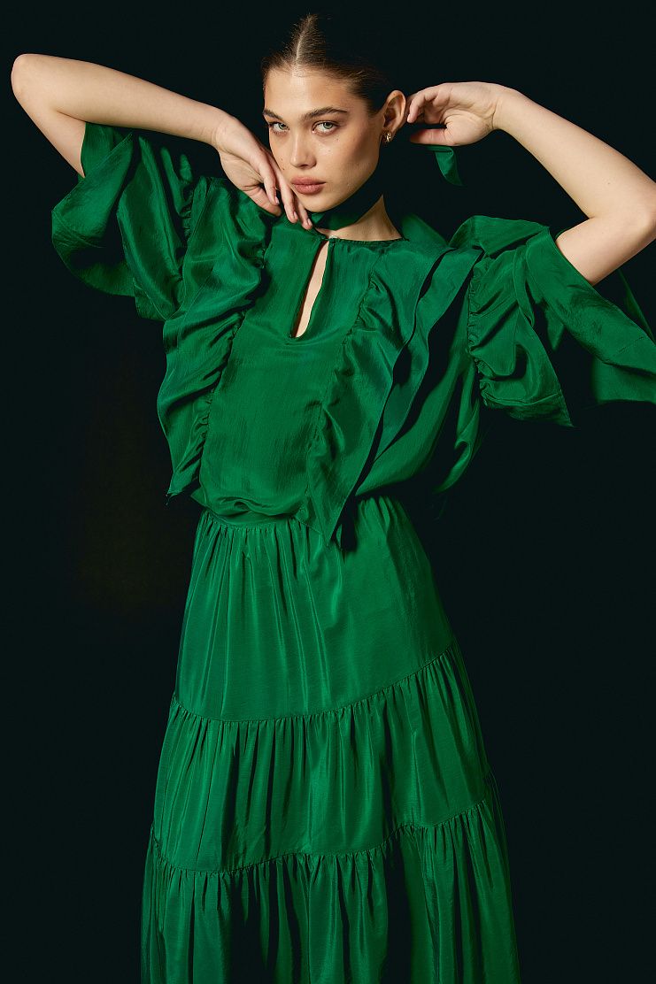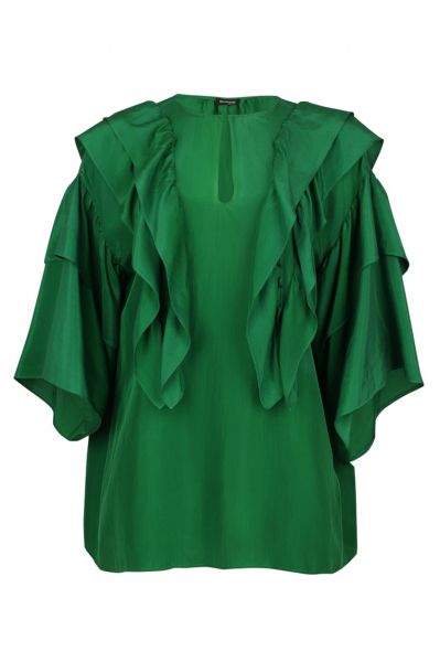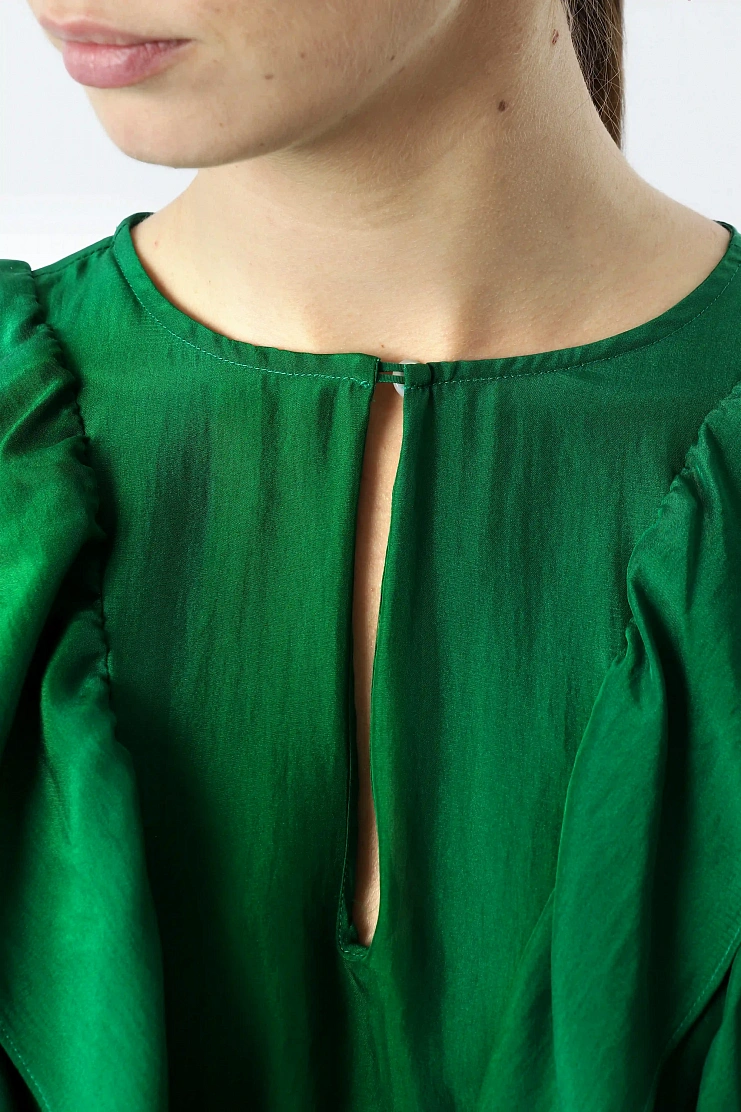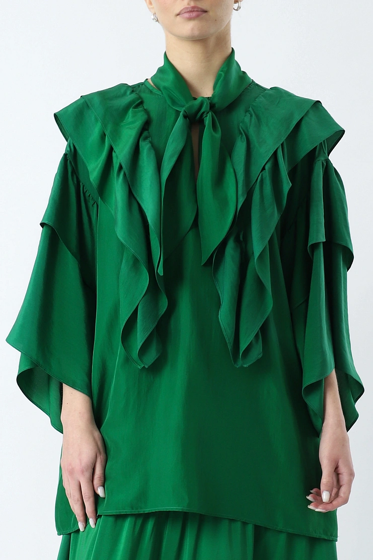 Блуза выполнена из нежного шелка. Воланы на передней и задней части, а также струящиеся рукава придают модели легкость и воздушность. Изделие свободного кроя с шарфом и передней застежкой на одну пуговицу.