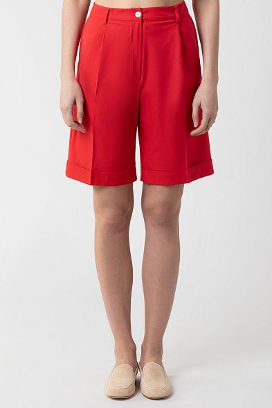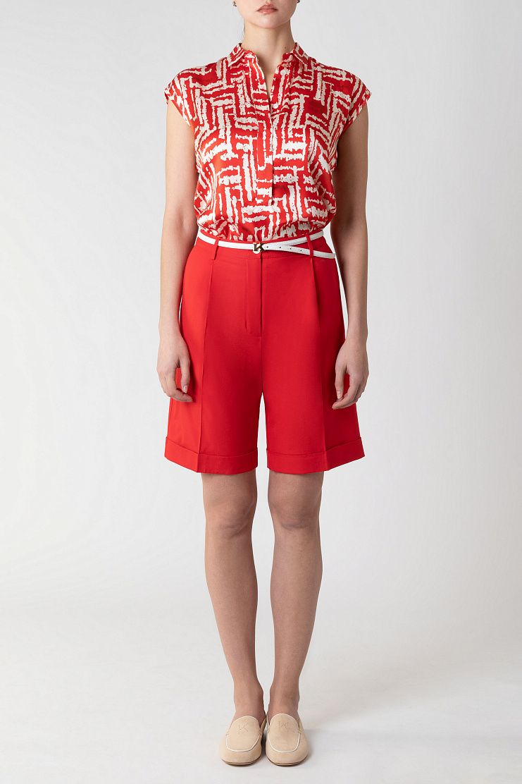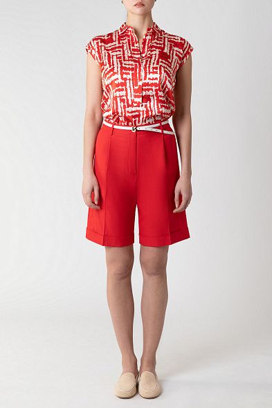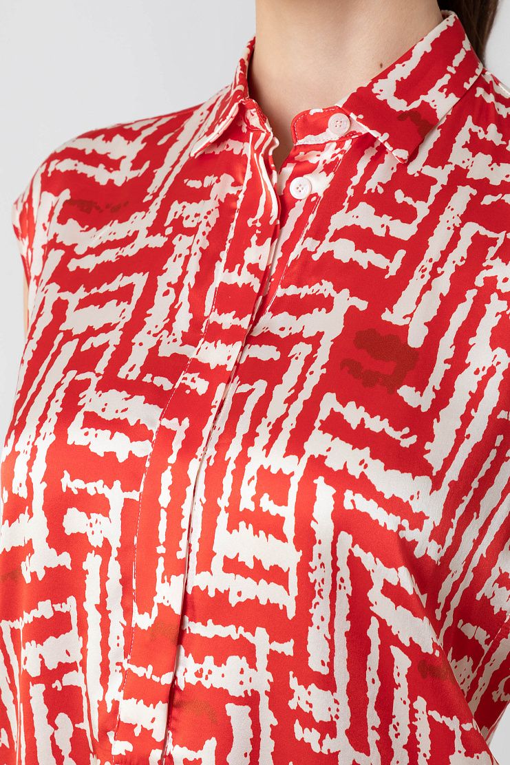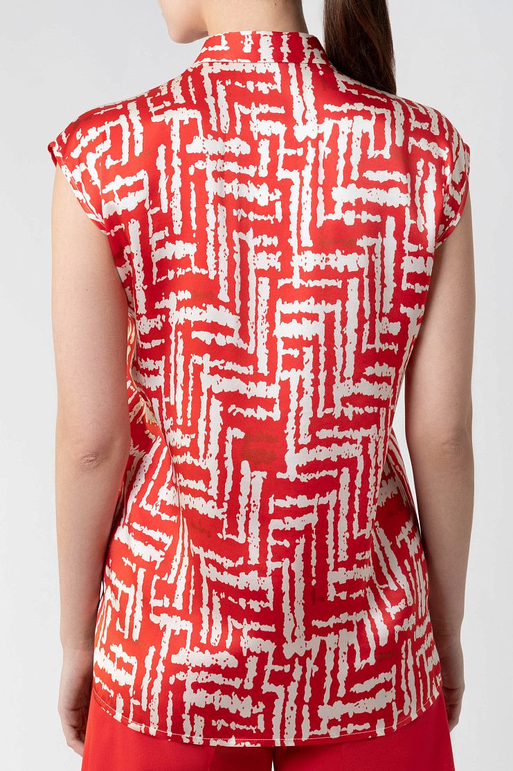 Блузу без рукавов сшили из гладкого набивного шелка с контрастным рисунком. Модель с отложным воротником застегивается на пуговицы, скрытые под короткой планкой. Блуза составит гармоничный комплект с однотонными брюками или юбкой.