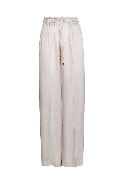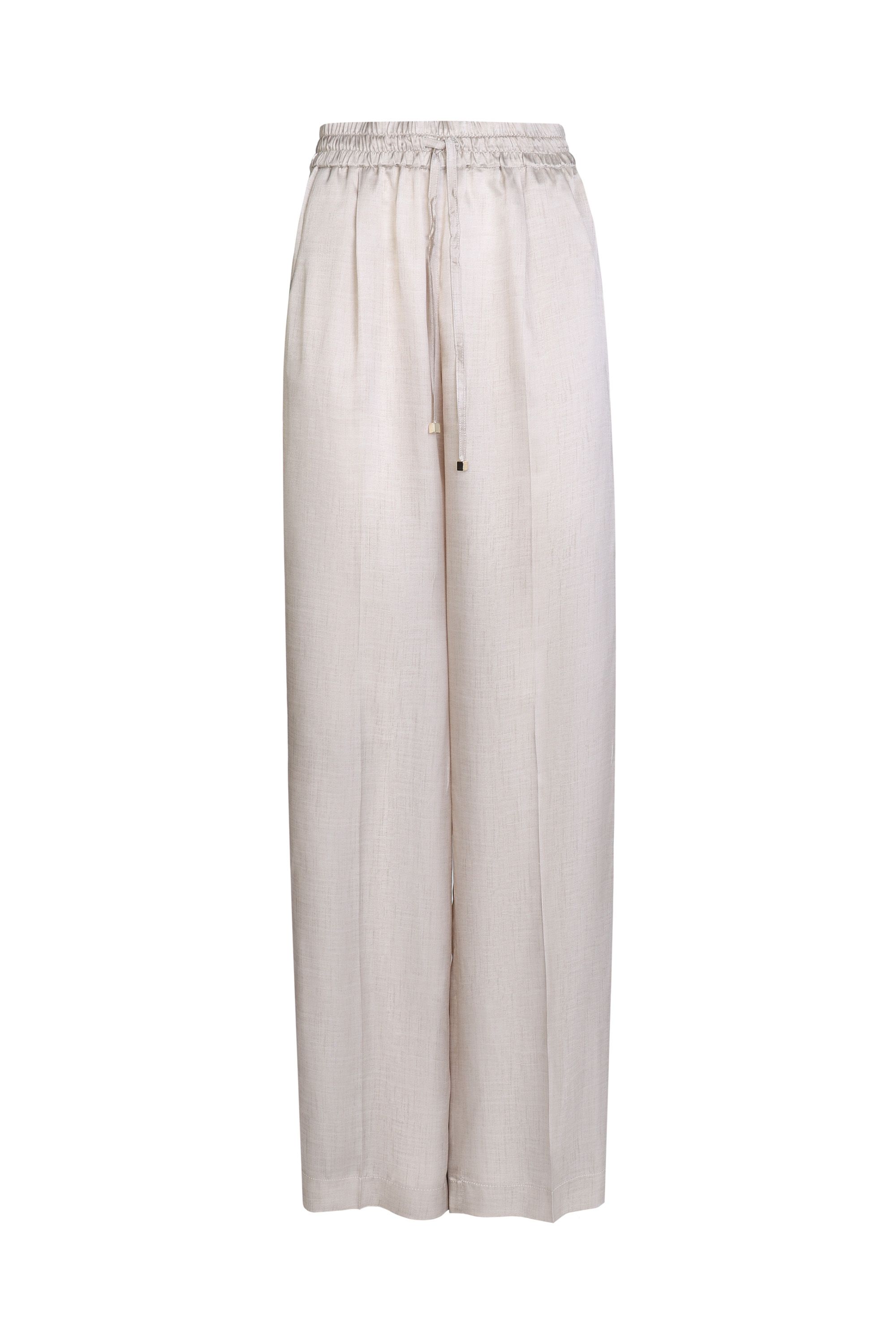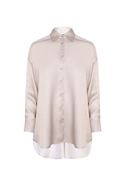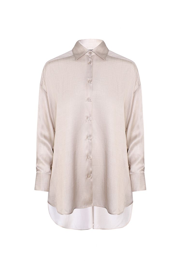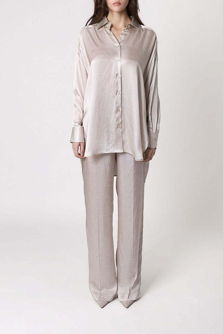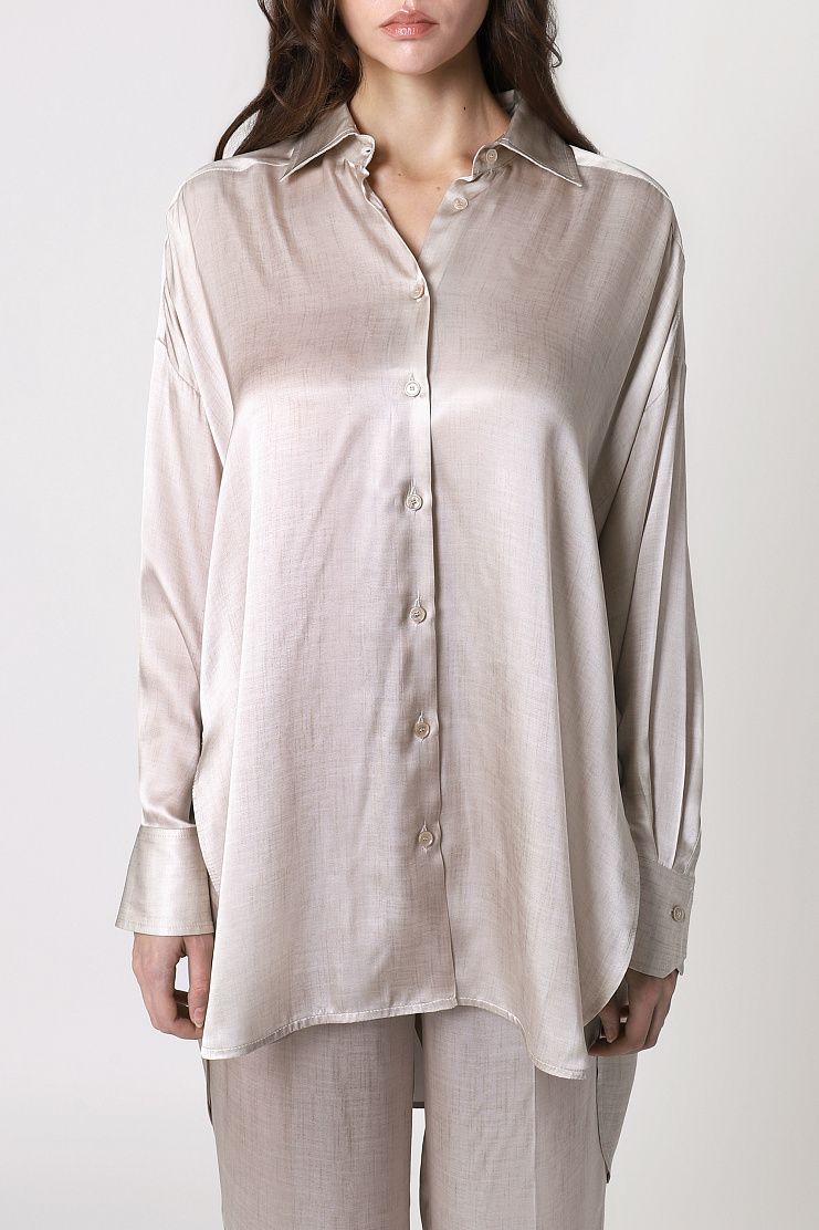 Блуза с отложным воротником выполнена из гладкого блестящего шелка с добавлением вискозы. Модель свободного кроя со спущенной линией плеч дополнили широкими манжетами, закругленными разрезами по бокам и удлиненной спинкой. Застегивается на пуговицы.