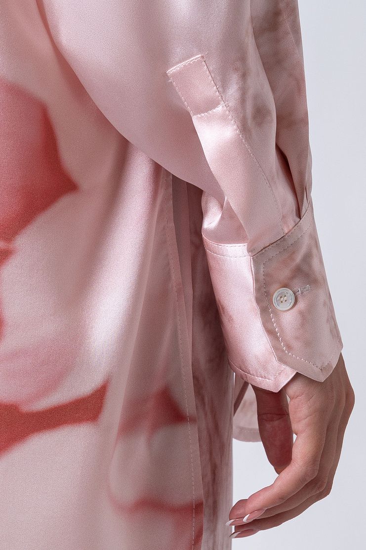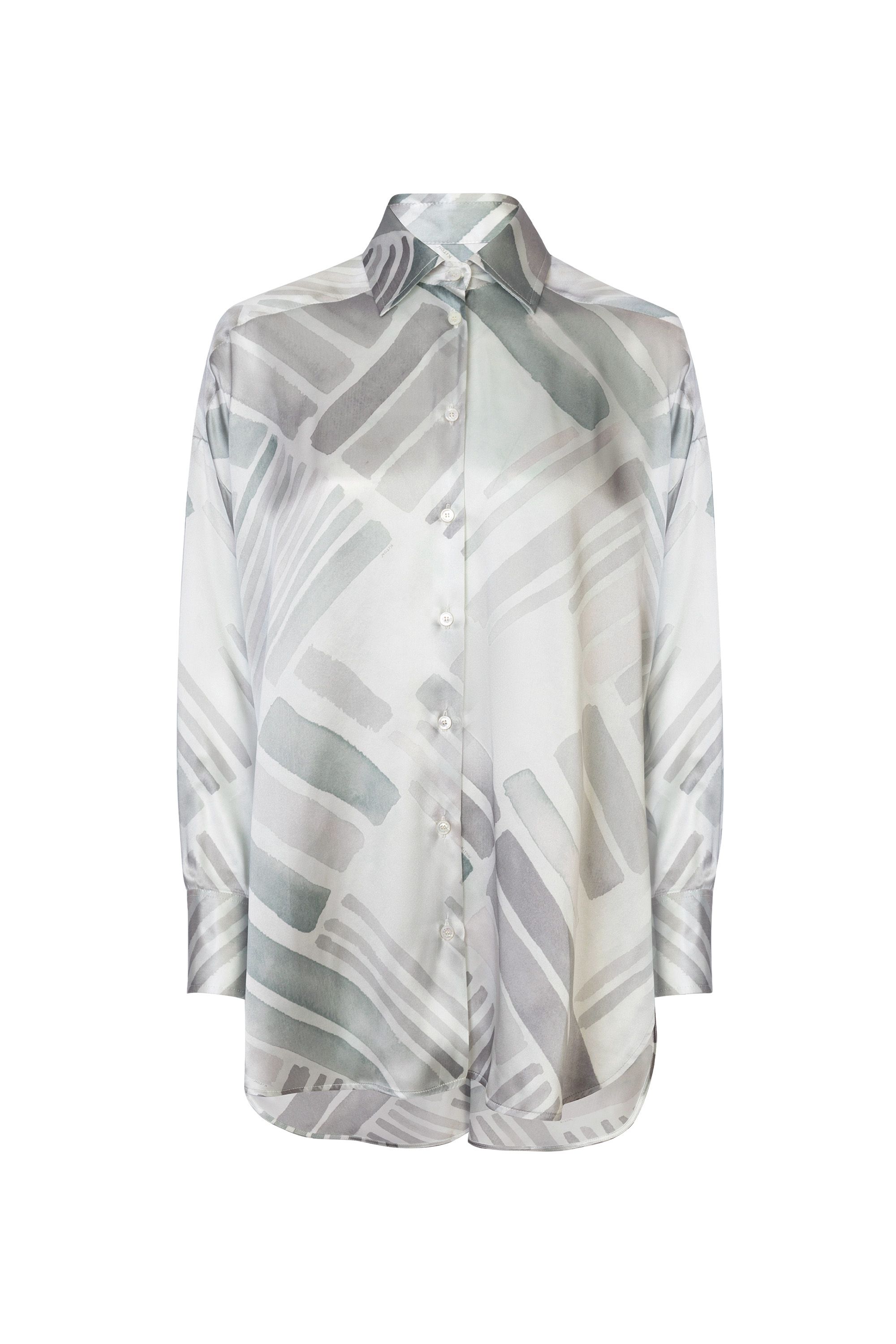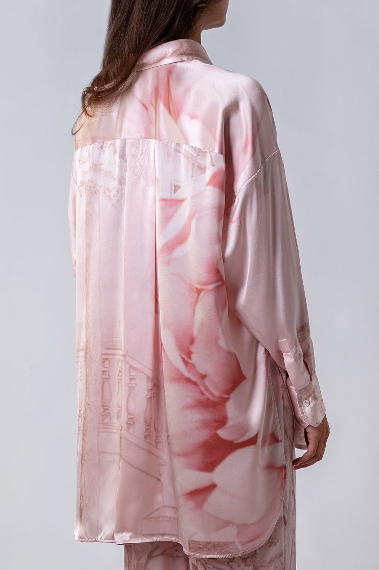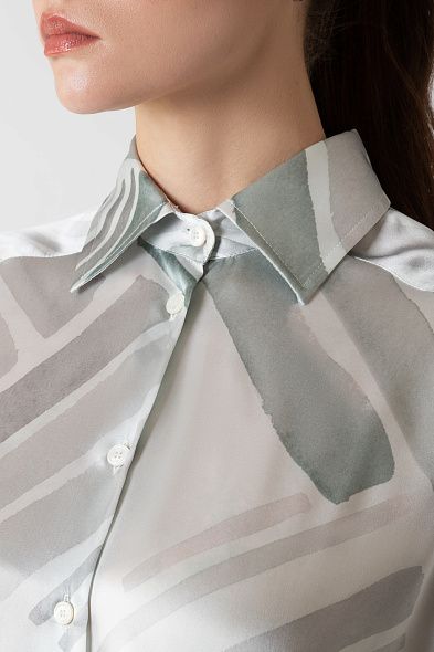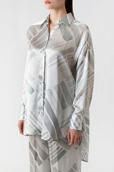 Блузу с удлиненной спинкой сшили из тонкого струящегося шелка с акварельным принтом, вдохновленным пейзажами Неаполя. Модель со спущенной линией плеч дополнена отложным воротником, скругленными разрезами по бокам и широкими манжетами.