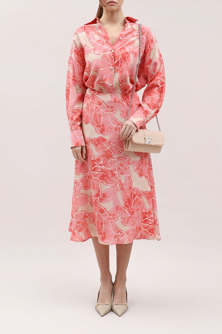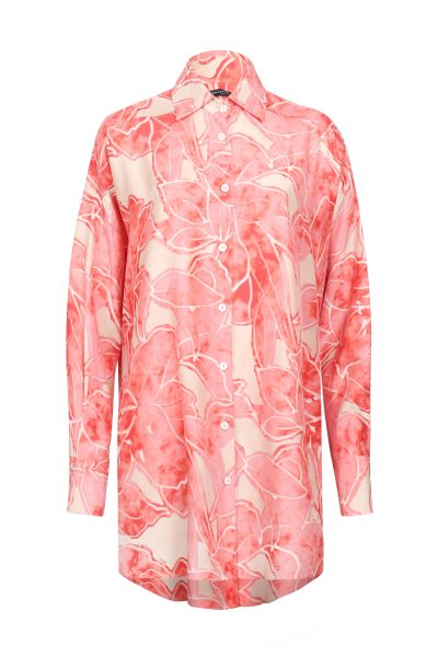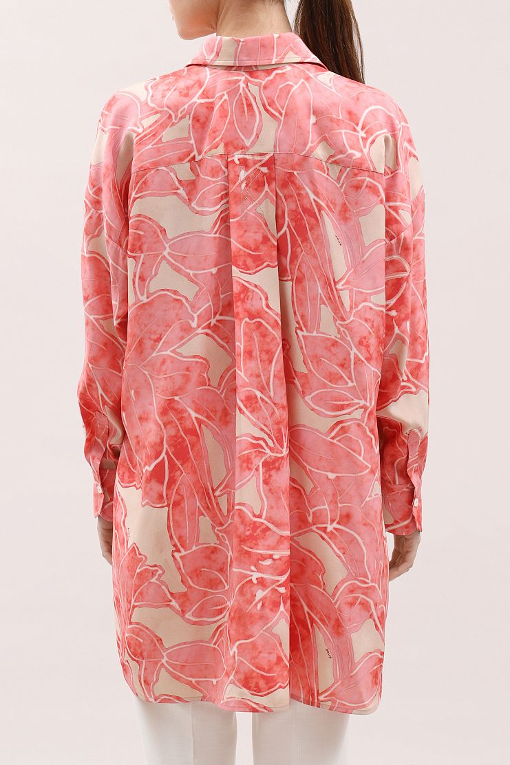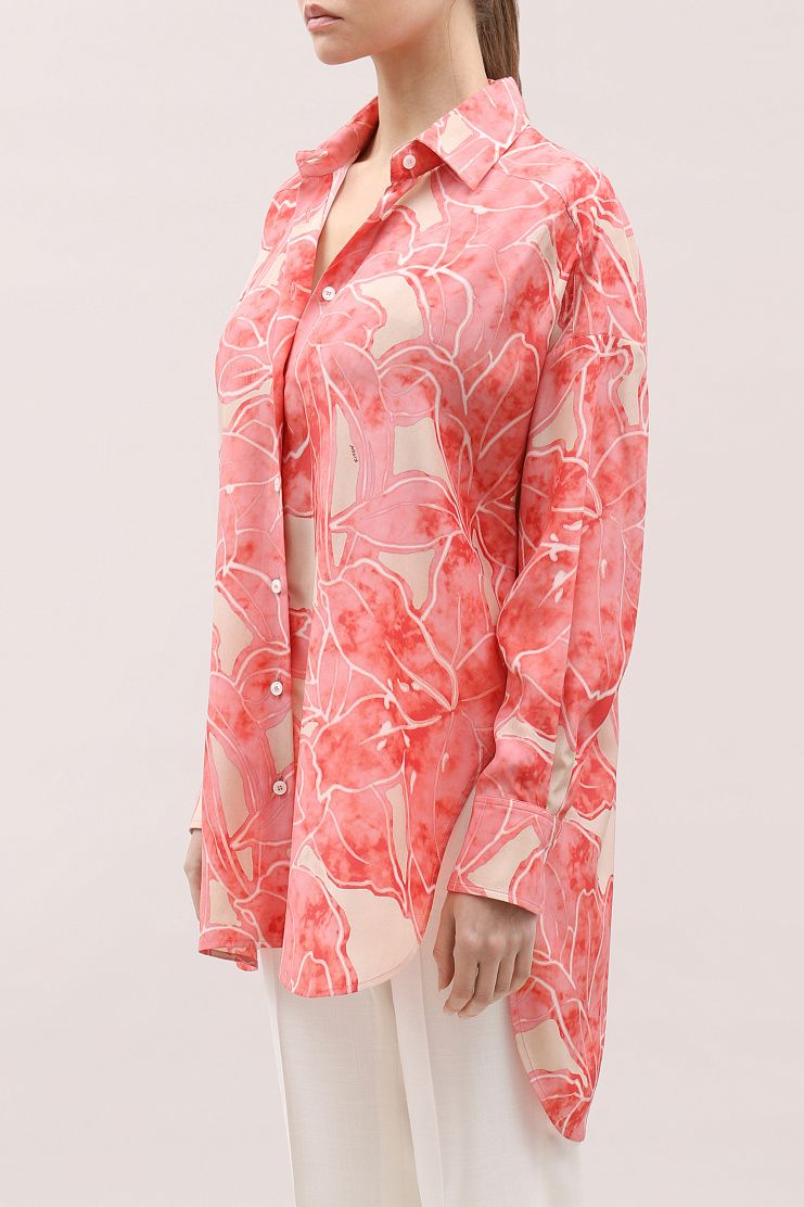 Блузу выполнили из струящегося шелка. Благодаря такому материалу изделие не потеряет безупречный вид со временем. Крупному цветочному принту придали винтажный вид с помощью неоднородного окрашивания. Яркая блуза будет отлично сочетаться со светлыми однотонными брюками или юбками.
