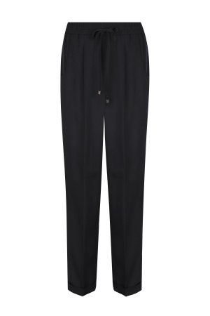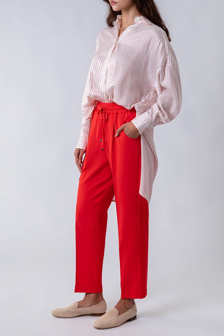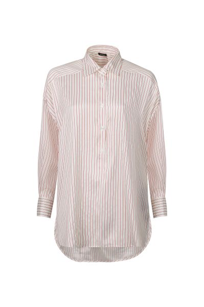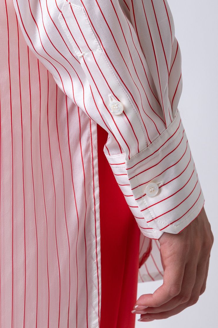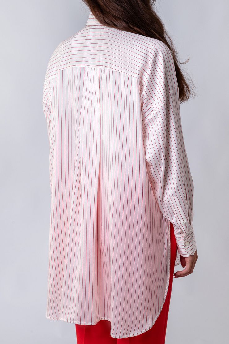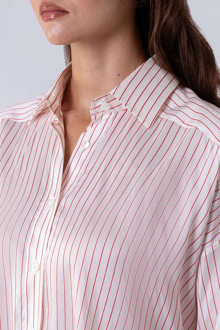 Блузу в полоску со спущенной линией плеча сшили из мягкого и гладкого шелка. Модель с отложным воротником и закругленным подолом дополнена короткой планкой на пуговицах.