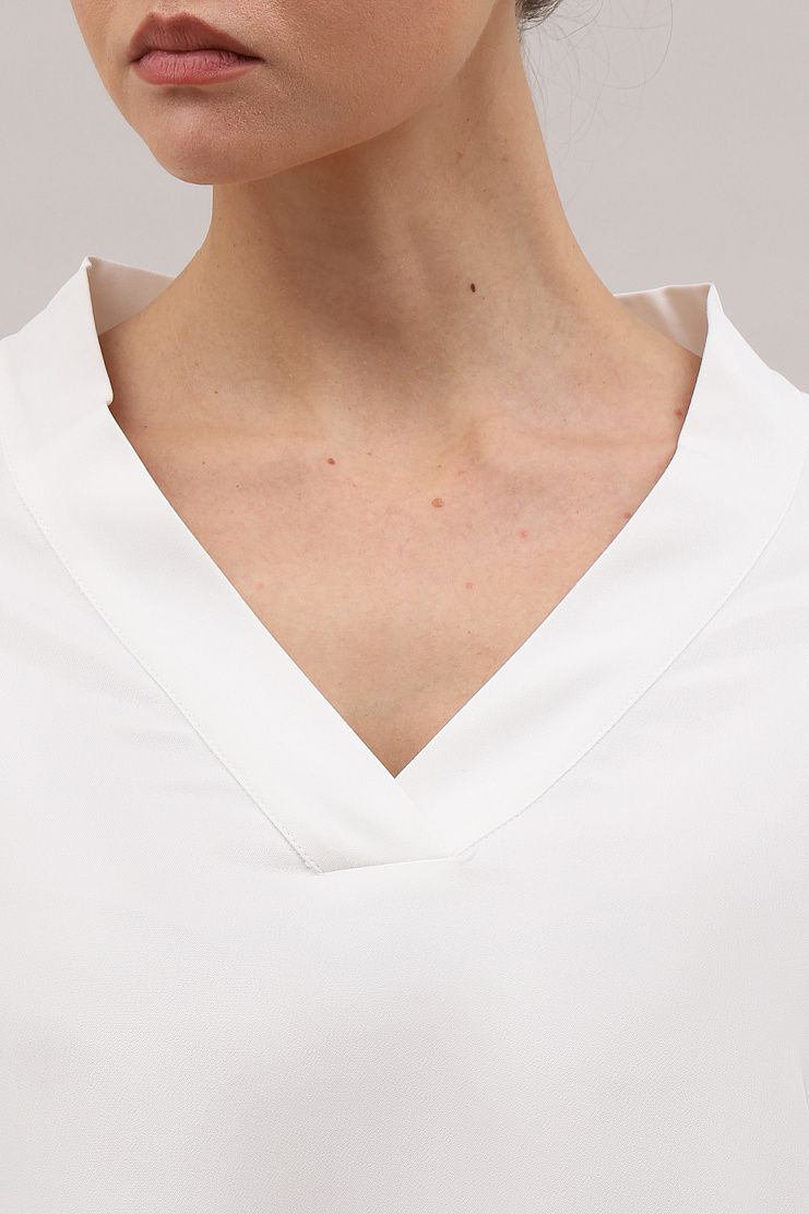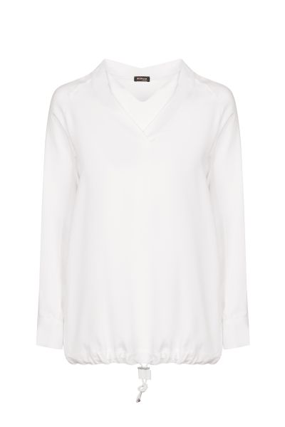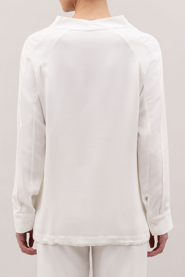 Блуза выполнена из легкой и одновременно прочной вискозы. Дополнена V-образным вырезом, широкими манжетами на пуговицах и кулиской по краю подола со шнурком. Задняя часть лаконично украшена декоративными швами.