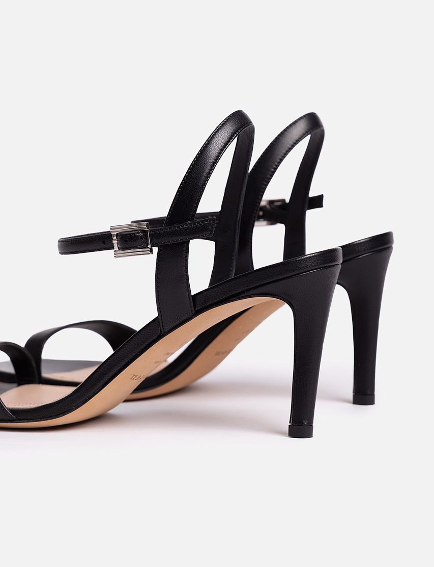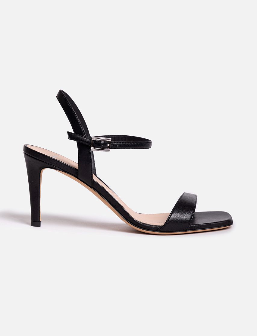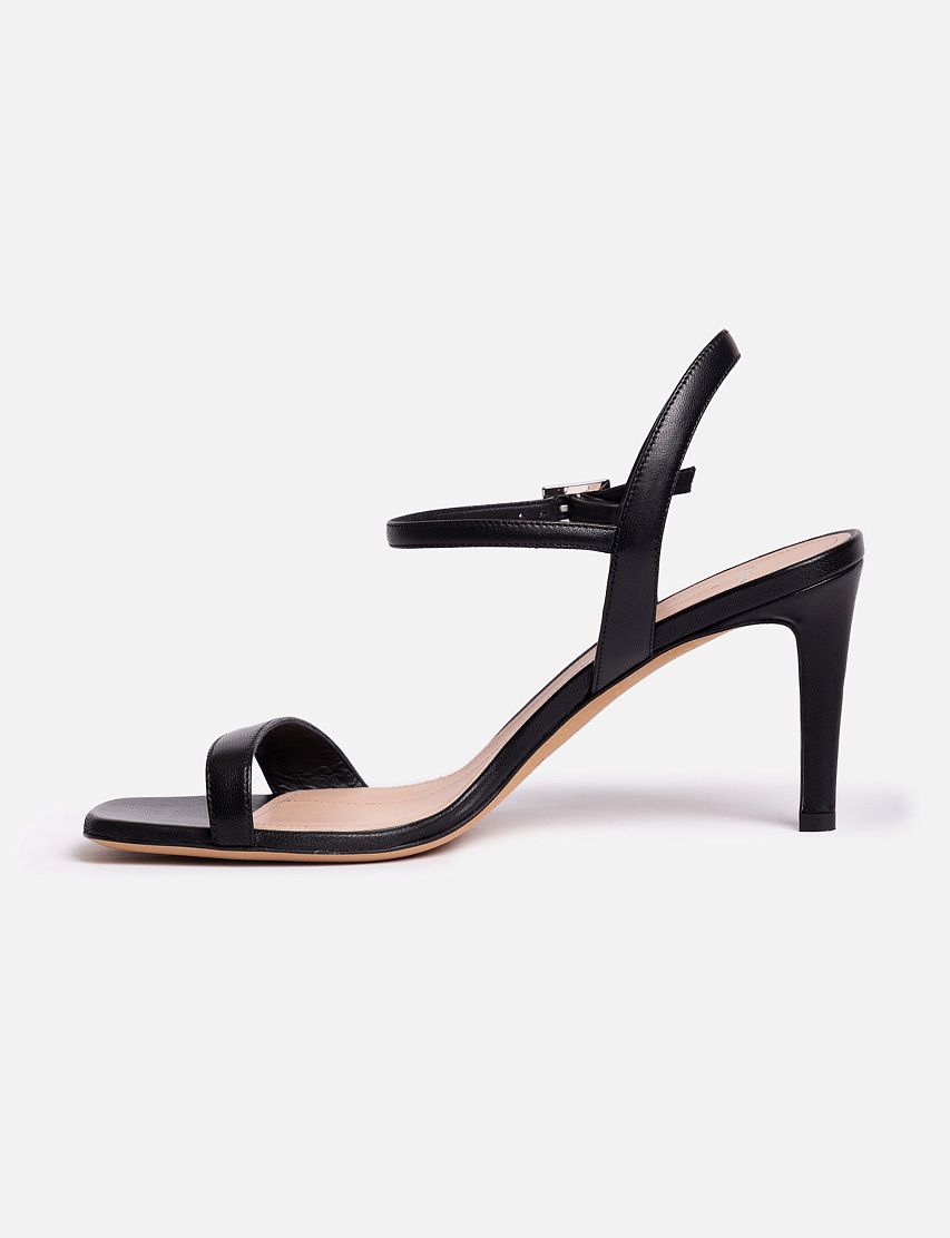 Босоножки с квадратным мысом выполнены из матовой кожи. Пара с тонкой перемычкой и обтяжным каблуком средней высоты застегивается при помощи регулируемого ремешка на щиколотке.