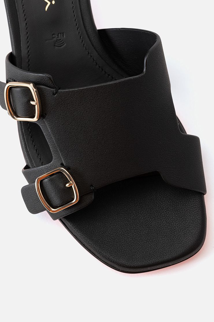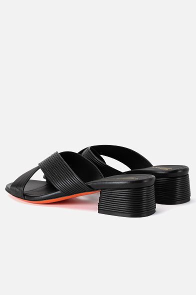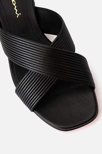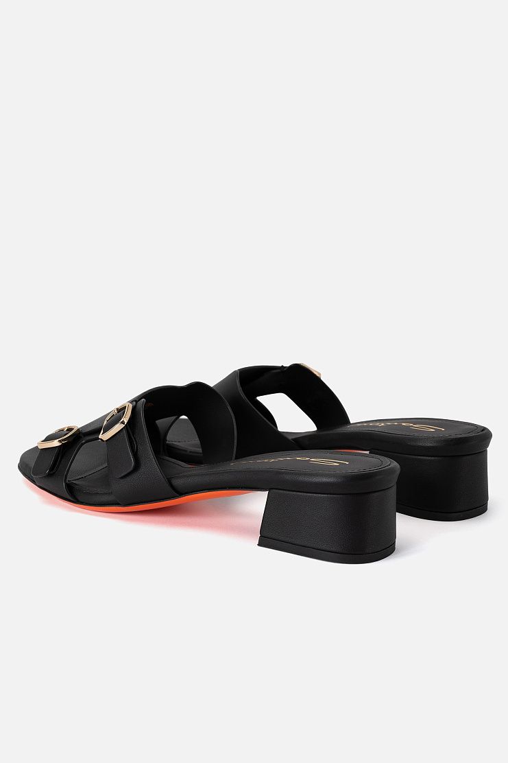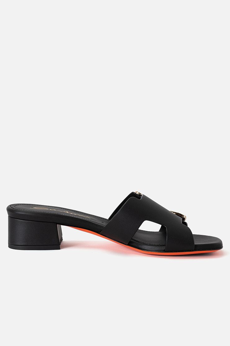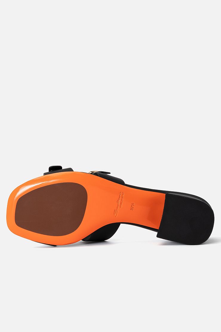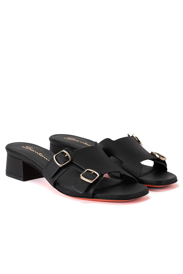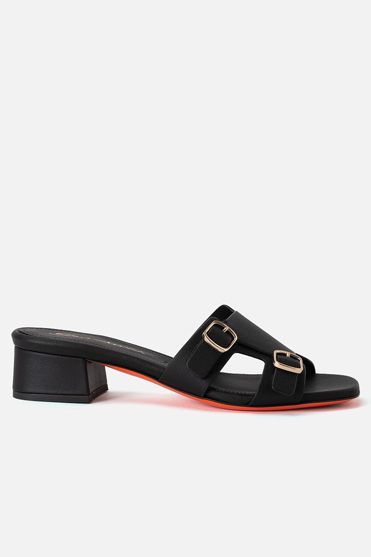 Босоножки с открытым мысом на небольшом устойчивом каблуке изготовили из гладкой кожи. Модель дополнена перемычкой с двумя регулируемыми ремешками и золотистыми пряжками. Подошва изделия окрашена в яркий фирменный оттенок Santoni.