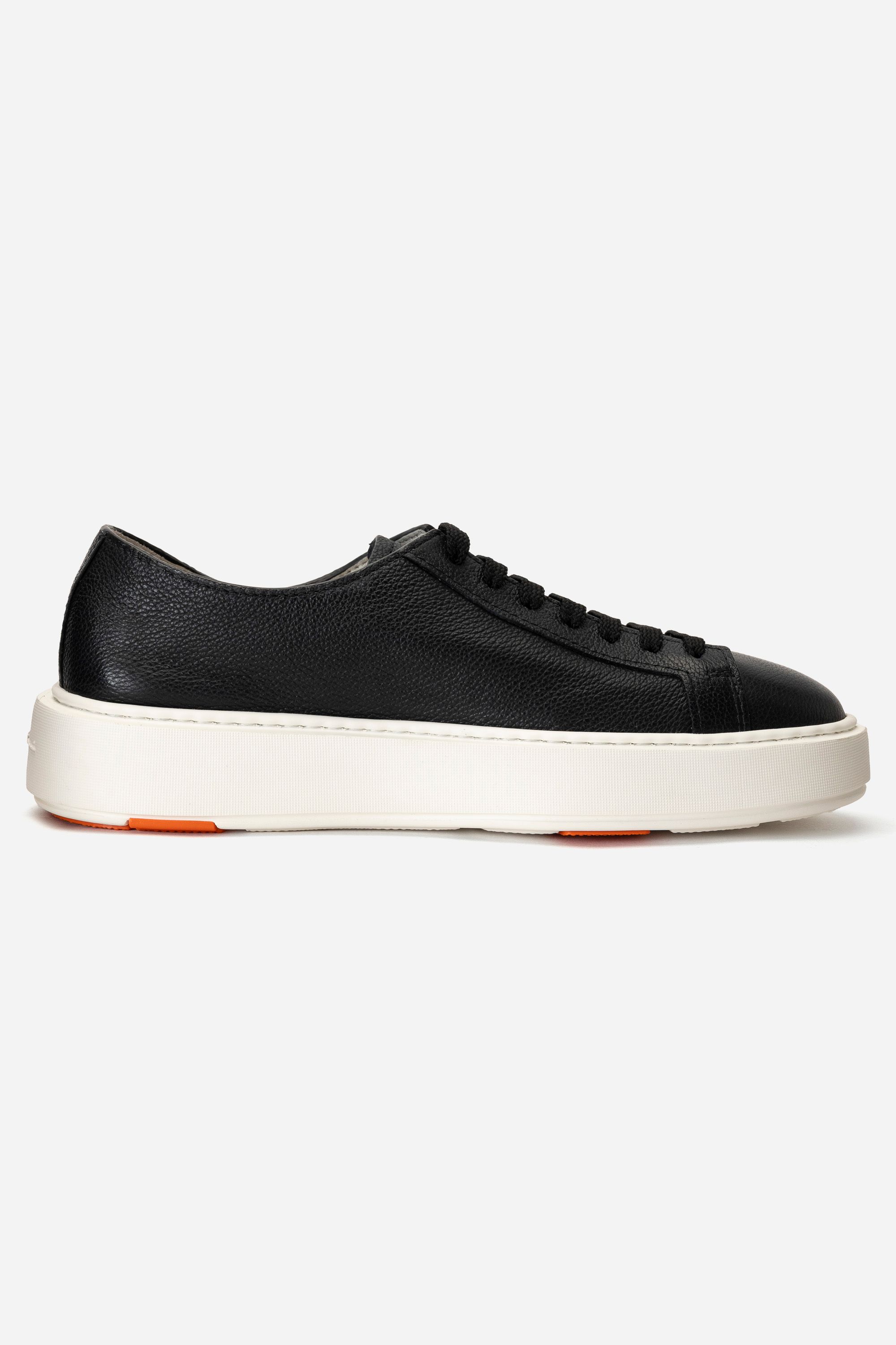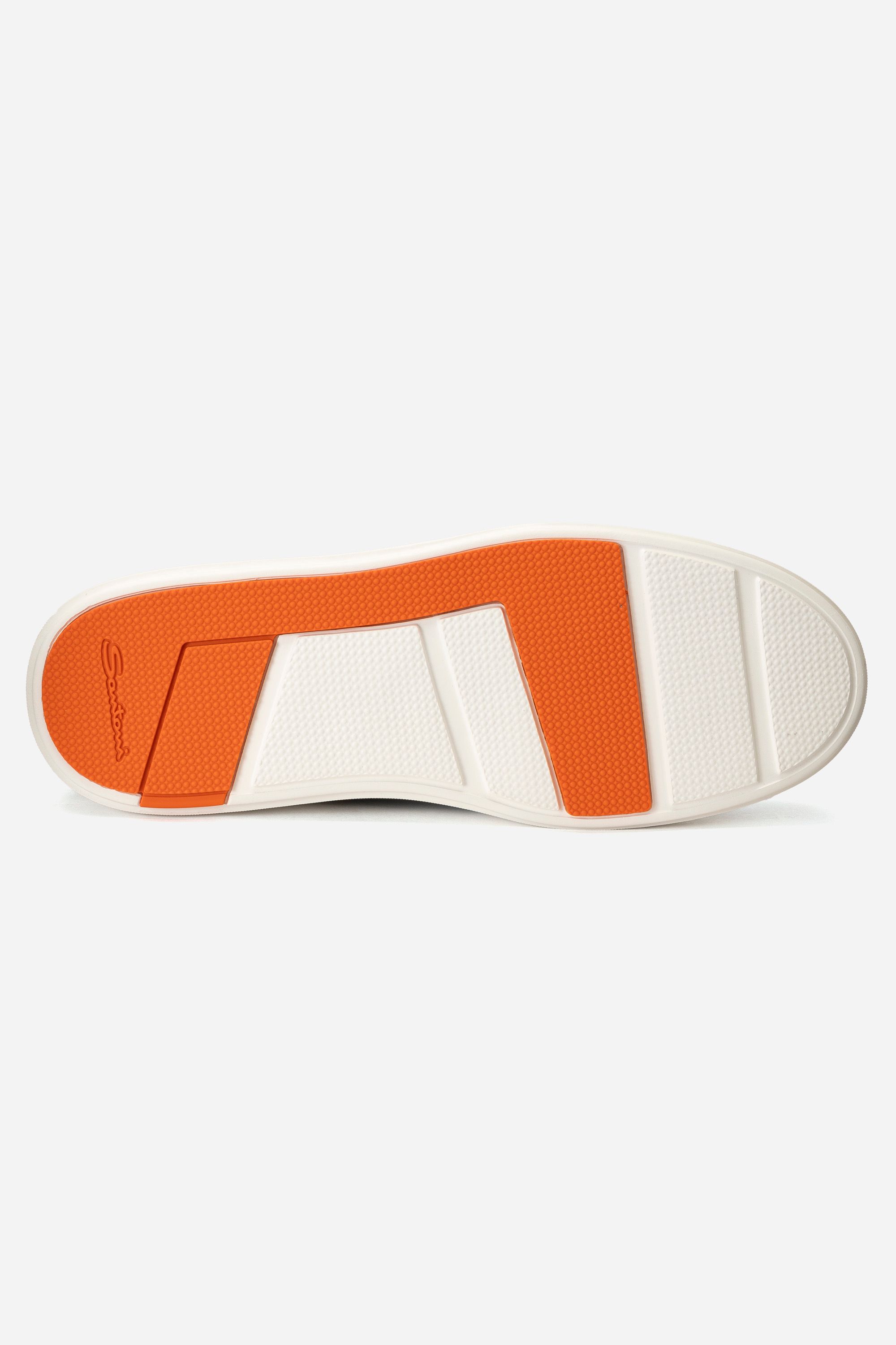Босоножки на устойчивом блочном каблуке изготовили из узких кожаных шнуров. Модель дополнена ремешками, которые обвивают щиколотку и застегиваются с помощью пряжек. Узнаваемый элемент декора Santoni — подошва фирменного оранжевого оттенка.