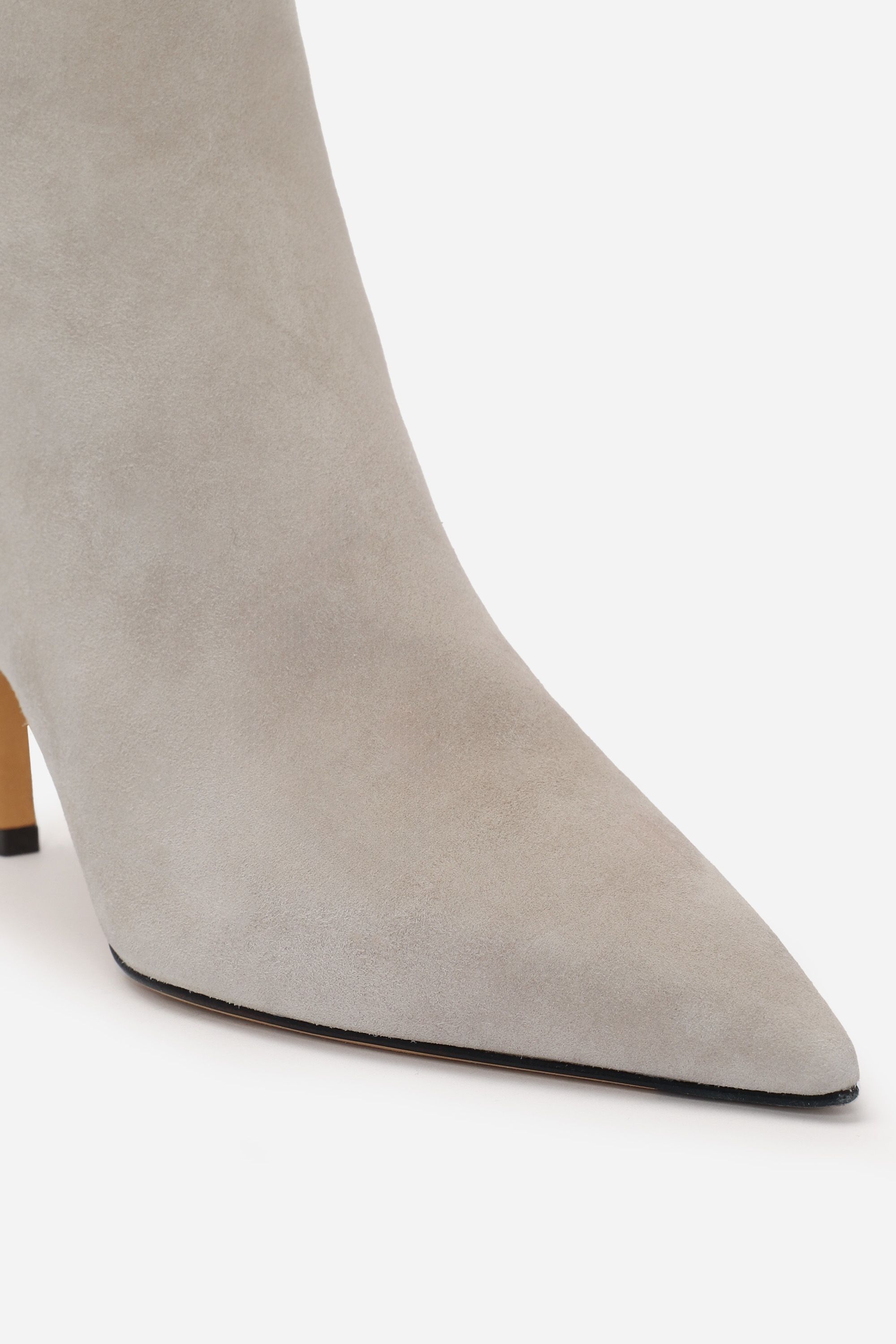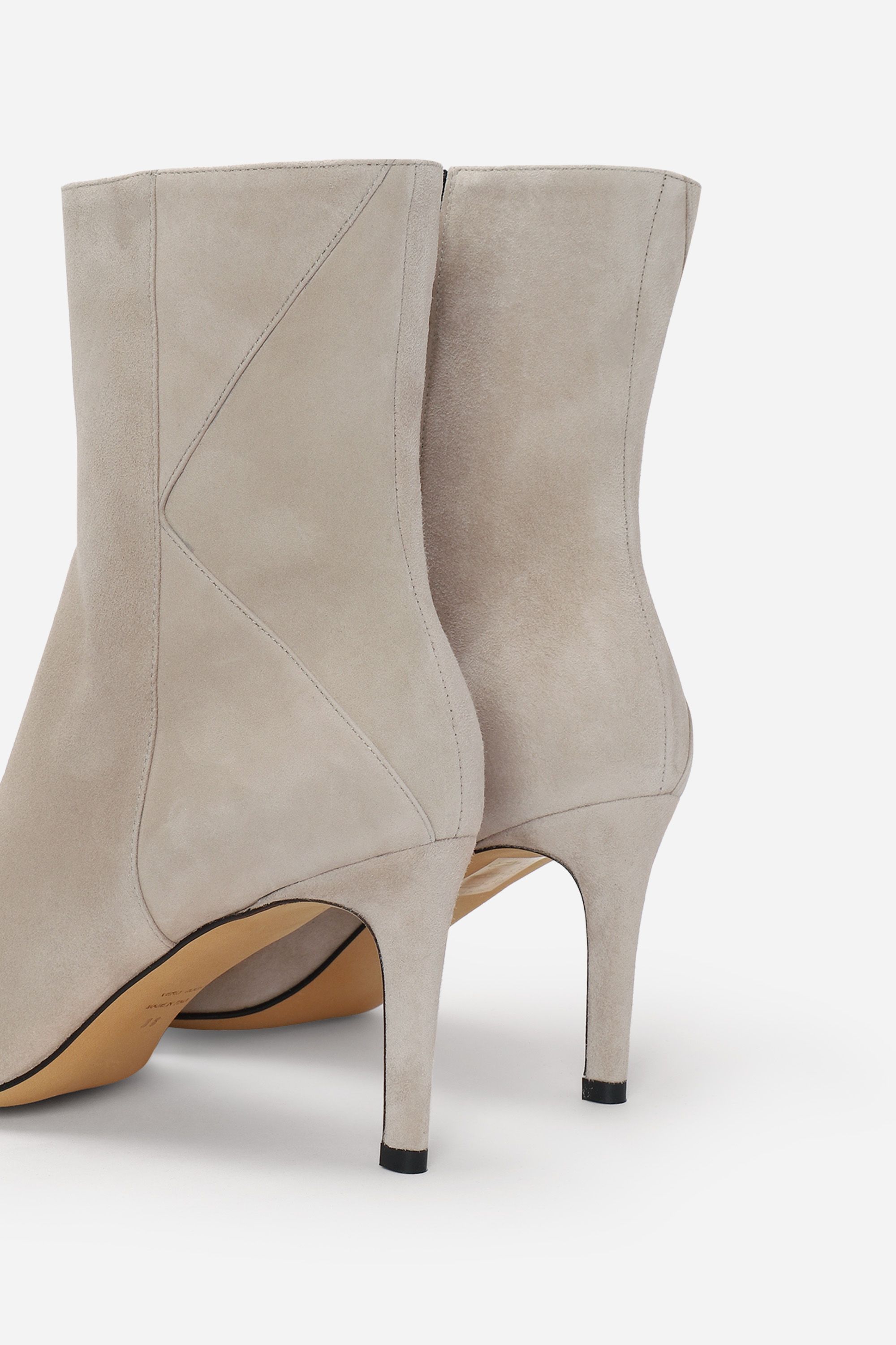 Ботильоны с зауженным мысом и каблуке-шпильке изготовили из мягкой и пластичной замши. Модель застегивается на короткую боковую молнию. Швы с внешней стороны образуют литеру K — фирменный логотип марки. Лаконичная пара органично дополнит повседневный образ.