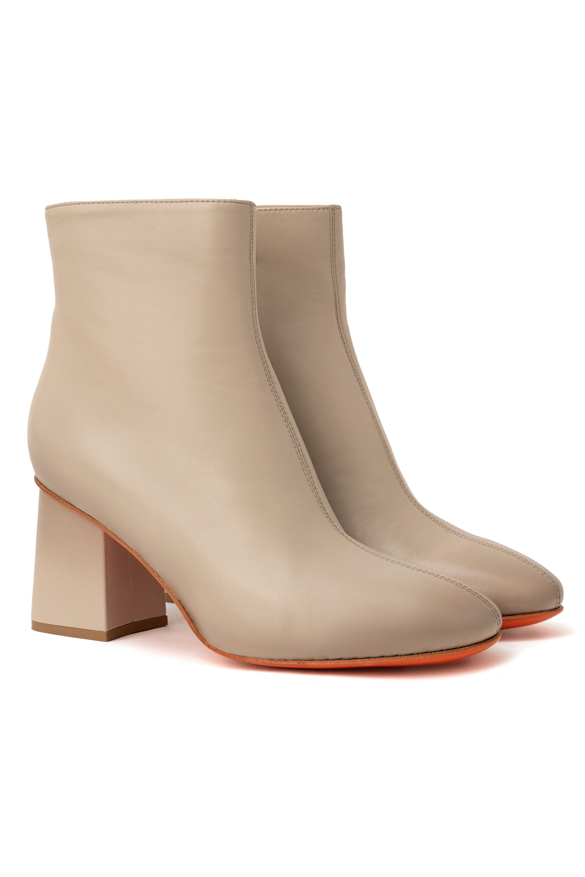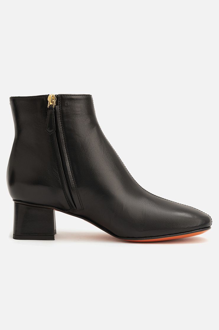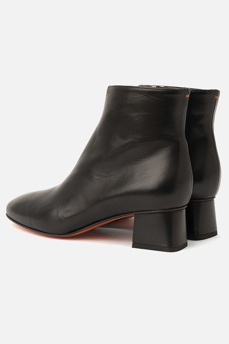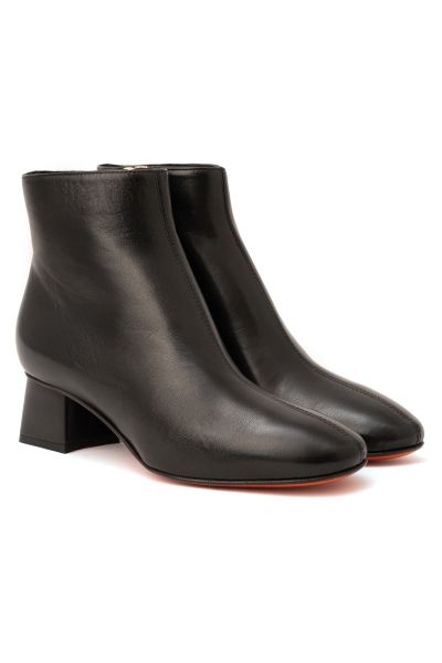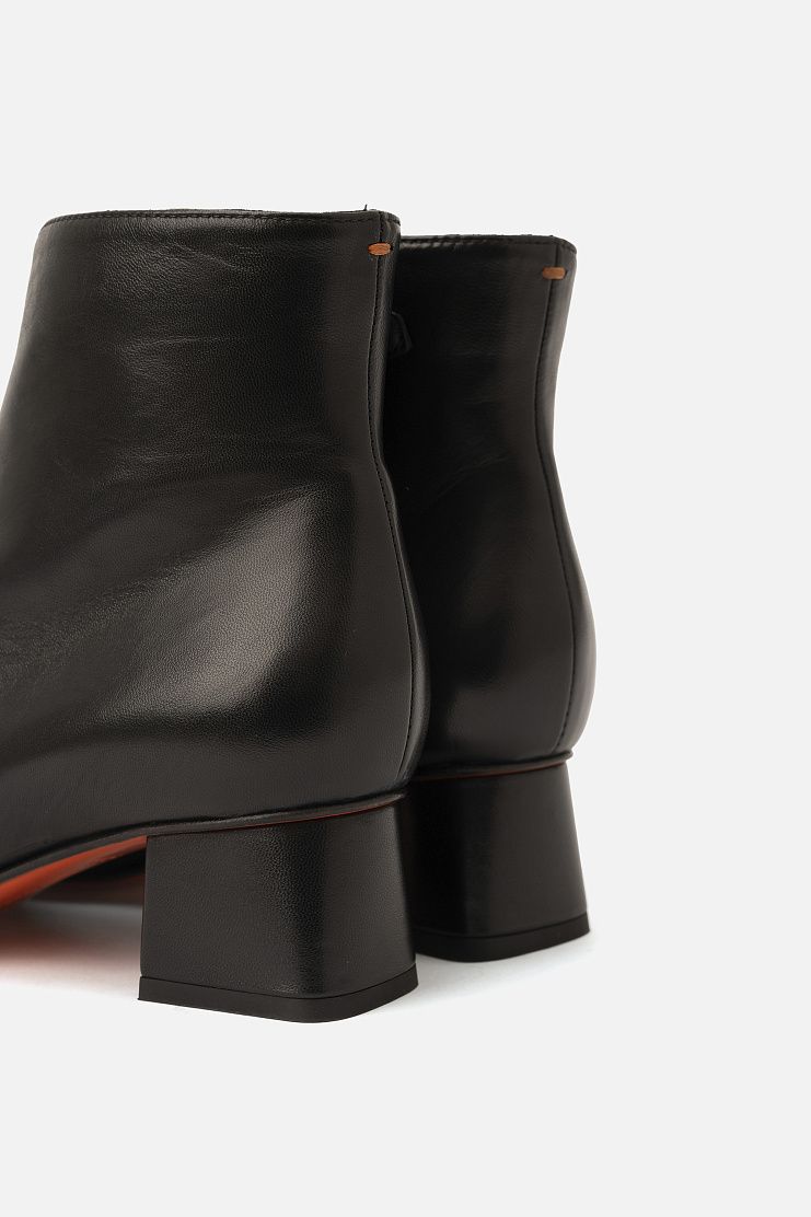 Ботильоны на каблуке средней высоты изготовили из гладкой отполированной кожи. Пара с миндалевидным мысом дополнена подошвой яркого фирменного оттенка Arancio Santoni и застегивается на молнию сбоку.
