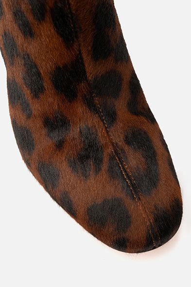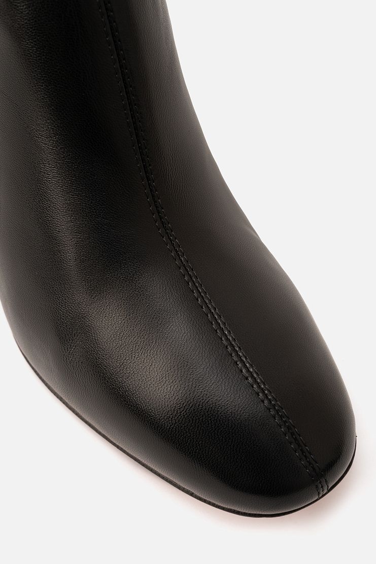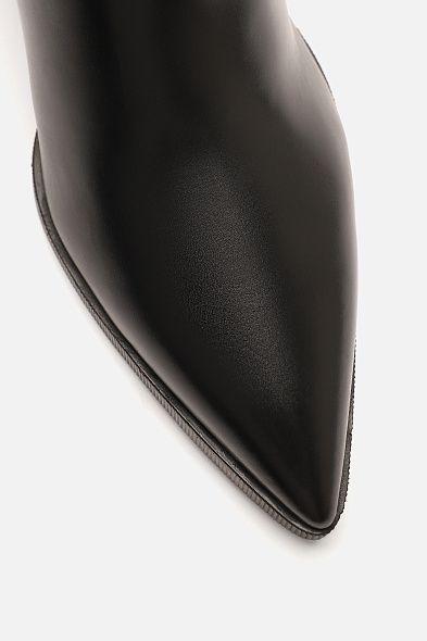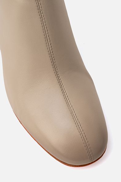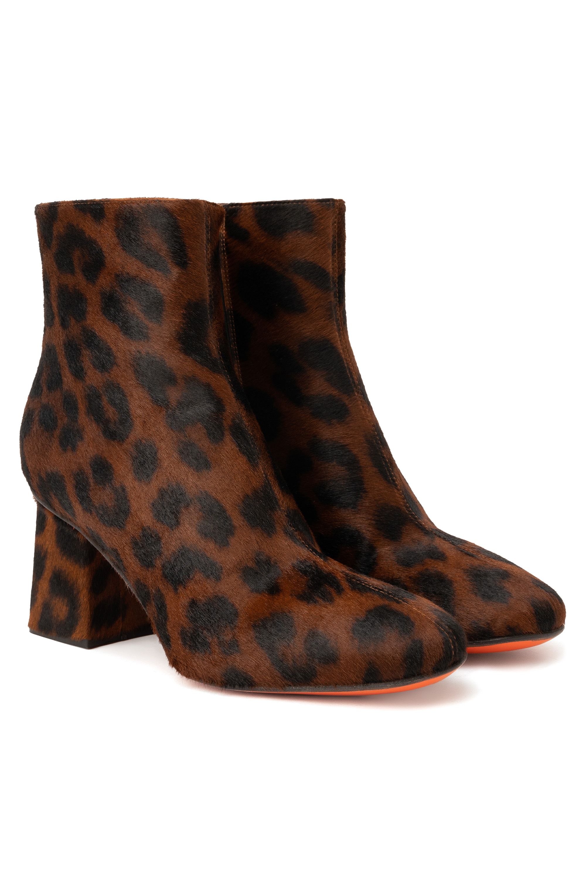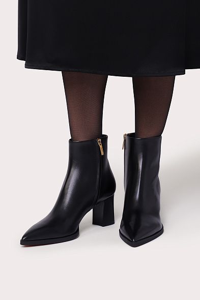 Ботильоны на каблуке средней высоты изготовили из гладкой отполированной кожи. Пара с миндалевидным мысом дополнена подошвой яркого фирменного оттенка Arancio Santoni и застегивается на молнию сбоку.