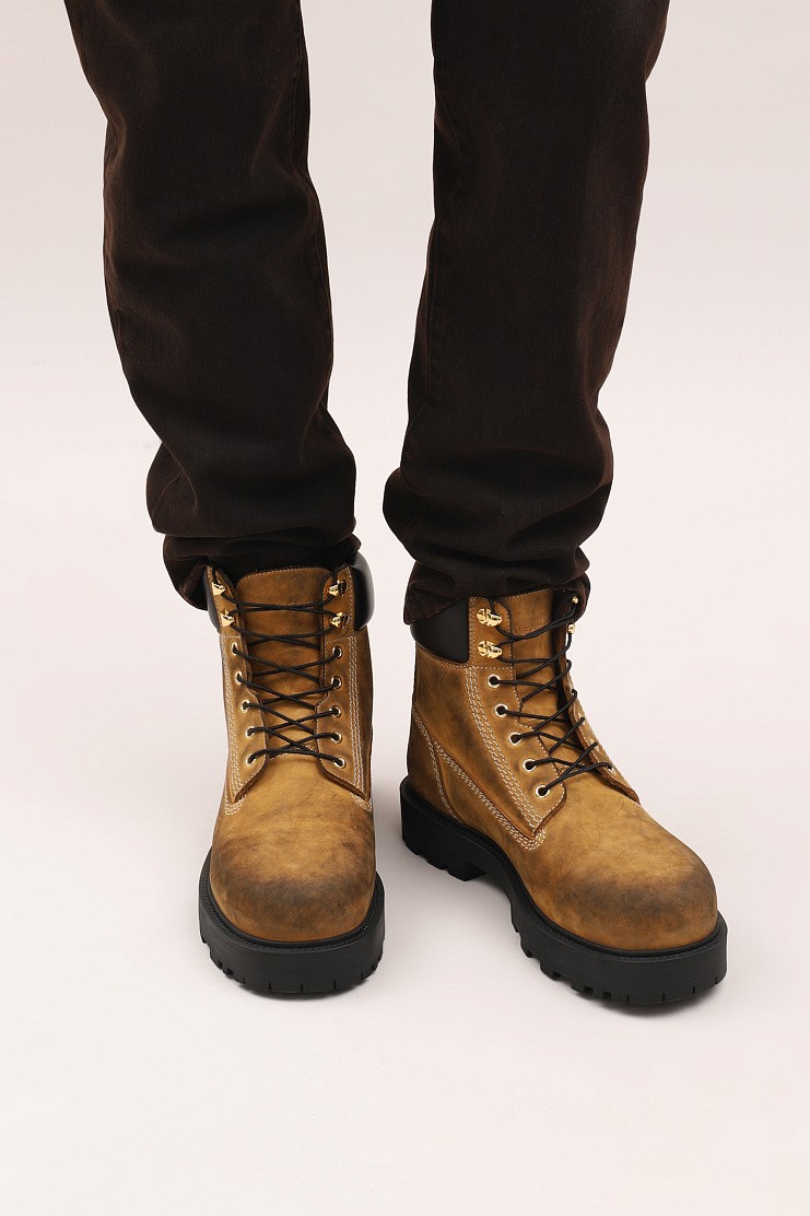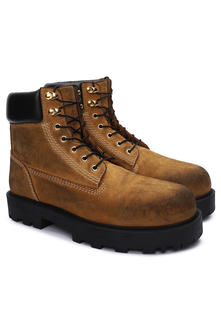 Ботинки выполнены из натуральной телячьей кожи. Дополнены высокой резиновой подошвой, которая не позволит промокнуть или поскользнуться в дождливую погоду. Верхняя мягкая вставка будет плотно облегать щиколотку и защитит ее от холодного ветра. Логотип на задней части создает фирменный акцент.