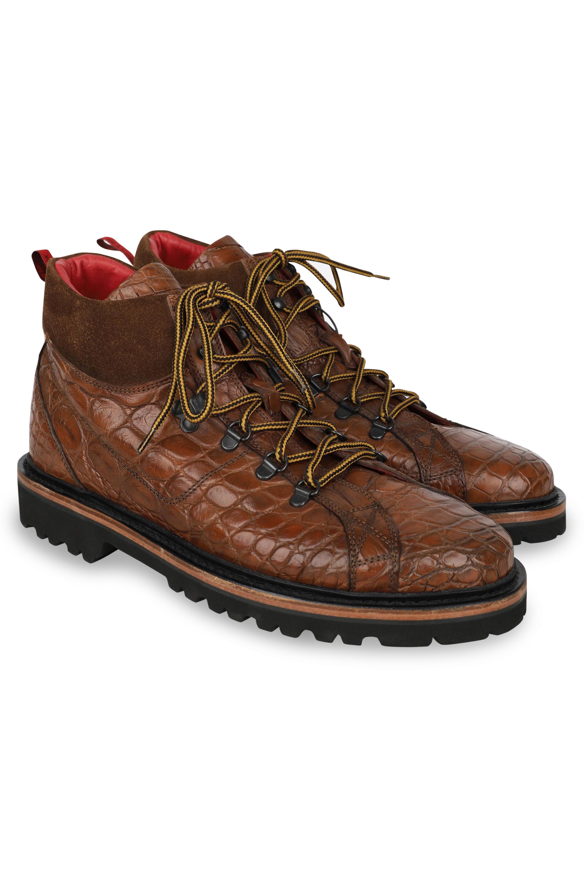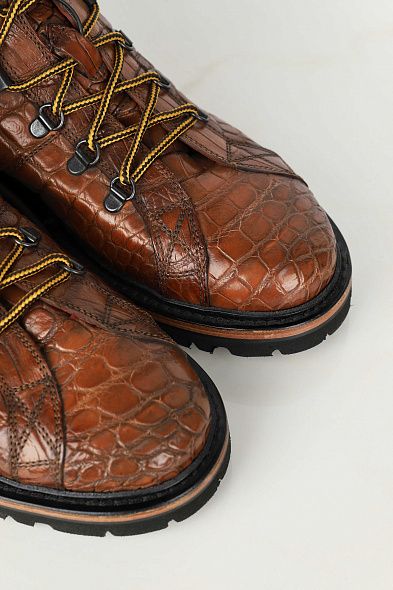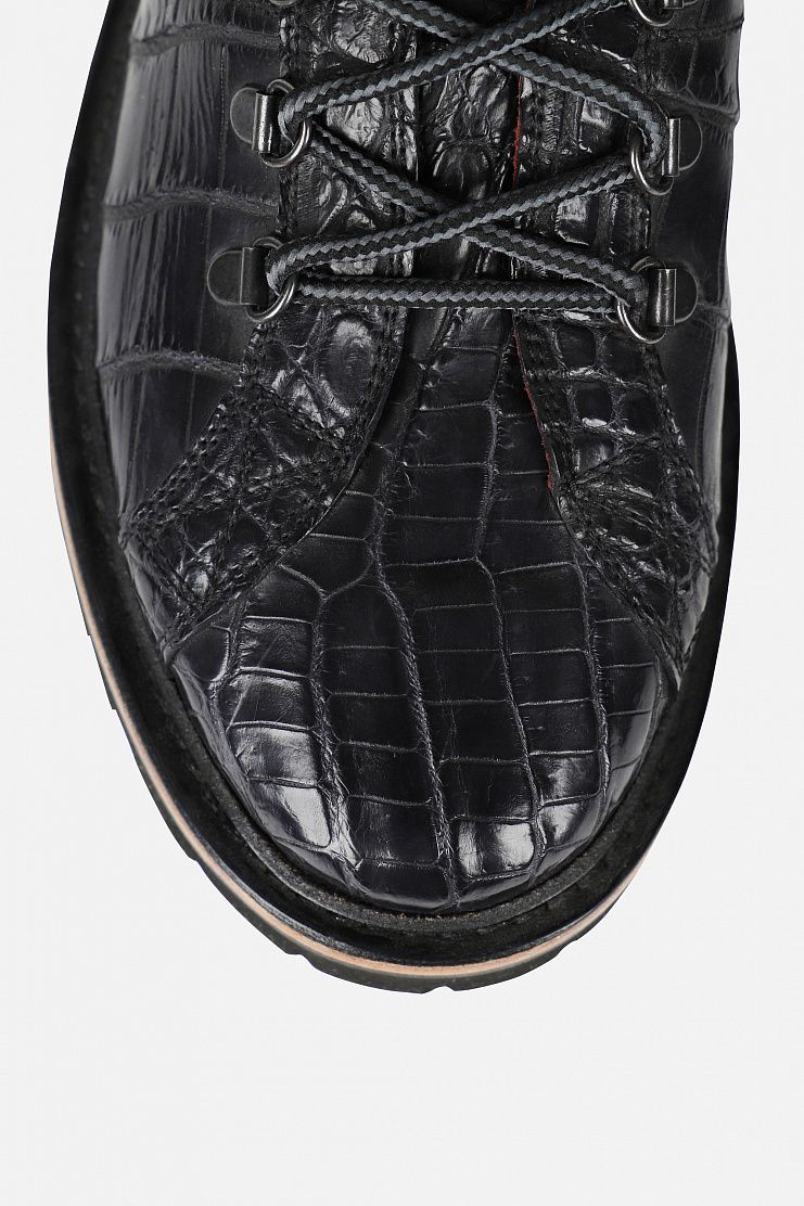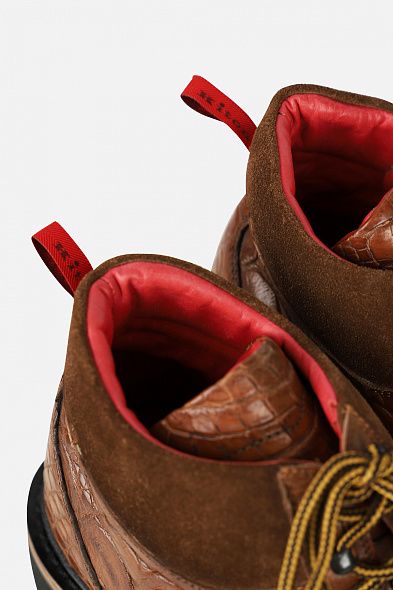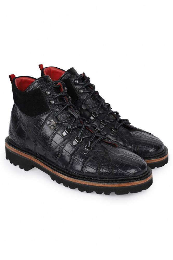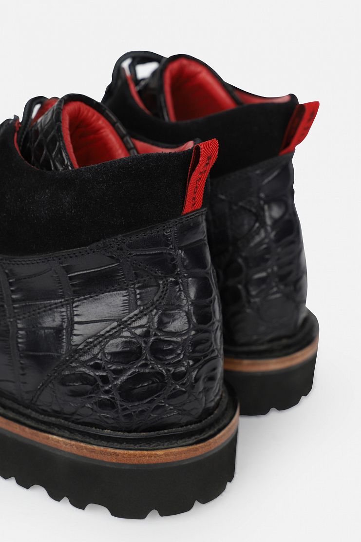 Высокие ботинки из кожи крокодила с замшевой вставкой в области щиколотки. Модель выполнена на кожаной подкладке, со шнуровкой на металлических петлях и крючках, на подошве с протекторами и каблуке.