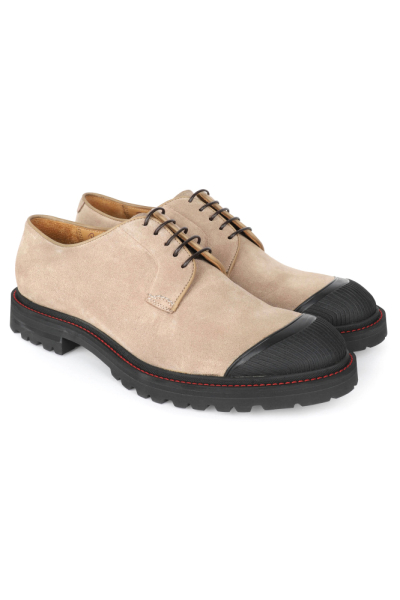 Ботинки из замши с контрастными резиновыми носами и красной строчкой. Модель с кожаной подкладкой, на протекторной подошве и каблуке.
