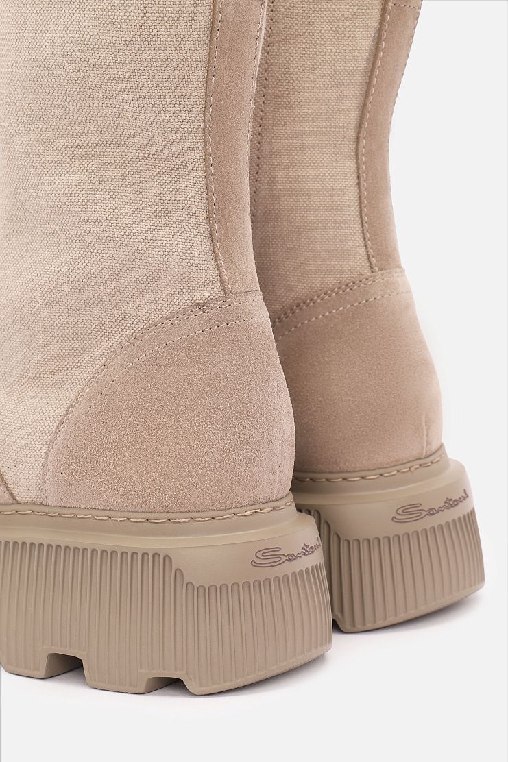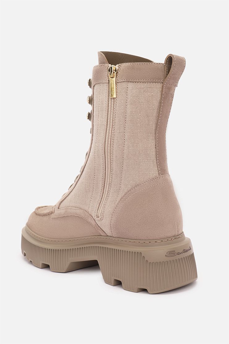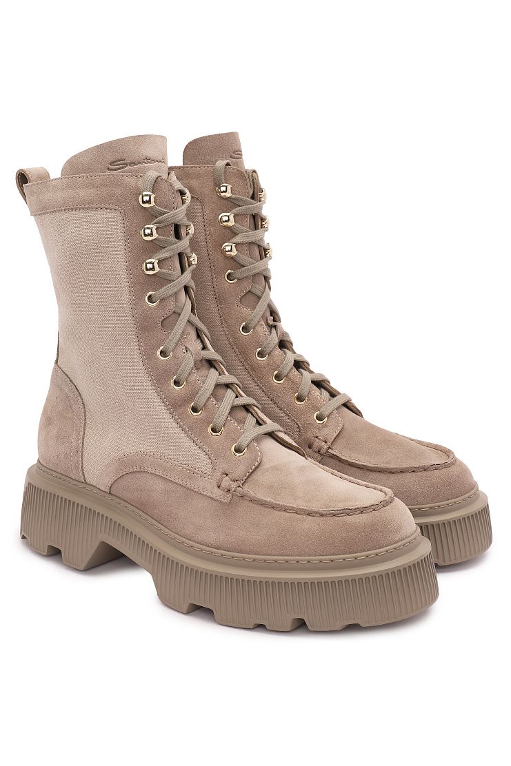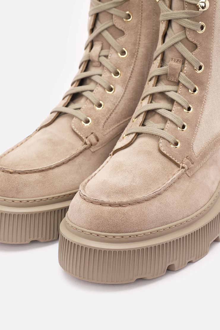 Высокие ботинки на массивной рельефной подошве сочетают в себе стиль и практичность. Модель выполнена из сочетания замши и боковых текстильных вставок. Шнуровка позволяет регулировать плотность посадки. Массивная подошва гарантирует устойчивость и защиту от влаги, делая пару идеальной для осенне-зимнего сезона.