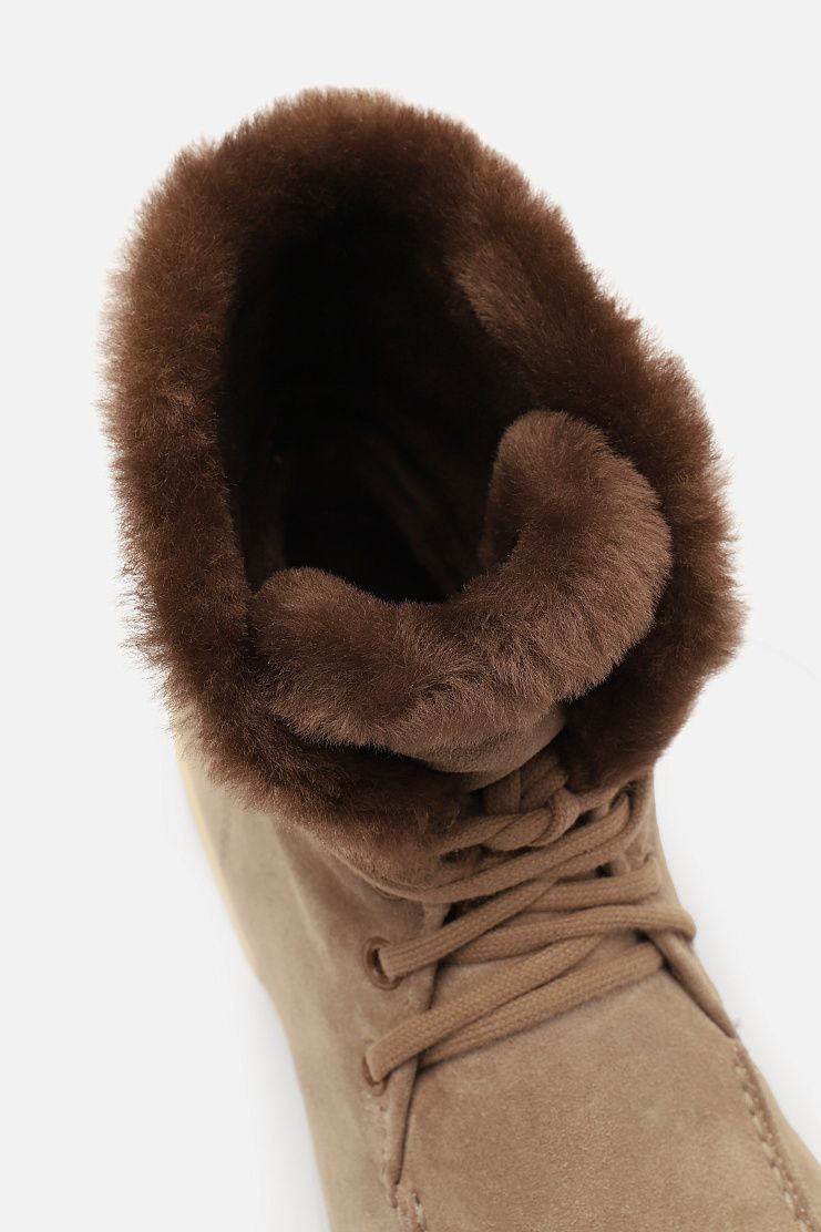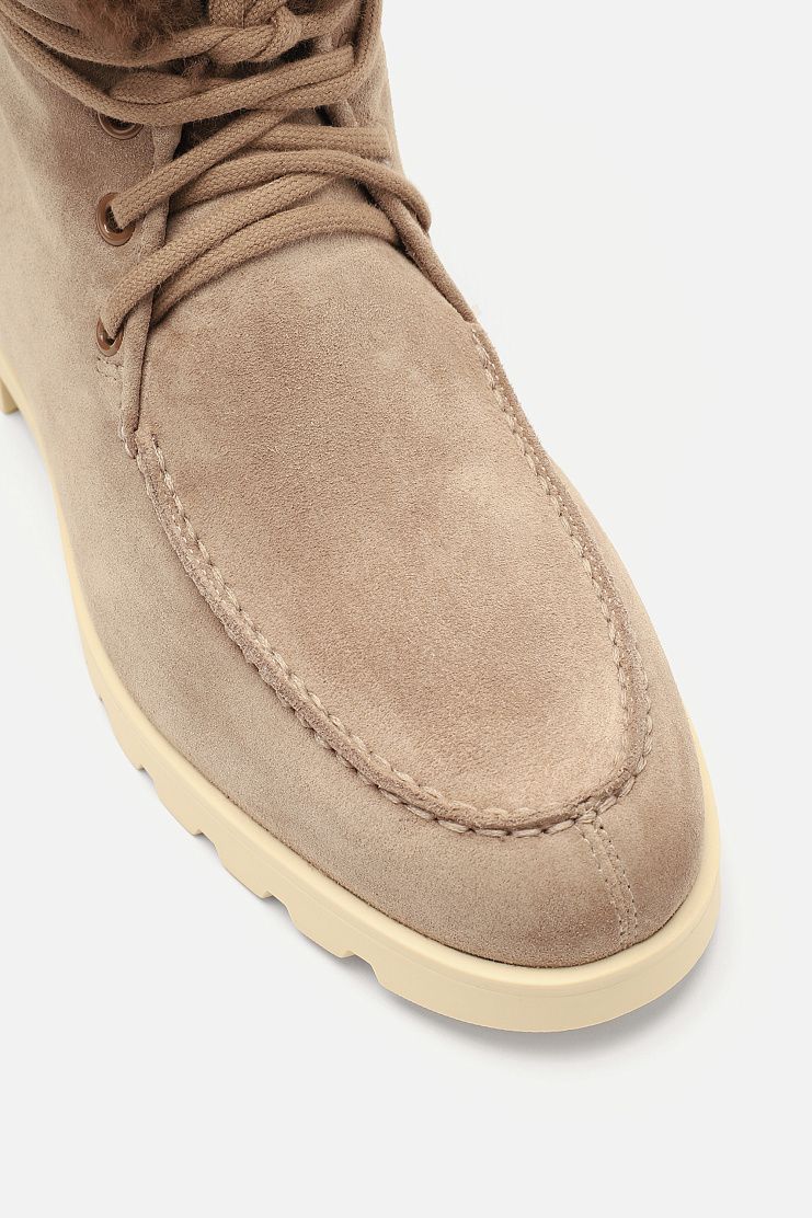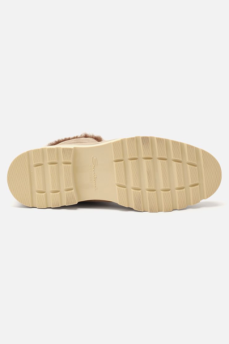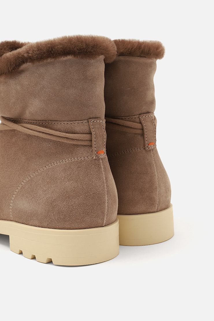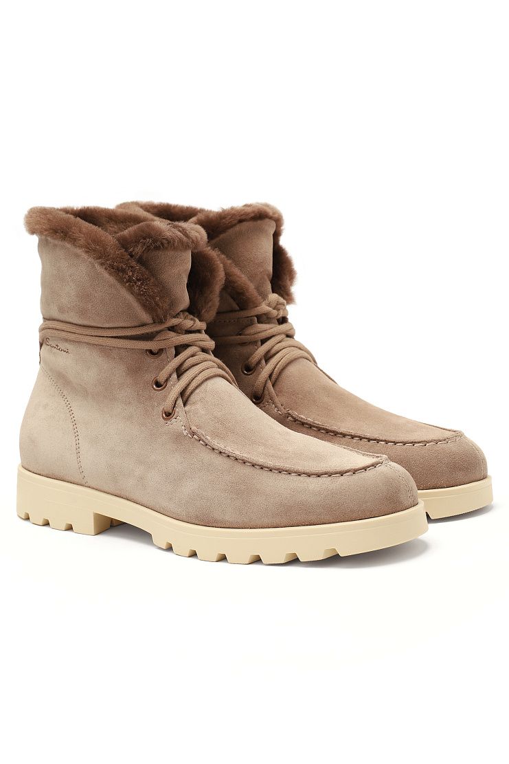 Высокие ботинки с рельефным швом на мысе выполнили из пластичной замши, дополнив внутренней отделкой из мягкой овчины с густым ворсом. Модель на резиновой подошве с протектором дополнена удлиненной шнуровкой, которую можно обвязать вокруг голенища и пропустить сквозь петлю со стежком фирменного оттенка Arancio Santoni.