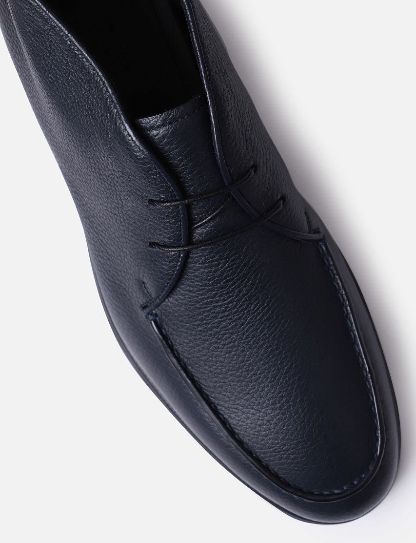 Ботинки с рельефным швом на мысе выполнили из зернистой оленьей кожи. Пару на шнуровке дополнили широкой подошвой с тисненым логотипом. Для того, чтобы дезерты было удобно снимать и надевать предусмотрели петлю на заднике.