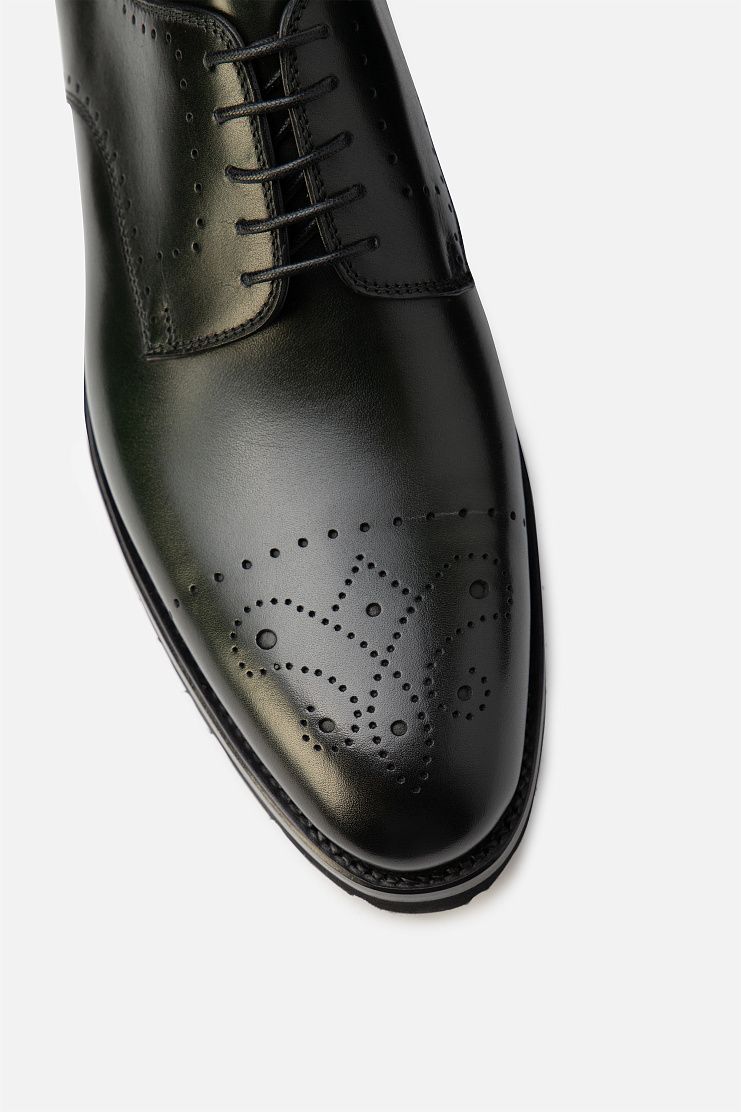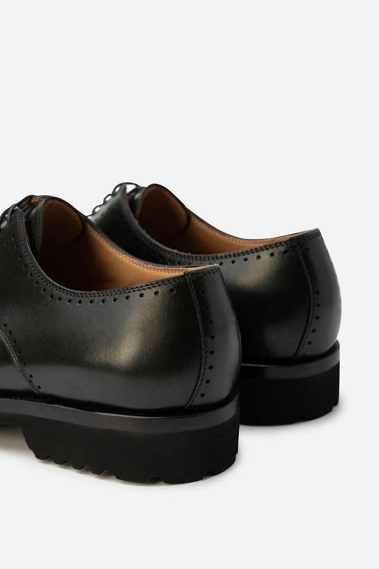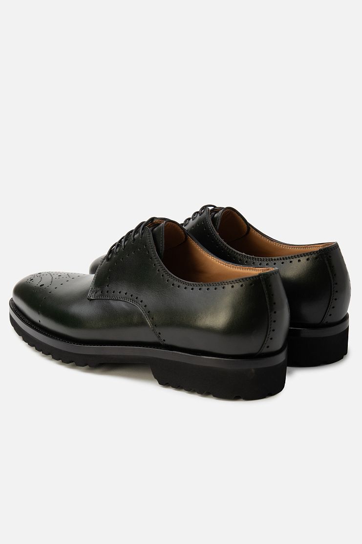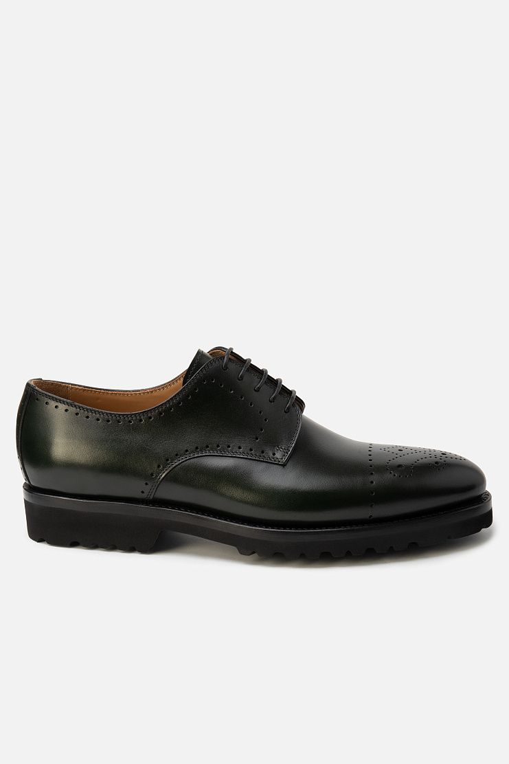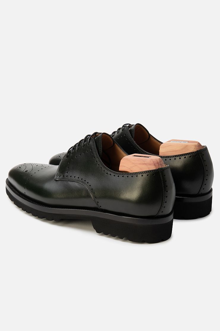 Кожаные ботинки с брогированием подойдут и для офиса, и для менее формальной обстановки. Модель с открытой шнуровкой дополнена широкой протекторной подошвой. В комплекте — колодки для хранения, дополнительные шнурки и крем для обуви.