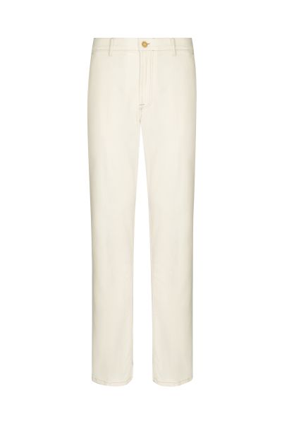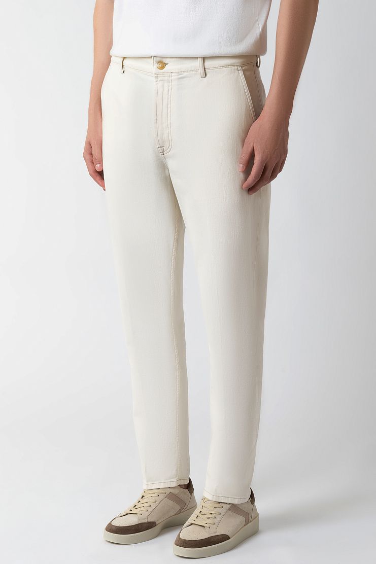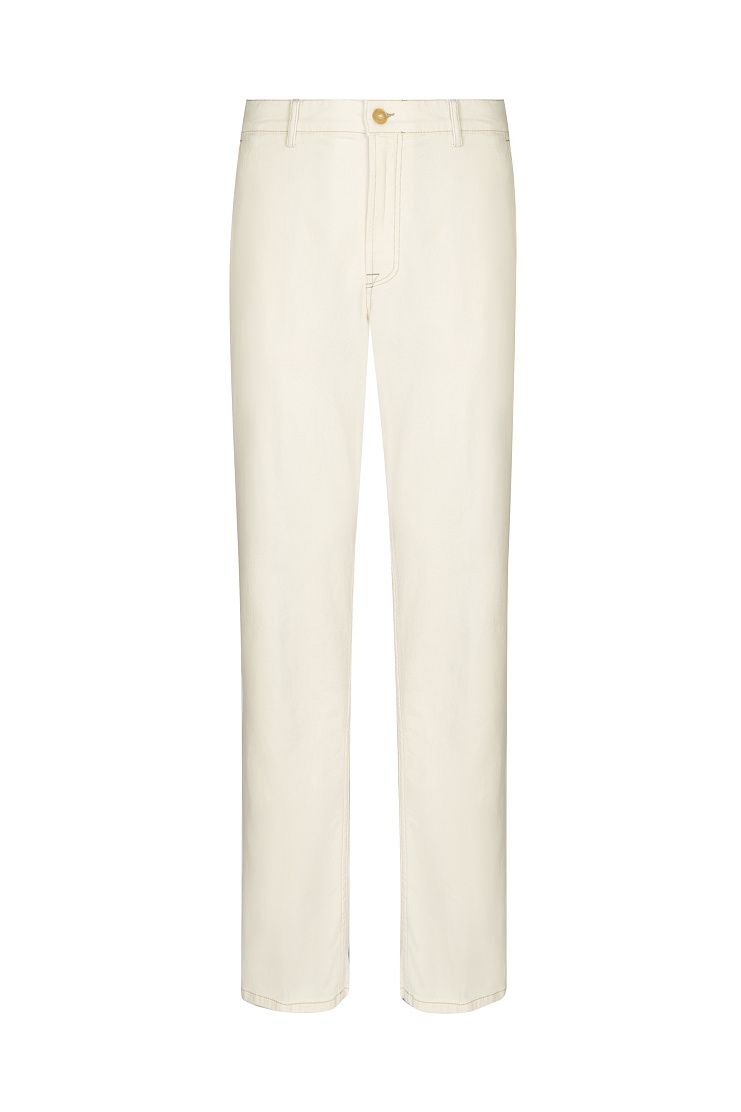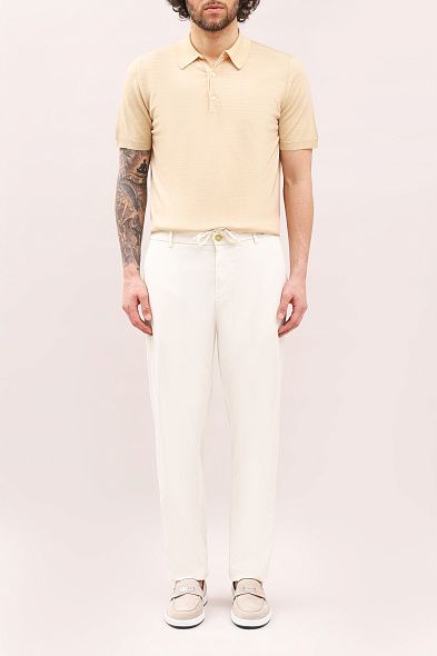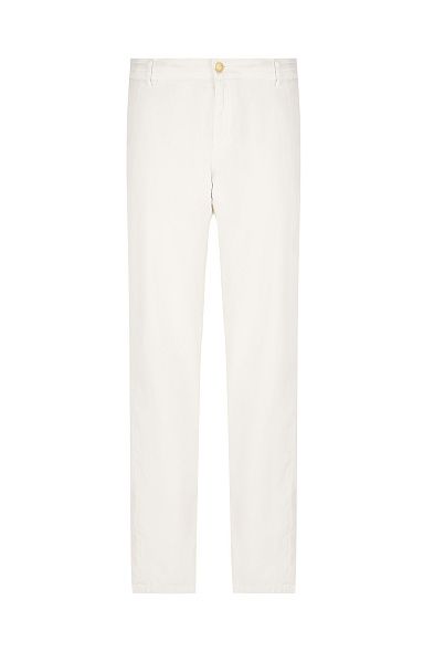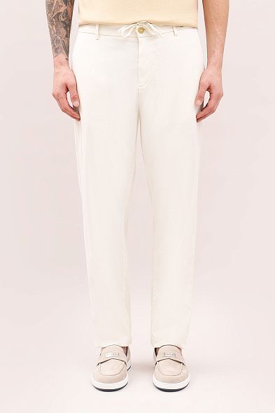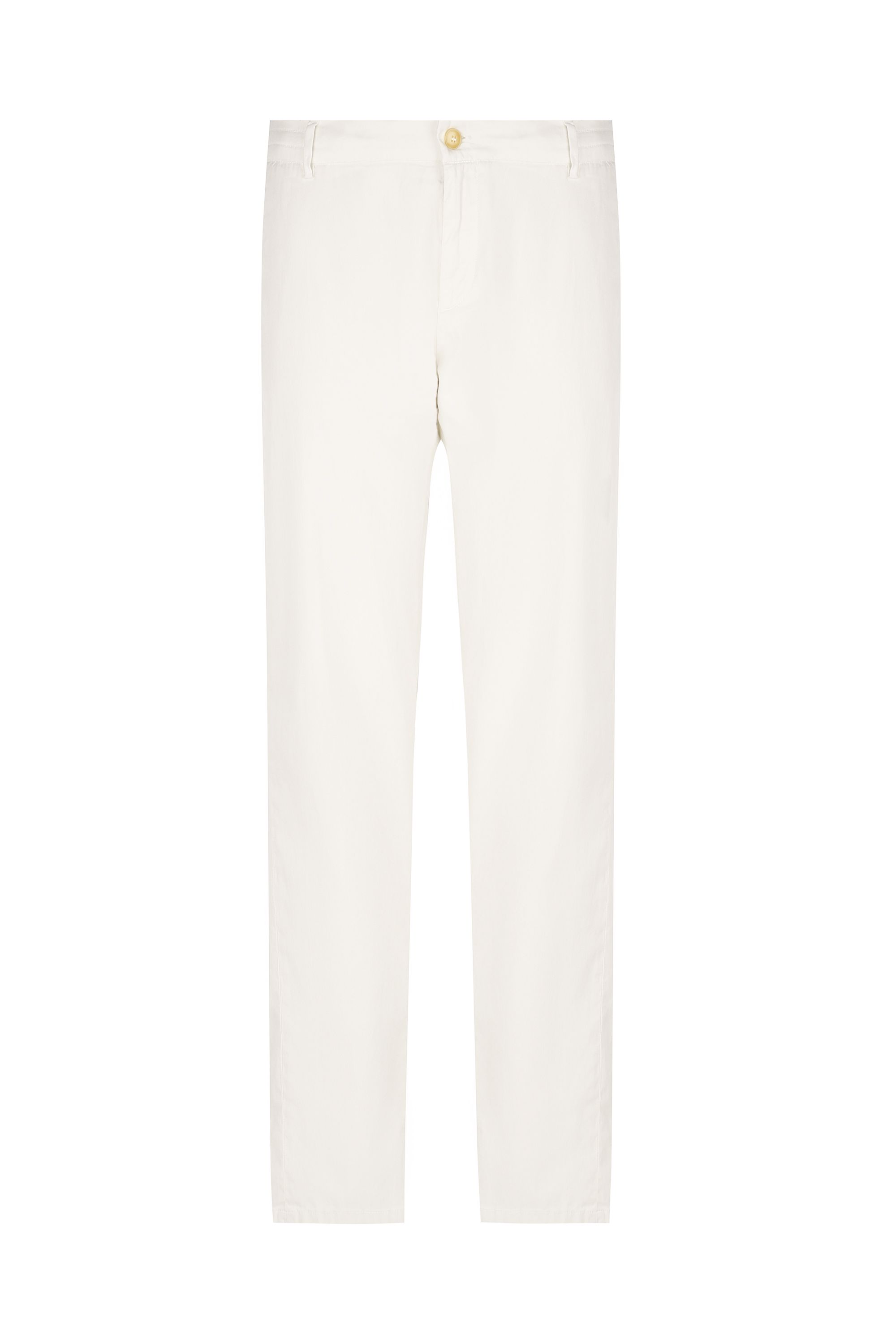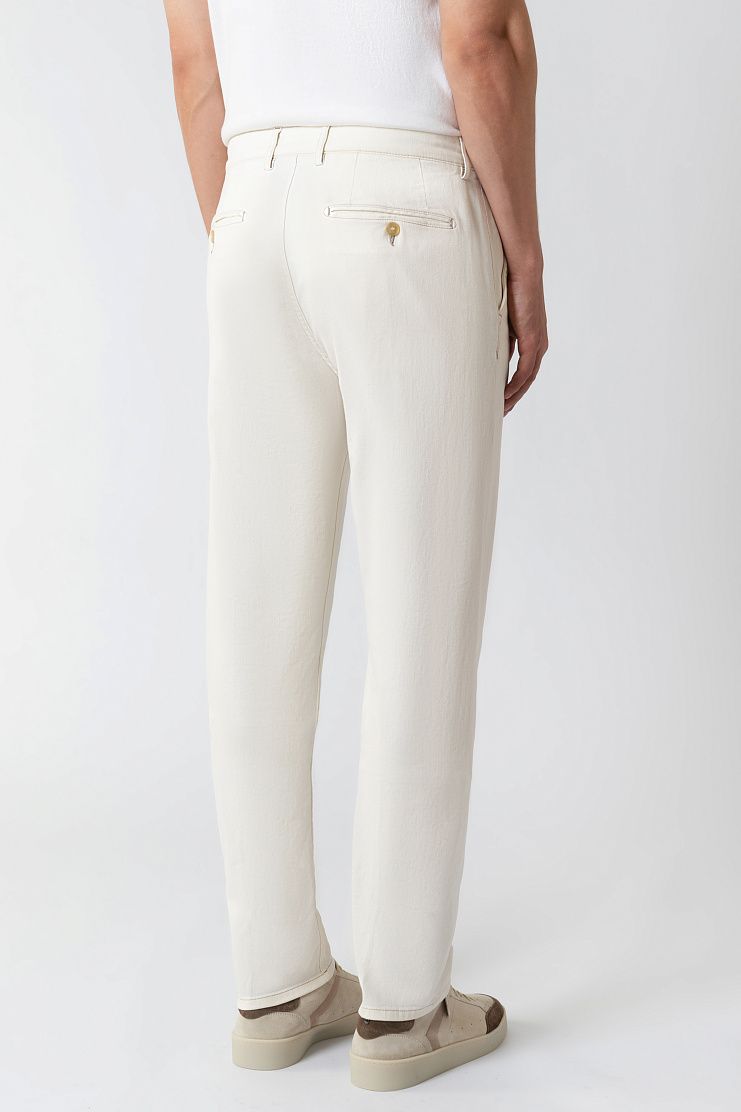 Брюки прямого кроя сшили из микса хлопка, лиоцелла и льна. Благодаря такой мягкой и дышащей ткани в них будет комфортно в течение дня. Модель с боковыми и задними карманами застегивается на застежку и металлическую пуговицу.