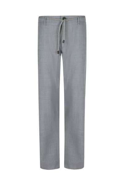 Брюки серого цвета из ткани с клетчатой фактурой и замшевой отделкой на задних карманах идеально подойдут для повседневного изысканного образа. Модель свободного кроя с поясом на кулиске и застежкой на молнию и пуговицу.
