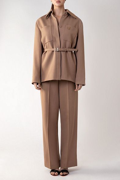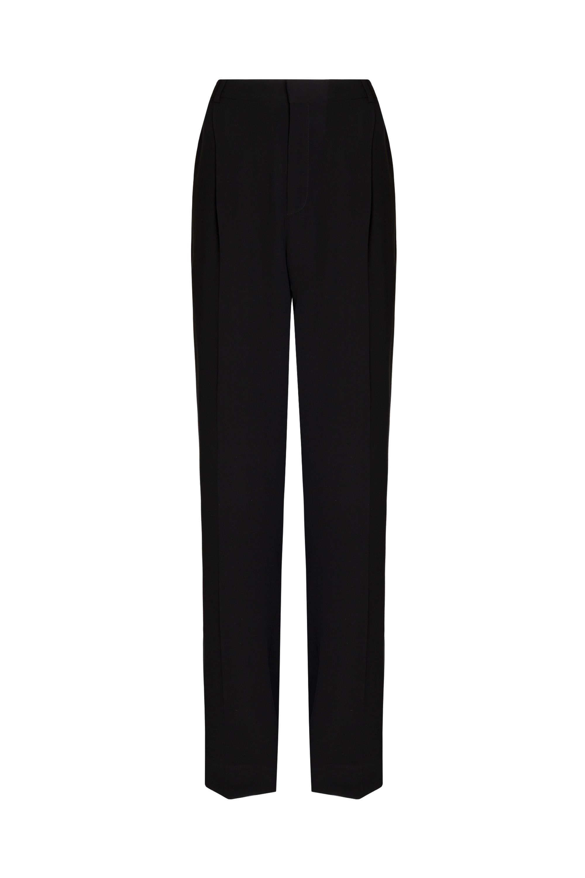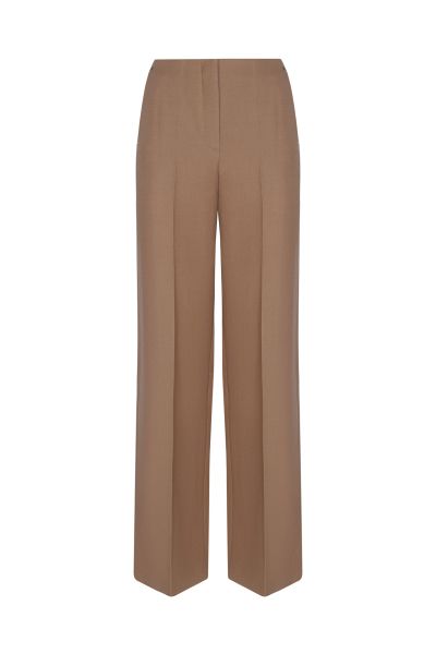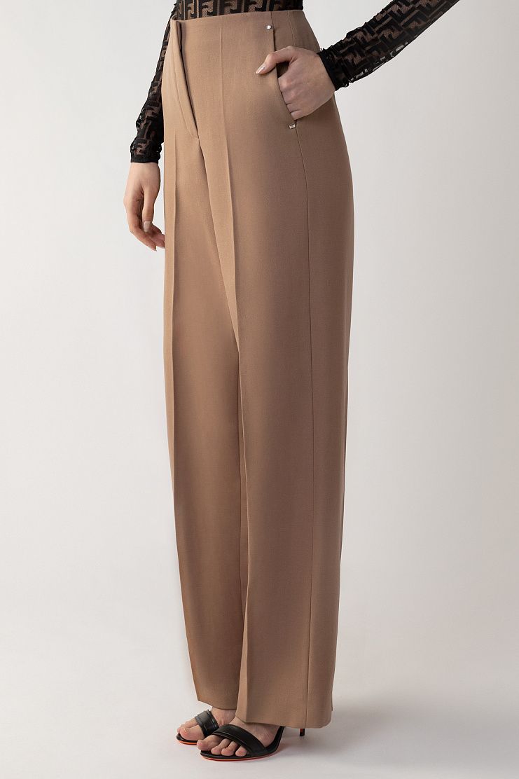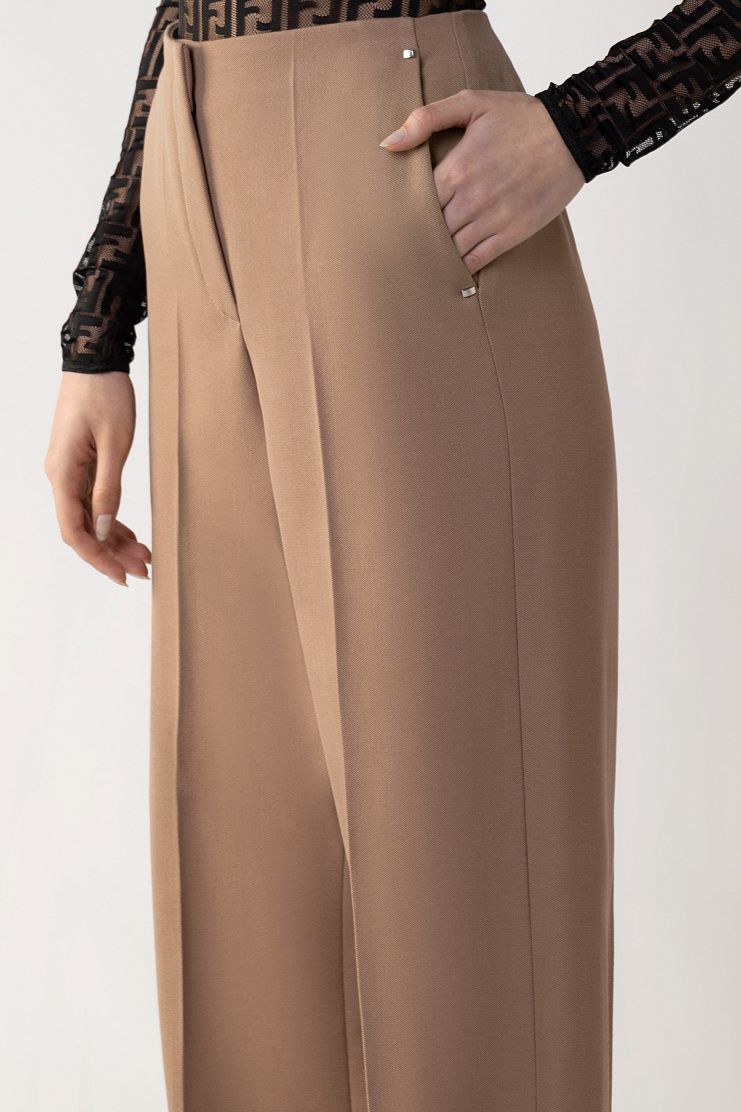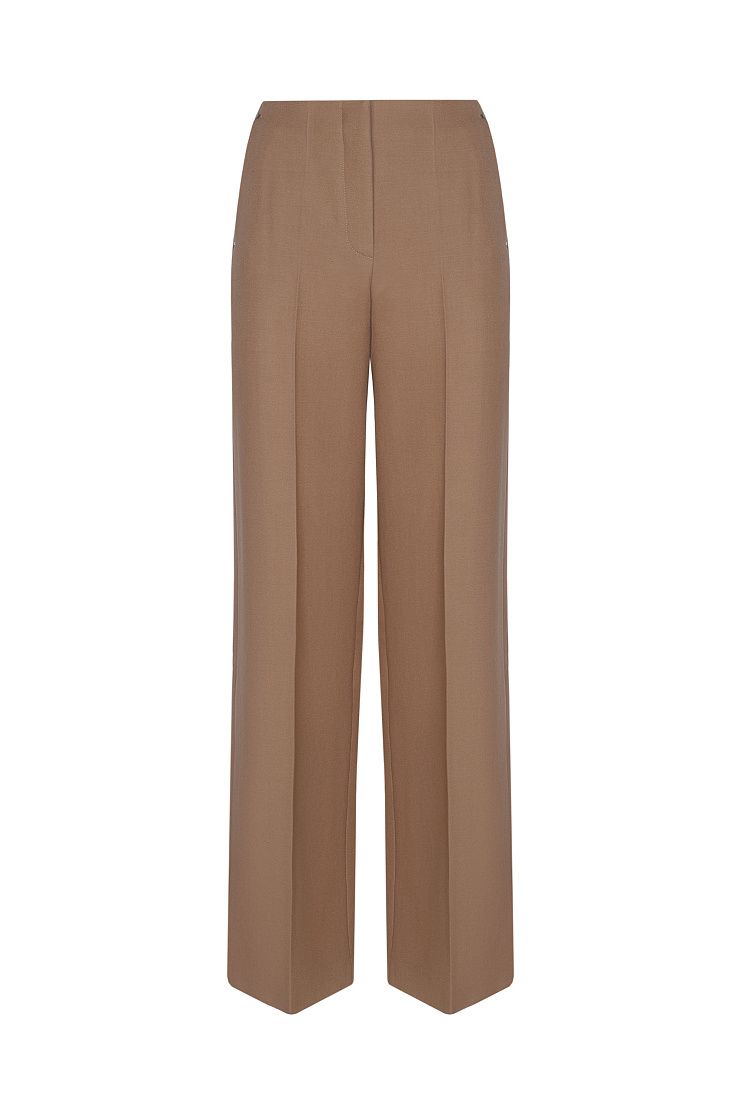 Широкие брюки из плотной шерсти легко впишутся в базовый гардероб. Благодаря высокой посадке и проглаженным стрелкам модель визуально вытягивает силуэт и удлиняет ноги. Изделие с боковыми прорезными карманами застегивается на потайной крючок и молнию.