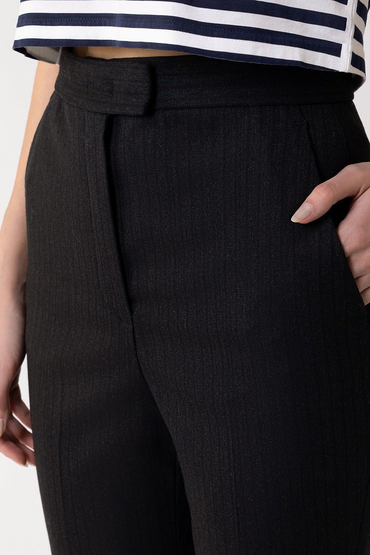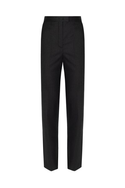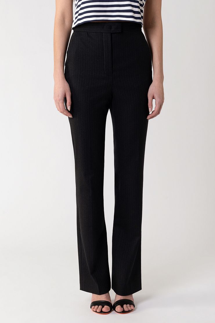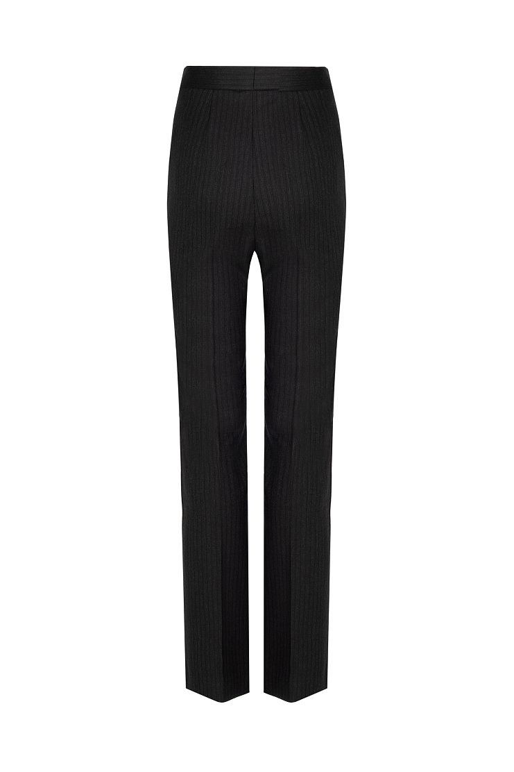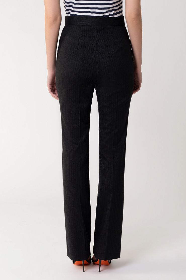 Зауженные брюки с высокой посадкой сшиты из тонкой шерсти в едва заметную полоску. Эластичные волокна в составе обеспечивают идеальную посадку по фигуре. Модель дополнена поясом и проглаженными стрелками, а застегивается на молнию и крючок. Классические брюки впишутся и в строгие деловые образы с туфлями, и в повседневные аутфиты с кедами.