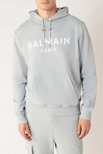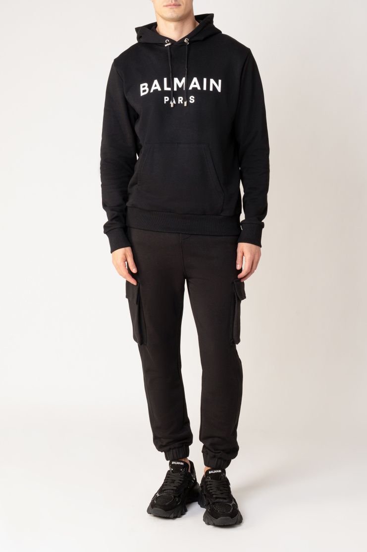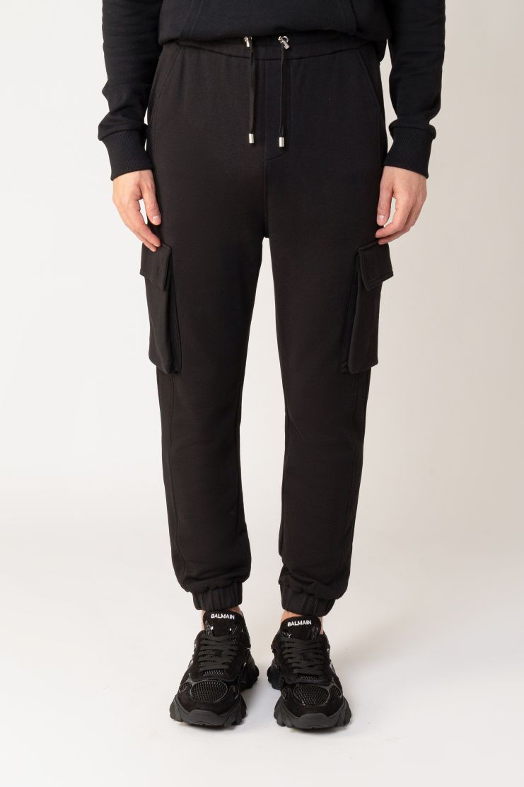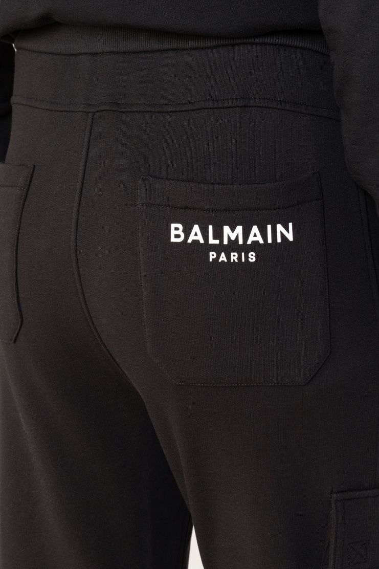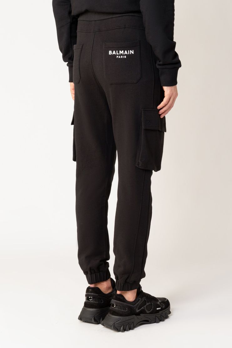 Брюки прямого кроя выполнены из мягкого хлопкового трикотажа. Модель дополнена поясом на кулиске и эластичными манжетами в рубчик. Помимо боковых и задних карманов, предусмотрены накладные карманы с клапанами как у карго. Брюки украшены контрастным логотипом Balmain Paris и идеально подойдут для расслабленных повседневных образов.