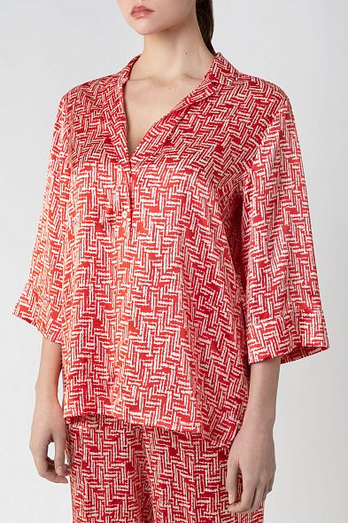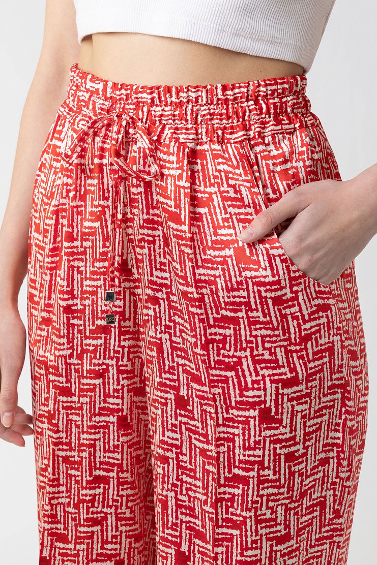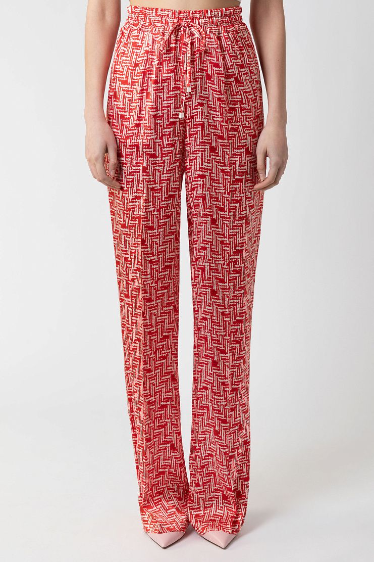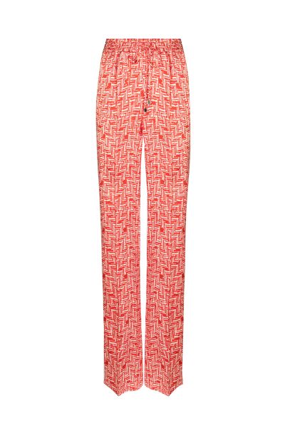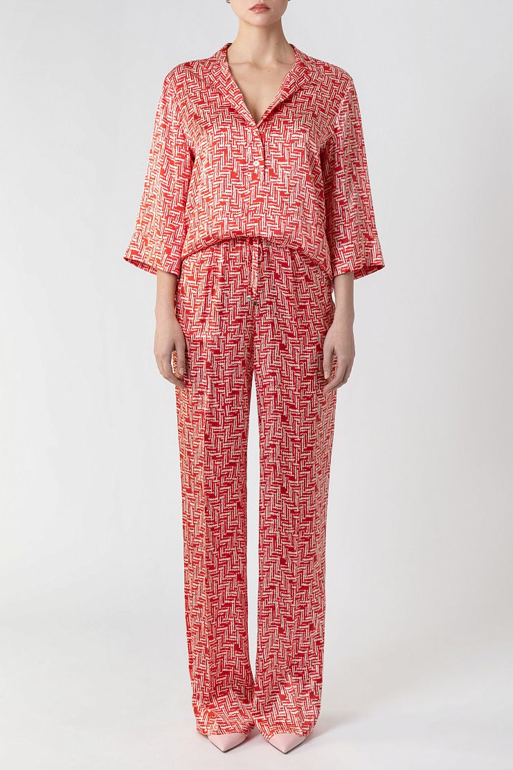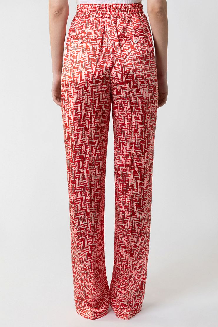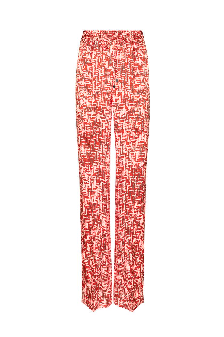 Брюки с эластичным поясом на кулиске выполнили из набивного шелка с фирменным паттерном Scarlet Stairs. Свободная модель с боковыми и задними карманами отлично впишется в расслабленный образ с парной или однотонной рубашкой.