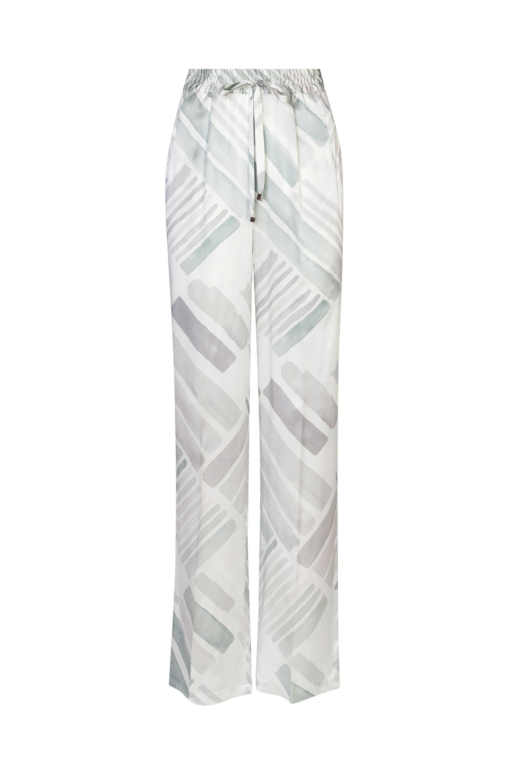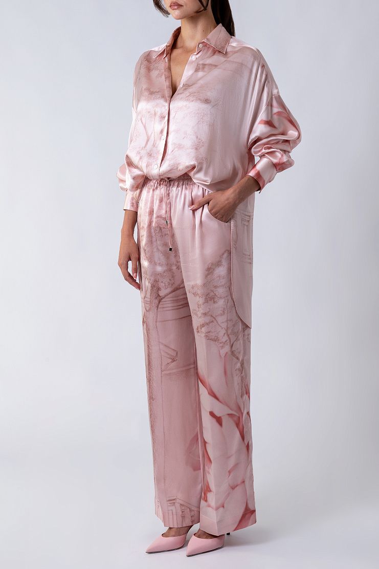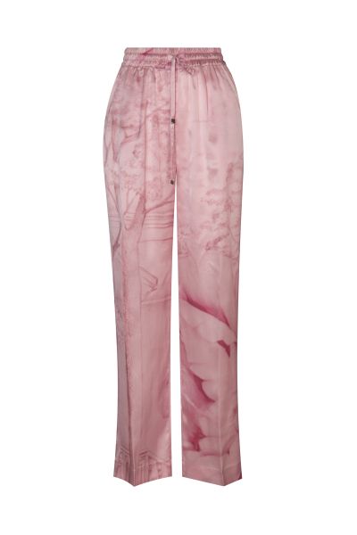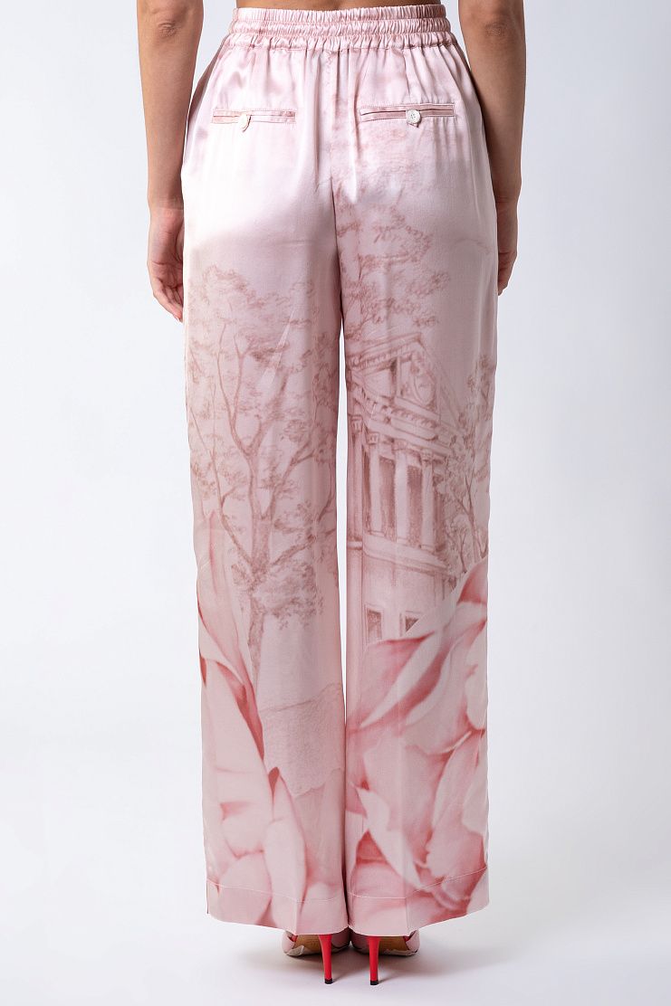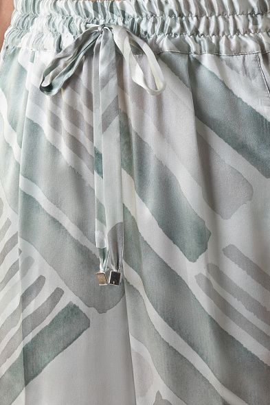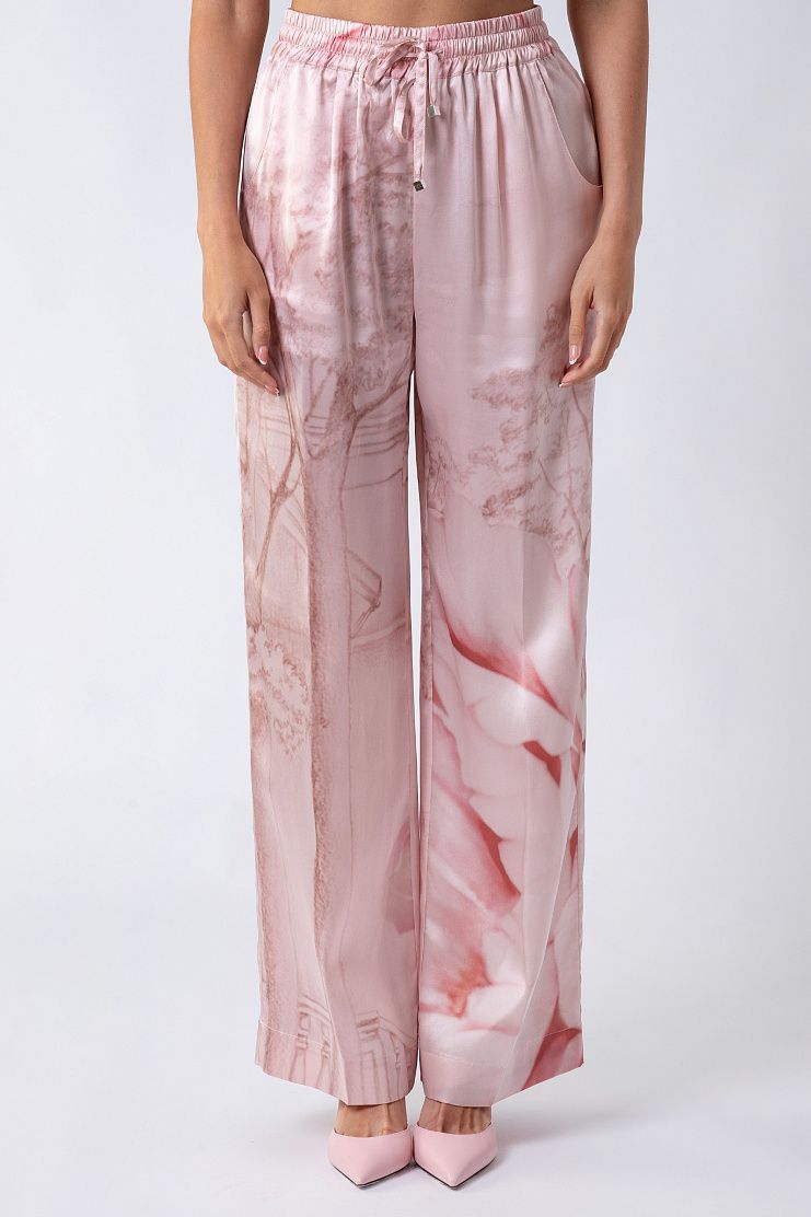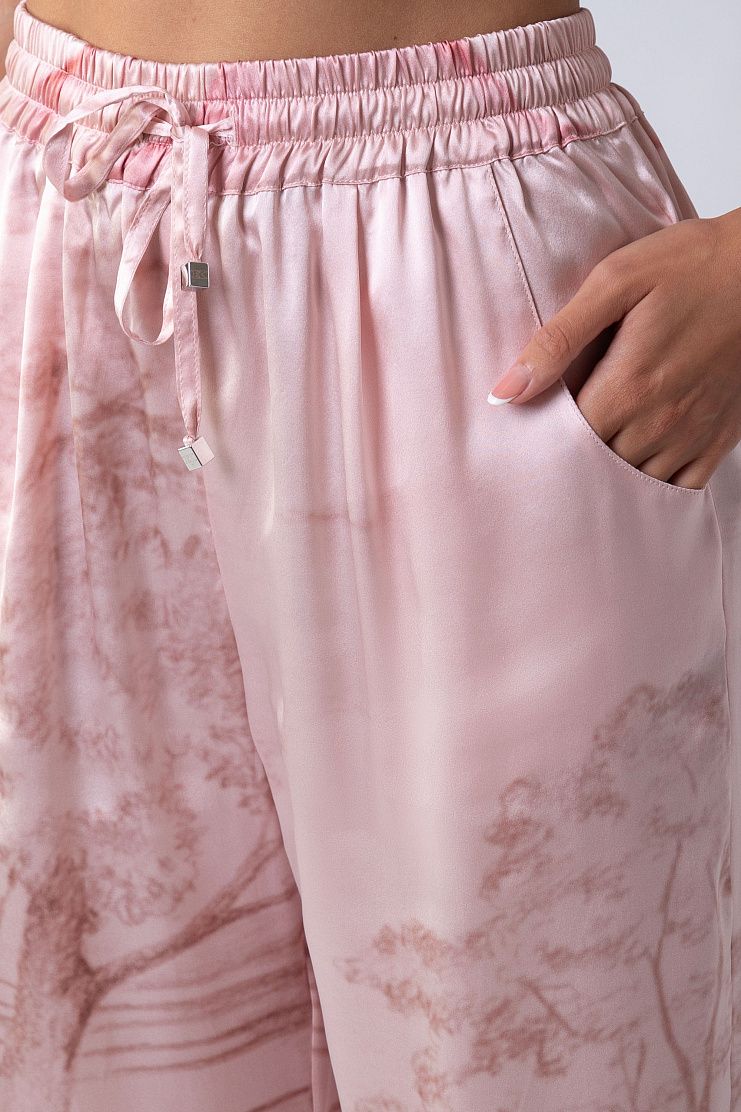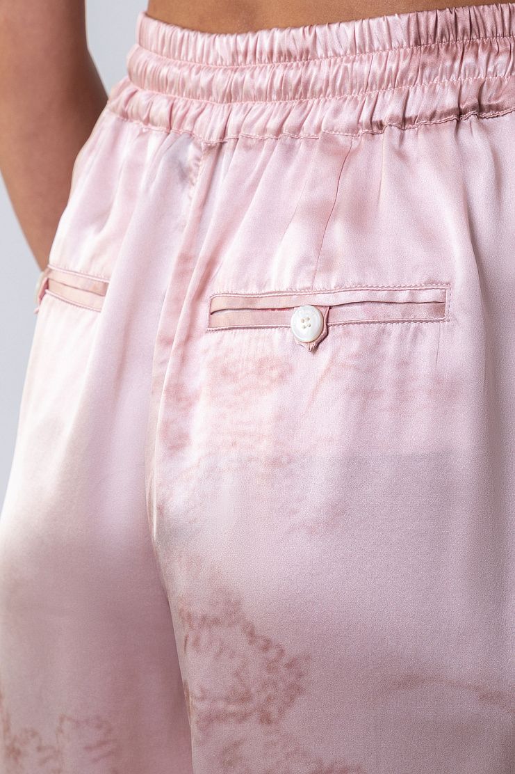 Брюки, напоминающие по крою пижамные, выполнили из гладкого струящегося шелка с фирменным акварельным принтом. Модель с эластичным поясом на кулиске дополнена боковыми и задними карманами и проглаженными стрелками. Такие брюки составят идеальный комплект с парной блузой и босоножками.