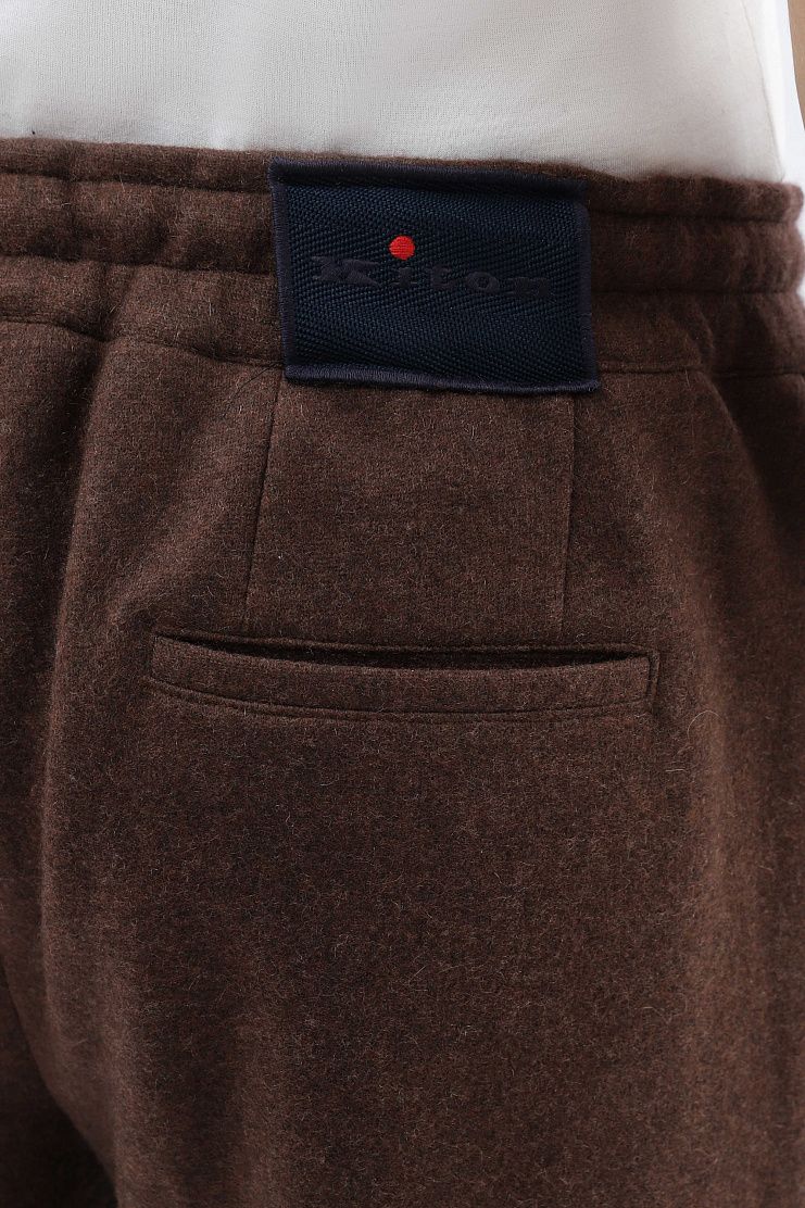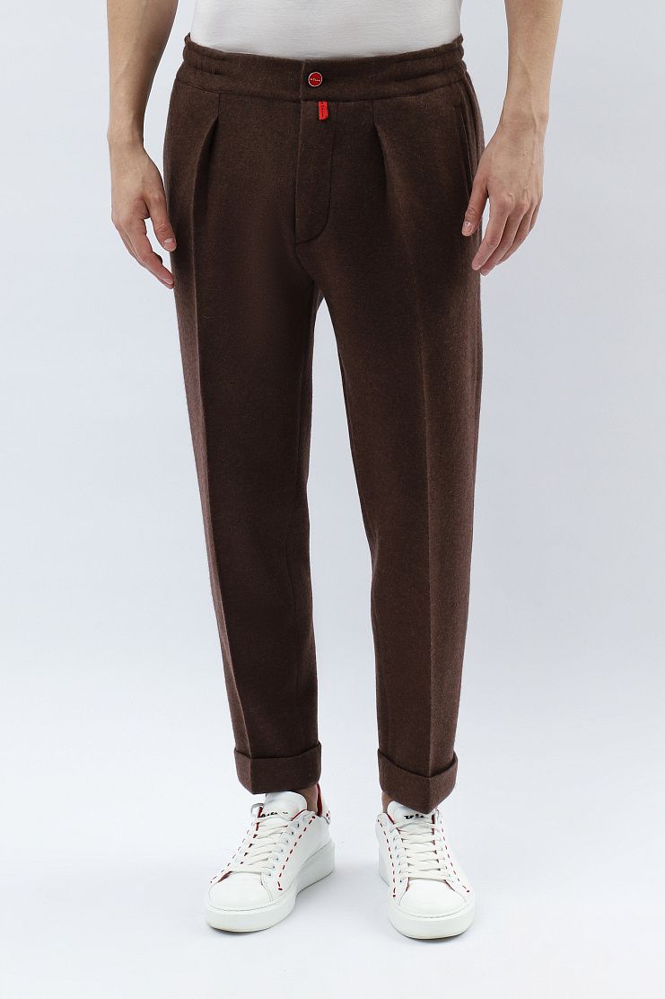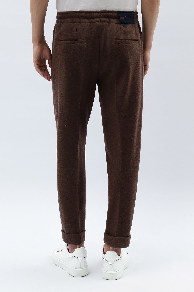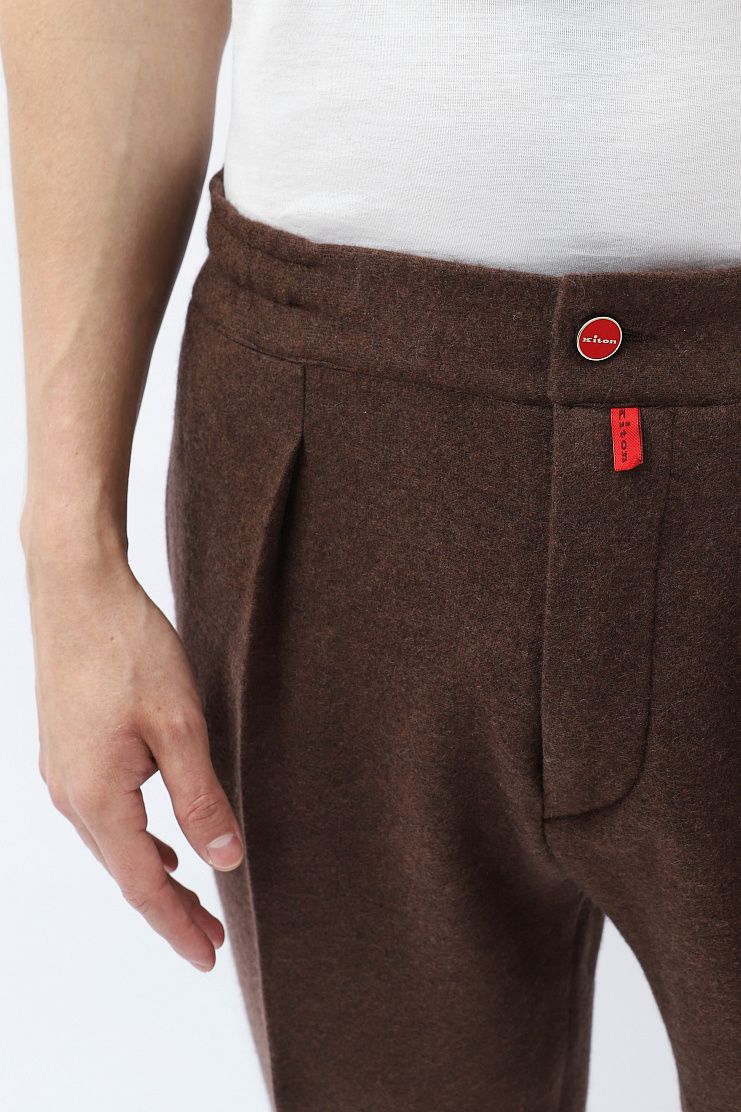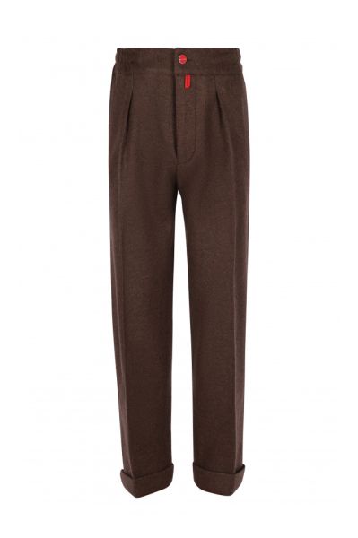 Кашемировые брюки отлично подойдут для комфортного расслабленного образа. Модель свободного кроя с защипами, подворотами, эластичным поясом на резинке и стандартной застежкой на молнию и фирменную красную пуговицу с логотипом.