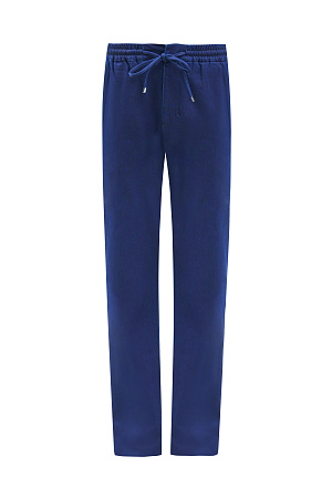 Брюки свободного кроя с поясом-кулиской сшили из чуть эластичного хлопкового денима. Модель дополнили боковыми и задними карманами и украсили брендированным патчем на поясе.