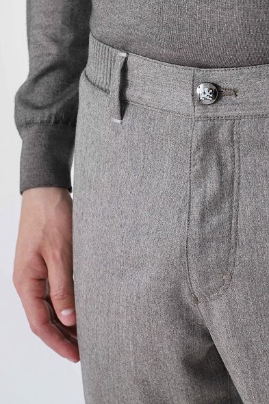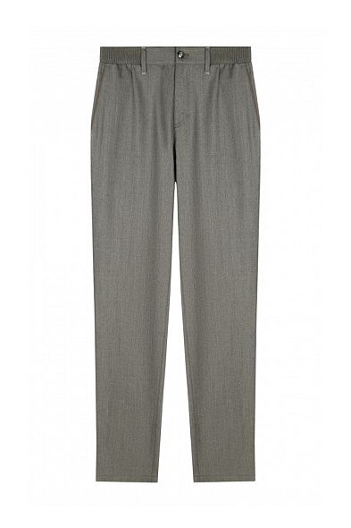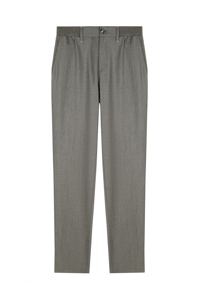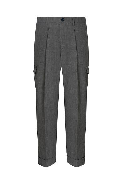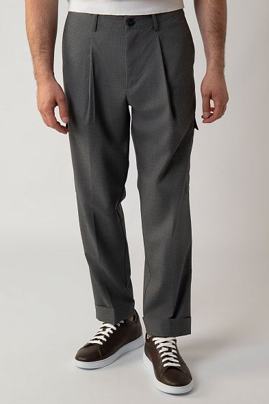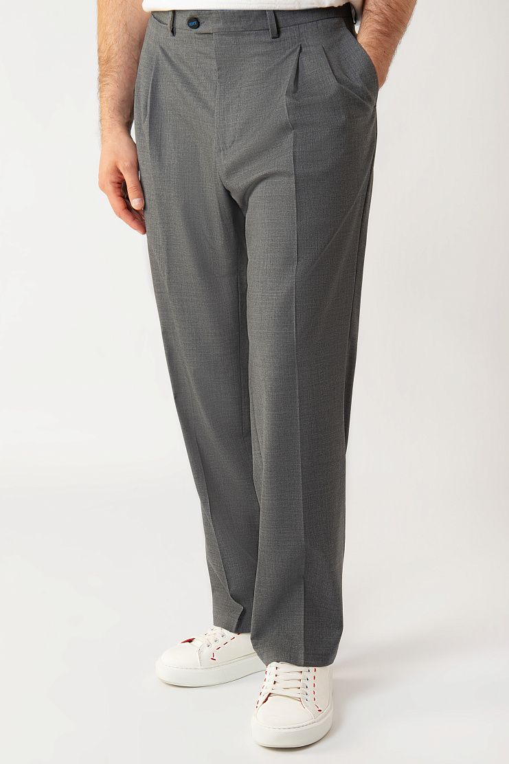 Брюки свободного кроя из меланжевой костюмной шерсти идеально впишутся в образы в стиле smart casual. Модель со стрелками и защипами дополнена боковыми и задними карманами. Акценты в виде текстильной брендированной нашивки на поясе и пуговицы с логотипом подчеркивают фирменный стиль.
