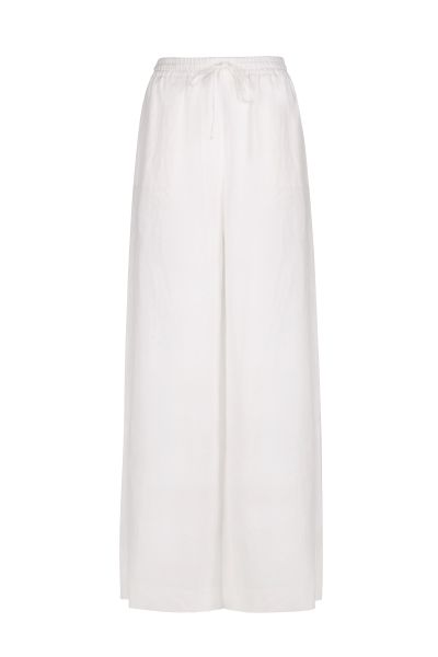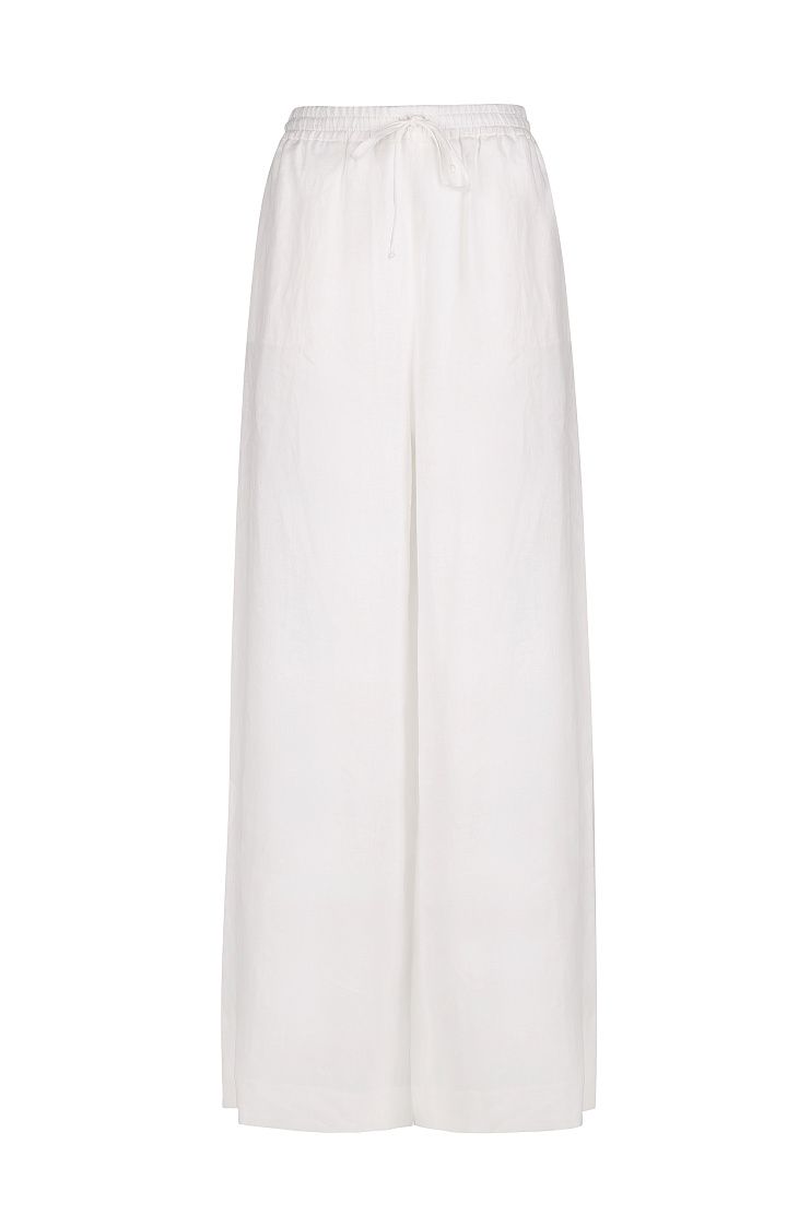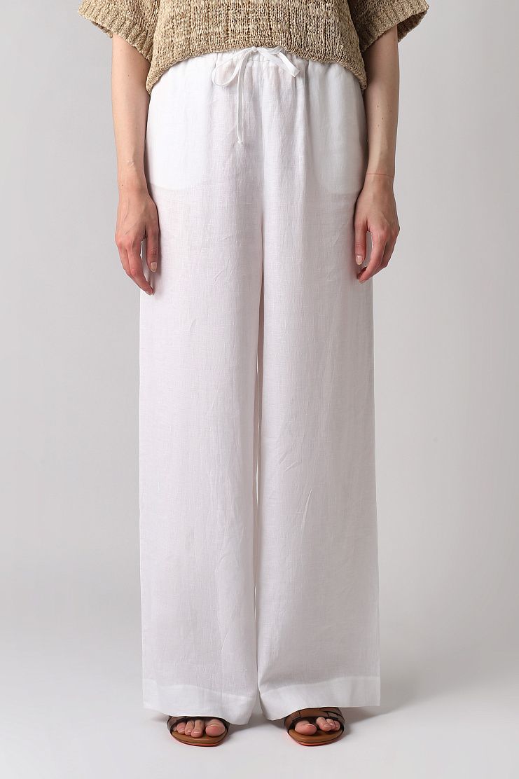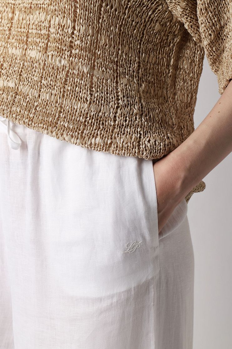 Брюки выполнены из натурального льна, обработанного алоэ, что обеспечивает струящуюся драпировку. Эластичный пояс на шнурке гарантирует максимальный комфорт. Такие брюки идеально подходят для летнего отдыха в жаркую погоду.