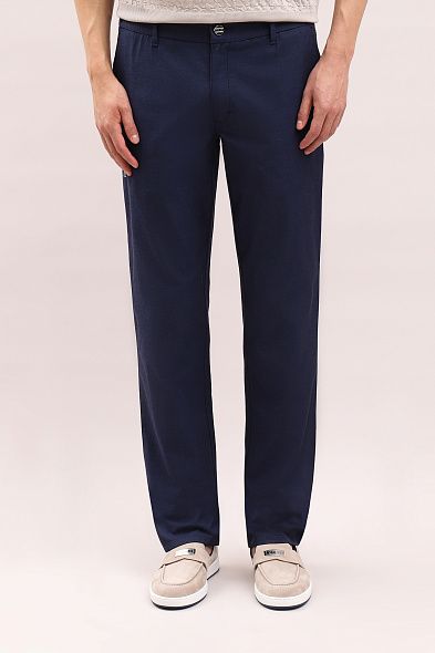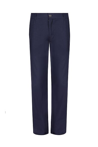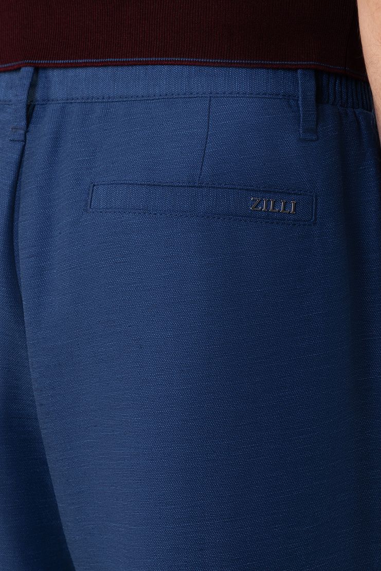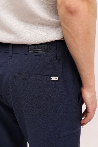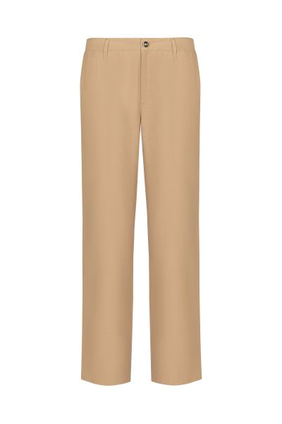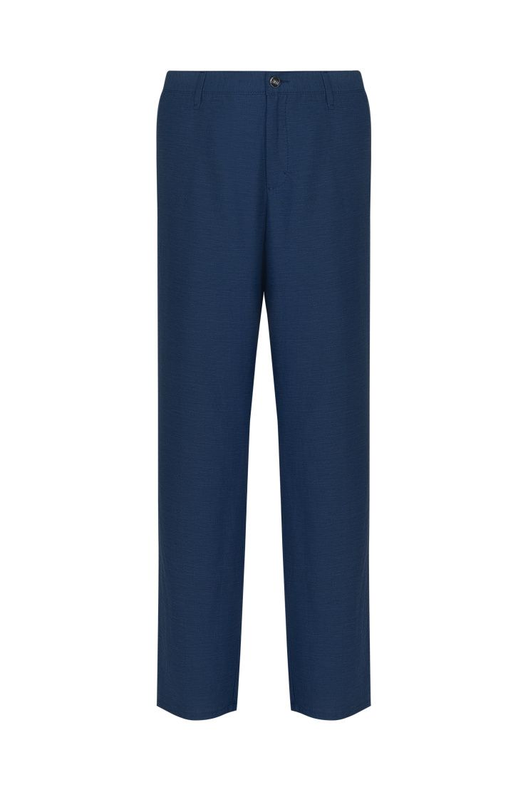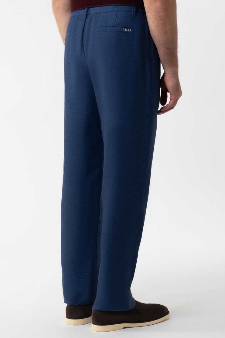 Брюки прямого кроя сшили из дышащего льна с добавлением гладкого шелка. Модель дополнена эластичными вставками на поясе и двумя парами карманов. Застегивается на молнию и пуговицу.