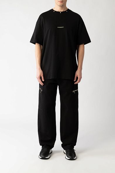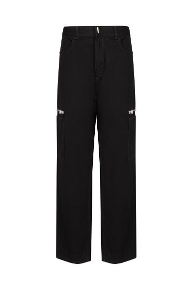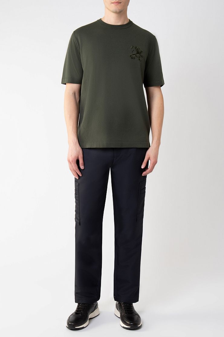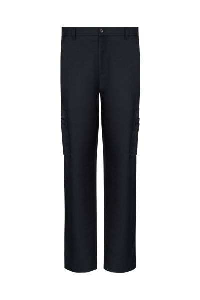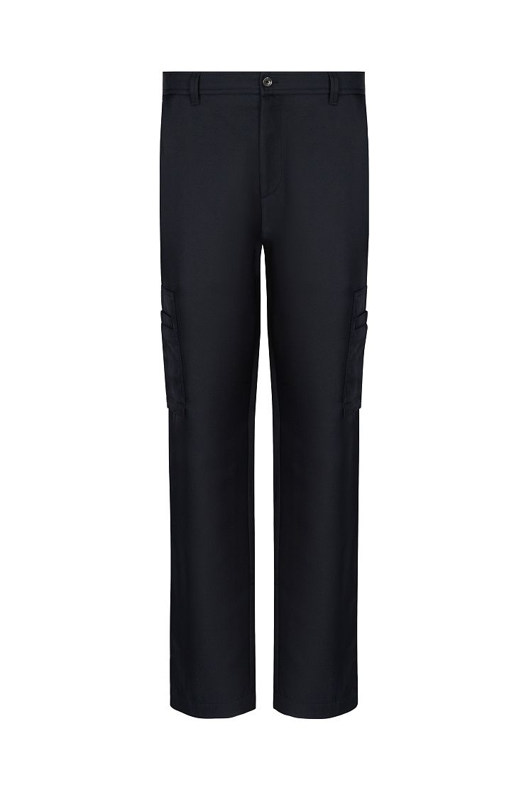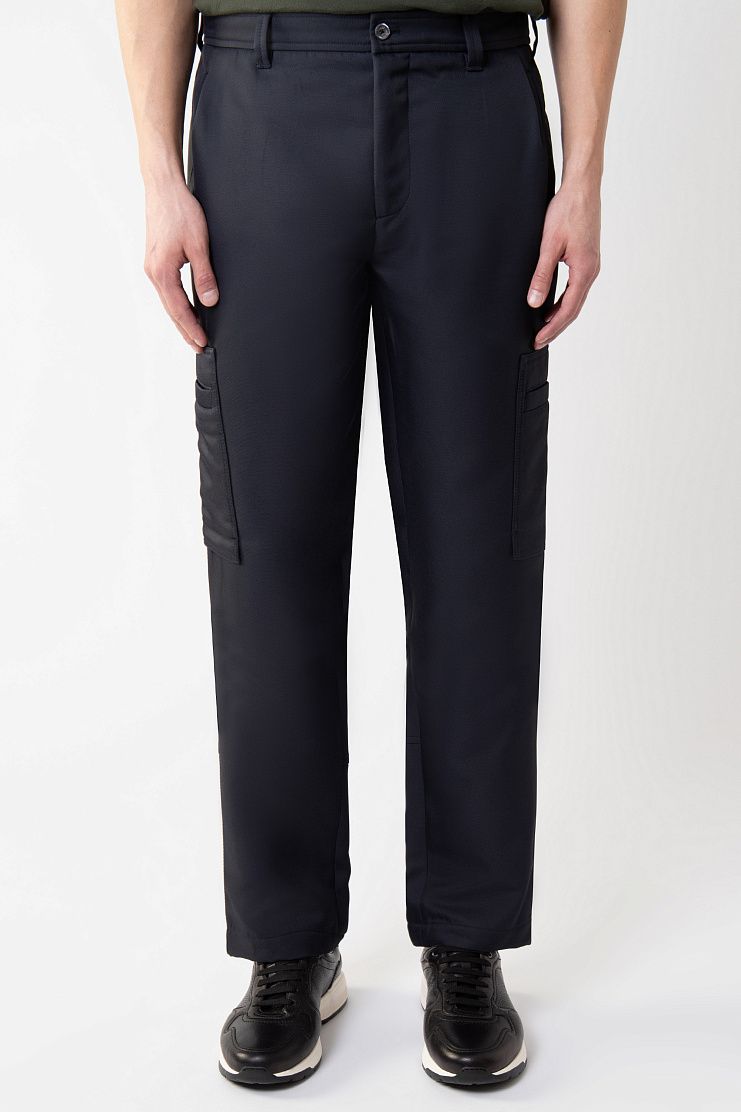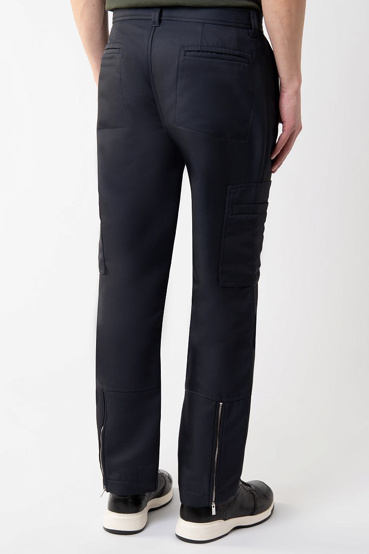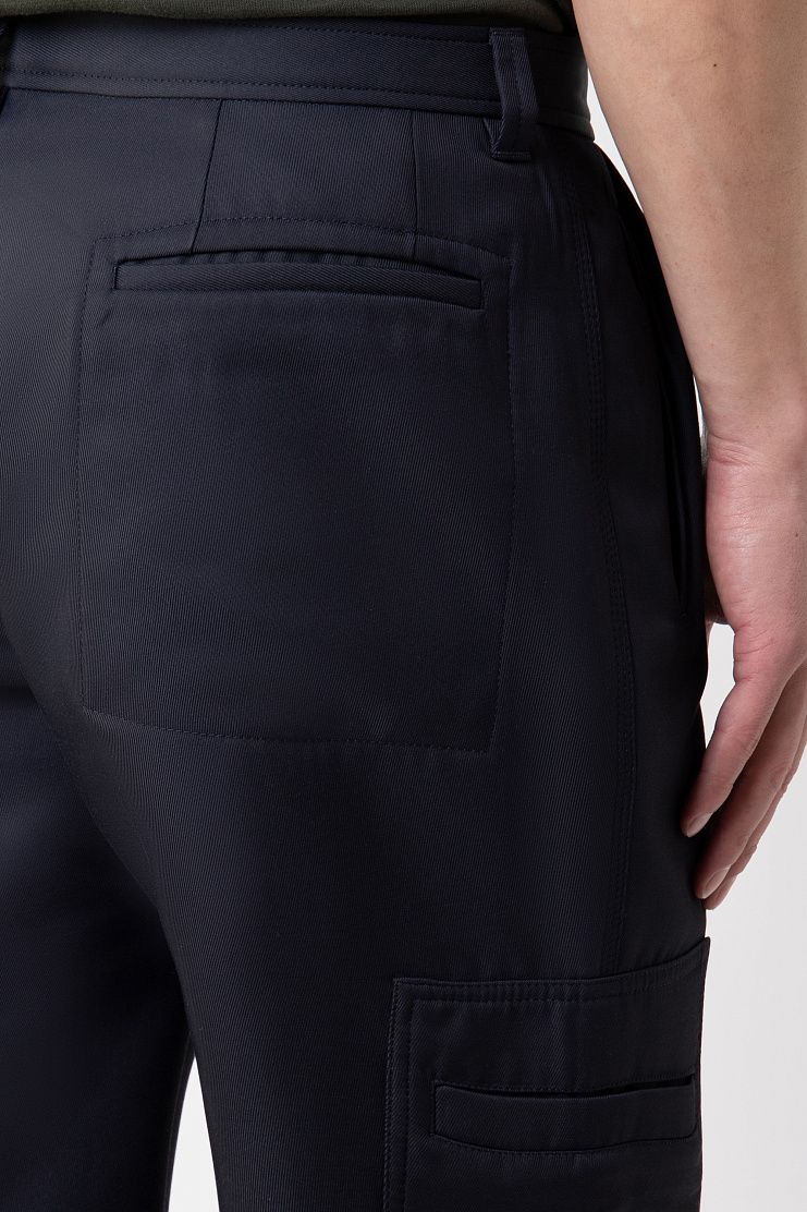 Брюки карго сшили из гладкого полиэстера с добавлением шелка, который придает ткани деликатный блеск. Модель дополнена двумя накладными и четырьмя прорезными карманами. Дизайн завершают молнии на брючинах сзади.