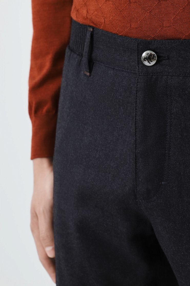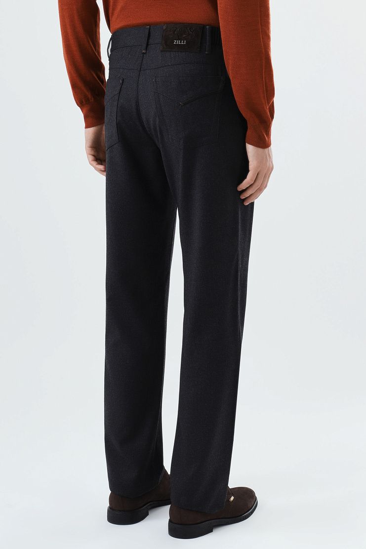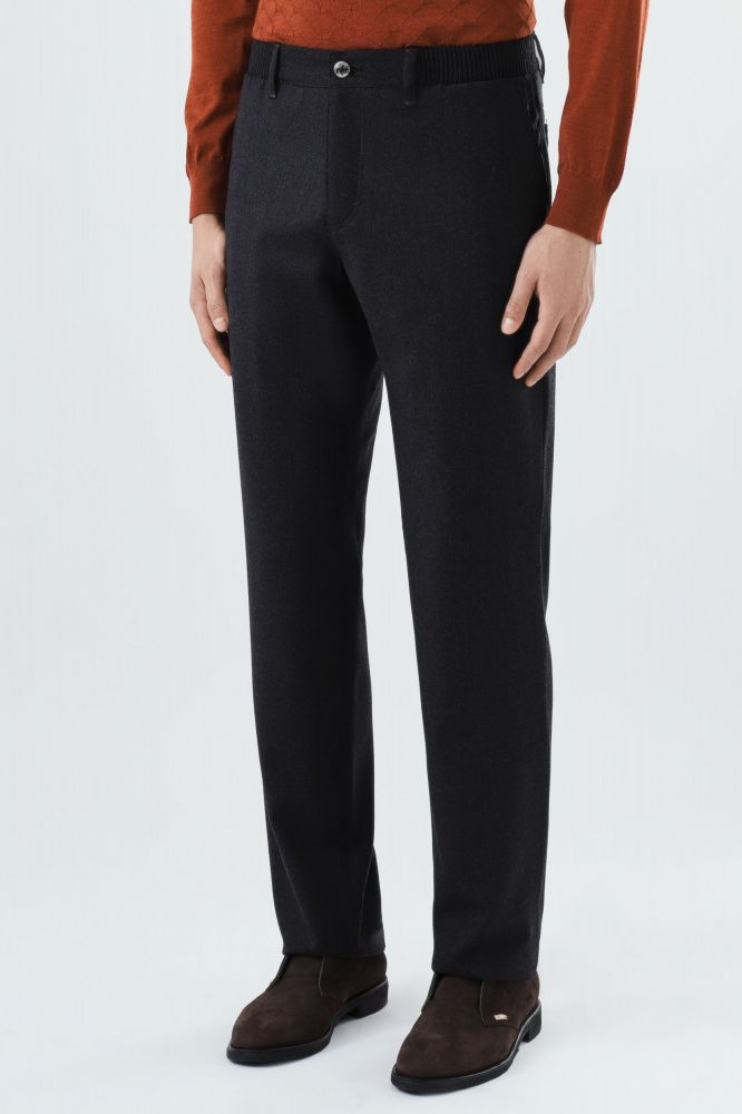 Брюки из шерсти с добавлением кашемира. Модель прямого кроя, с эластичным поясои и застежкой на молнию и металлическую пуговицу с эмблемой бренда. Сзади на поясе расположена нашивка с тиснением в виде львов и металлическим логотипом.