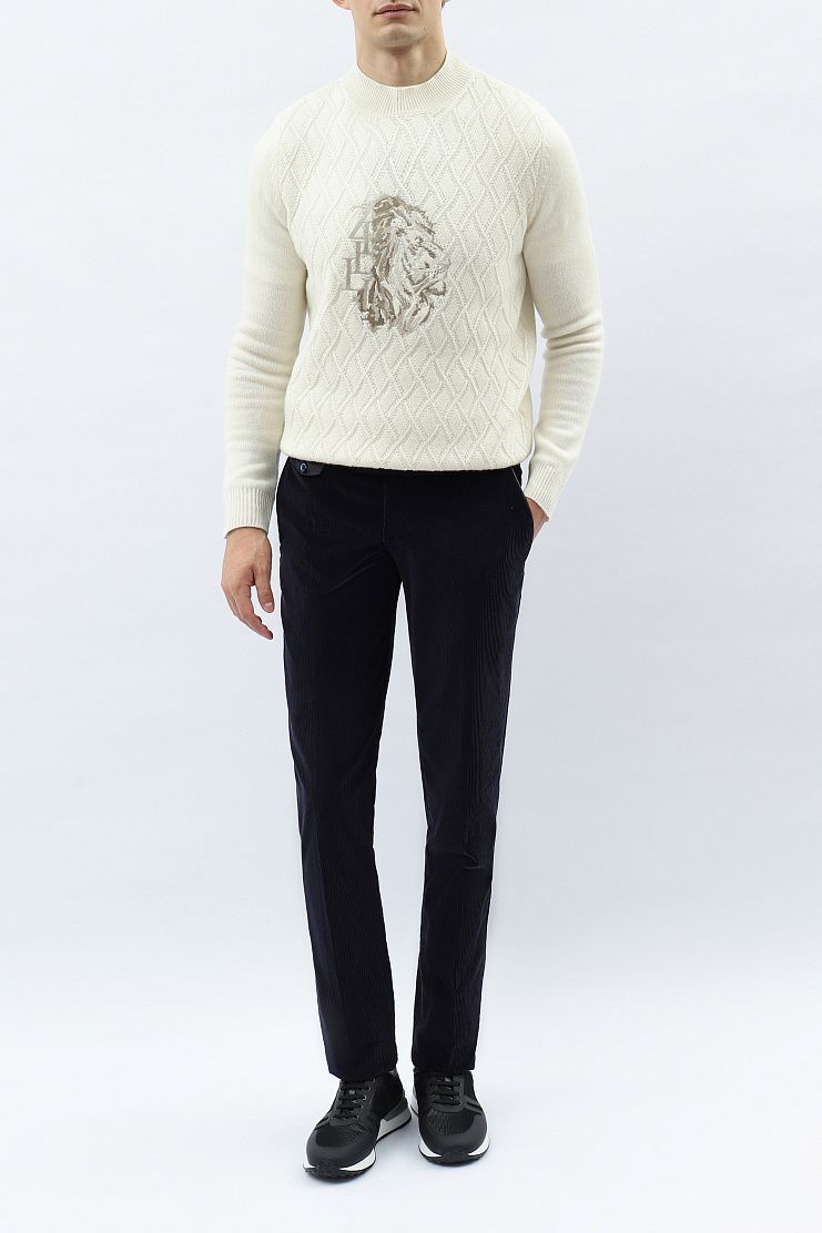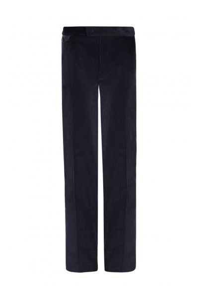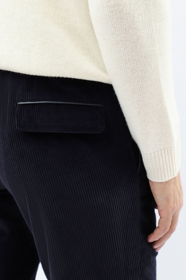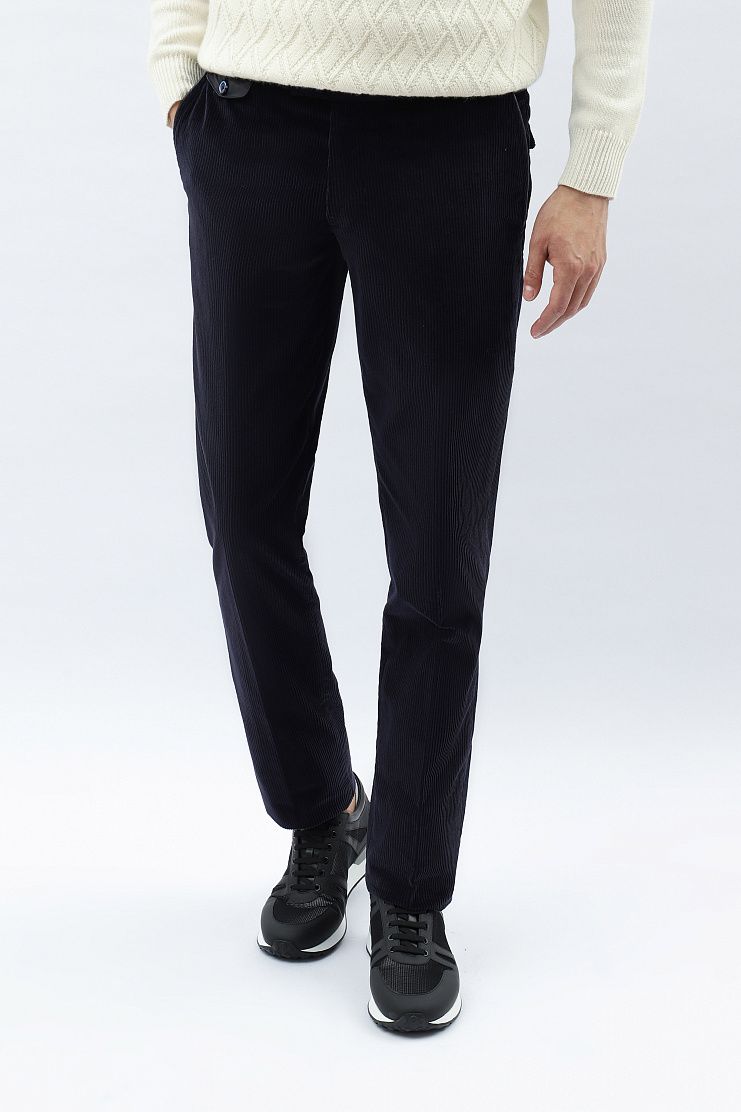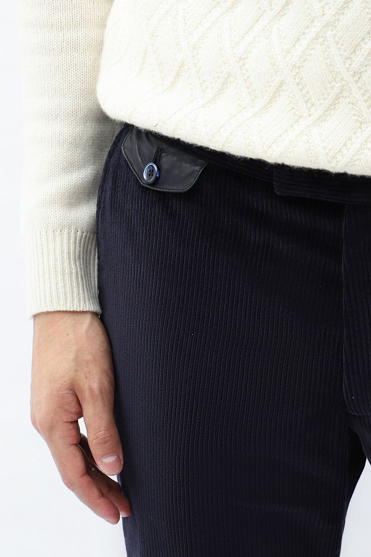 Вельветовые брюки с кожаной отделкой. Модель прямого кроя со стрелками и застежкой на молнию и пуговицу.