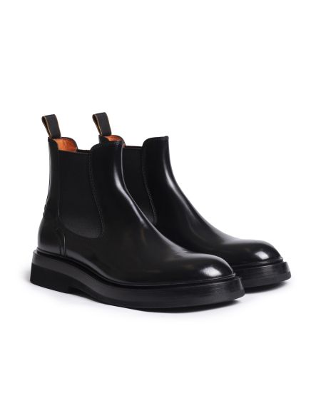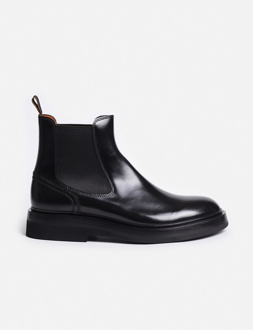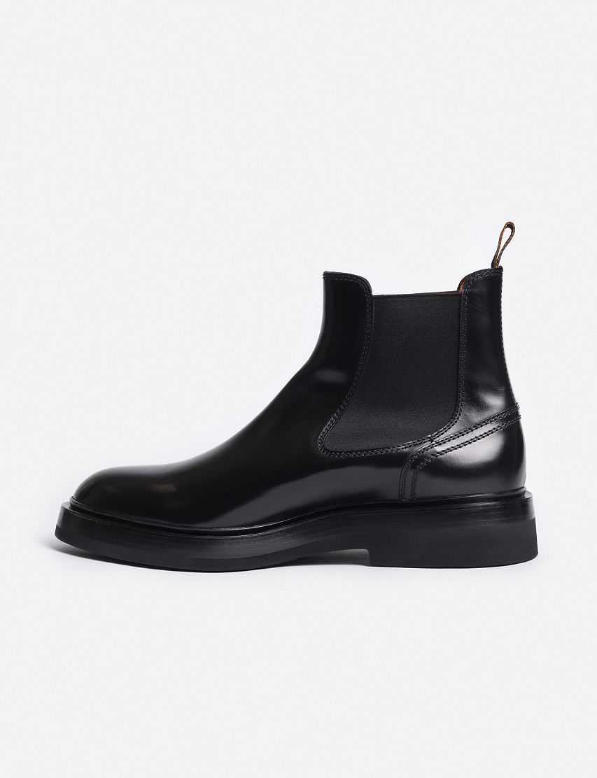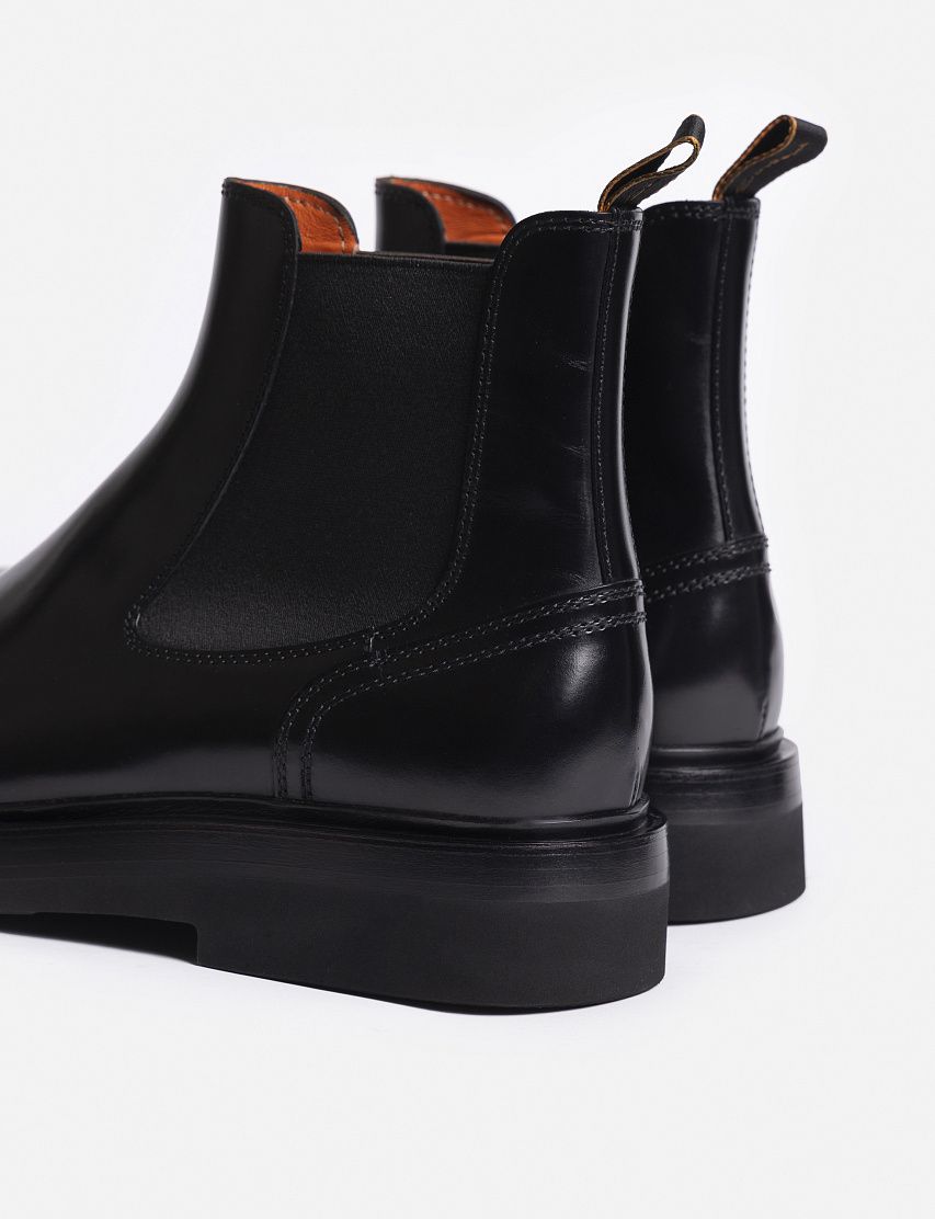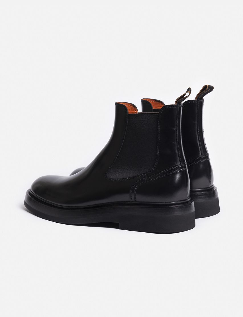 Лаконичные челси на широкой подошве выполнили из отполированной до глянцевого блеска телячьей кожи. Благодаря эластичными вставками по бокам и петле на заднике, пару удобно надевать и снимать. Внутренняя кожаная отделка фирменного оранжевого оттенка подчеркивает принадлежность к бренду.