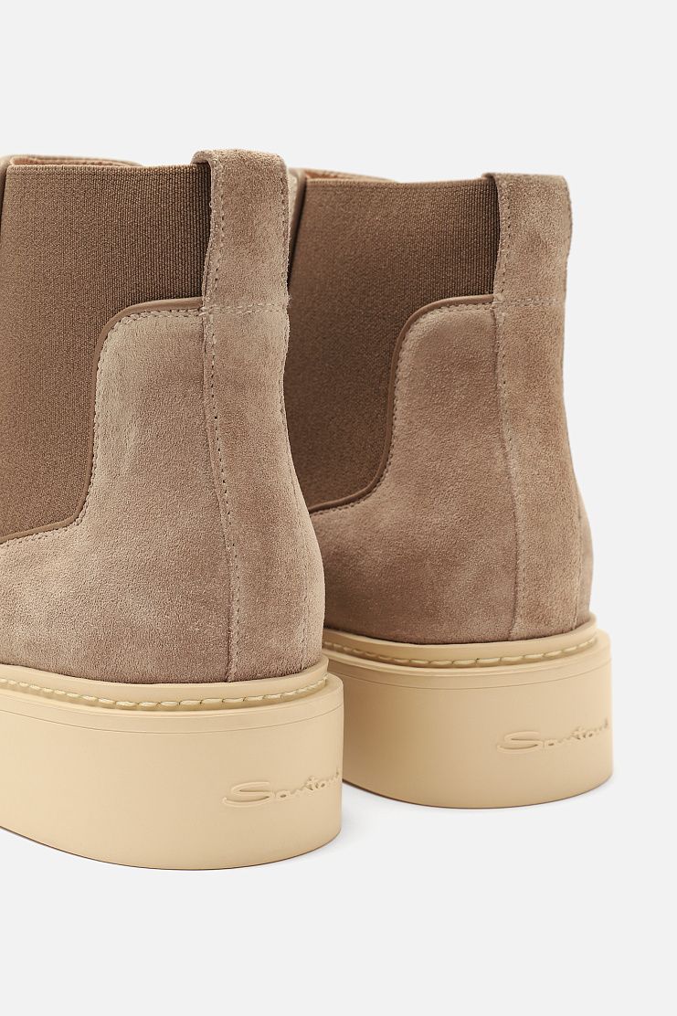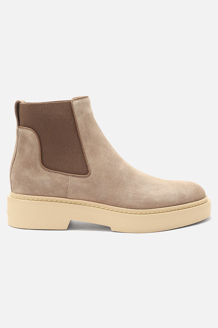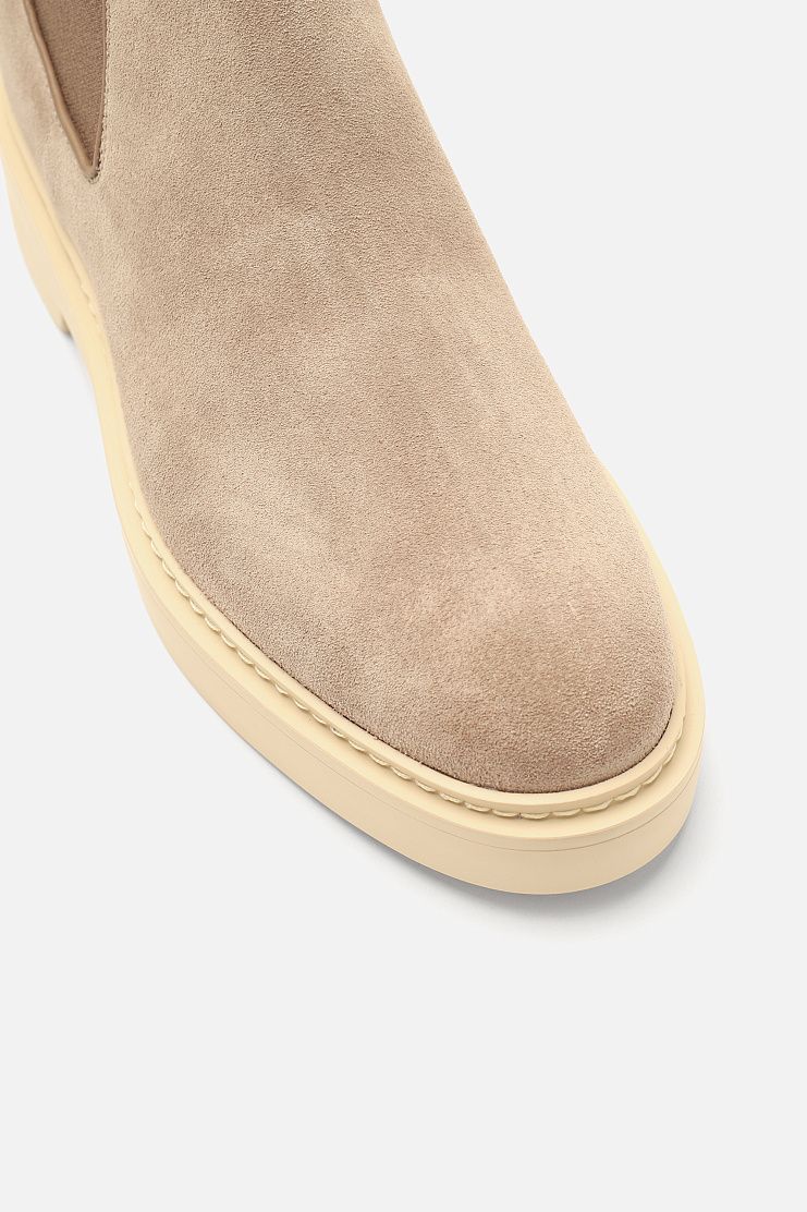 Челси на массивной устойчивой подошве выполнили из мягкой замши с бархатистой фактурой. Эластичные текстильные вставки по бокам позволяют с легкостью снимать и надевать пару. Модель с минимальным декором гармонично впишется в любой повседневный образ.