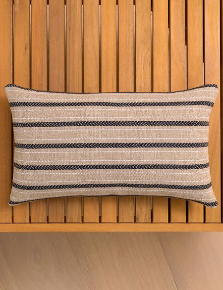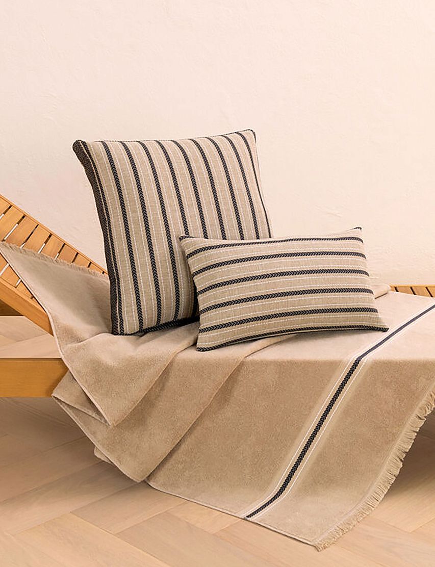 Прямоугольную декоративную наволочку с полосатым узором сшили из водонепроницаемого полипропилена, имитирующего фактуру текстиля. Модель с мягким наполнителем из синтепона дополнена молнией-застежкой сбоку.