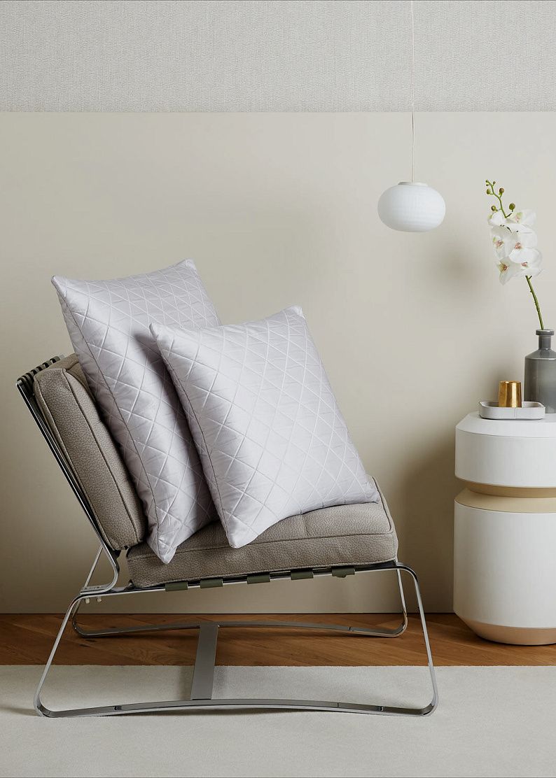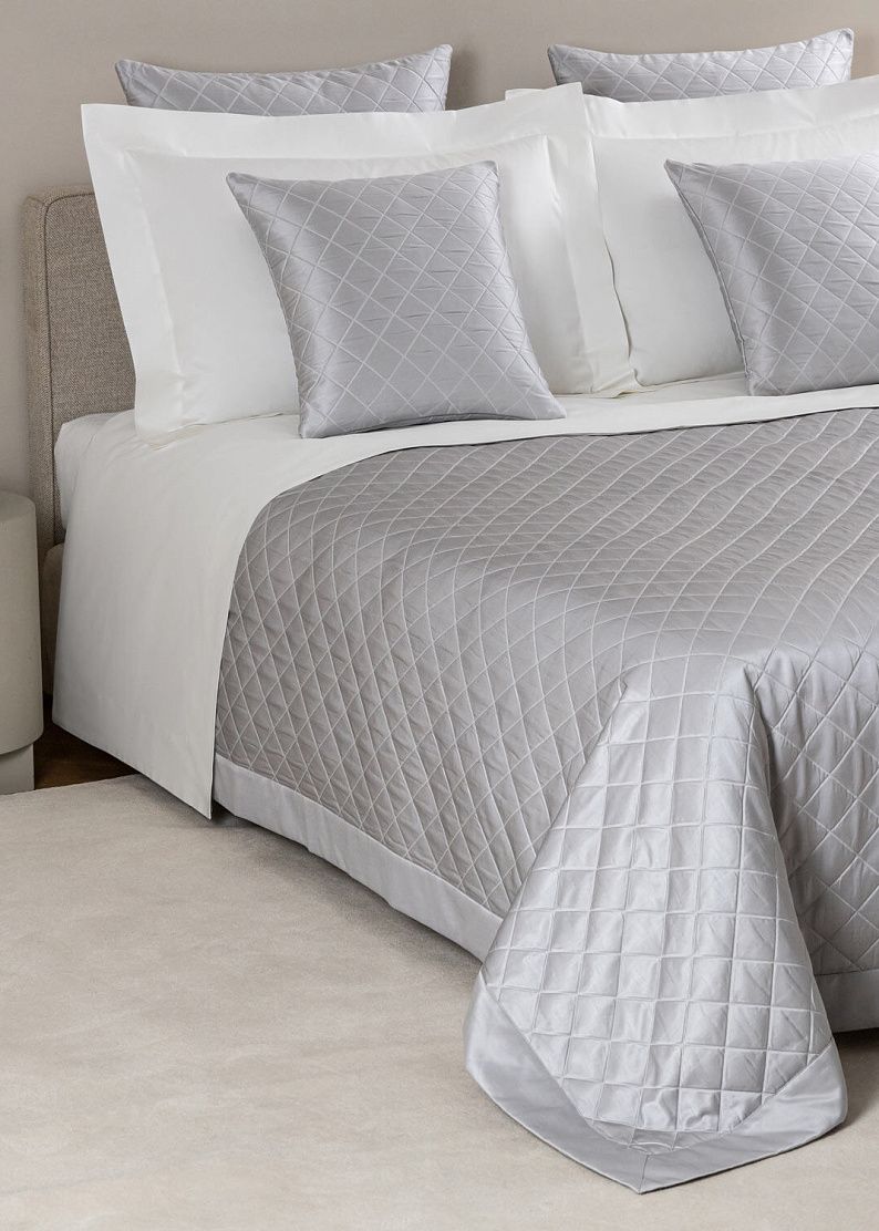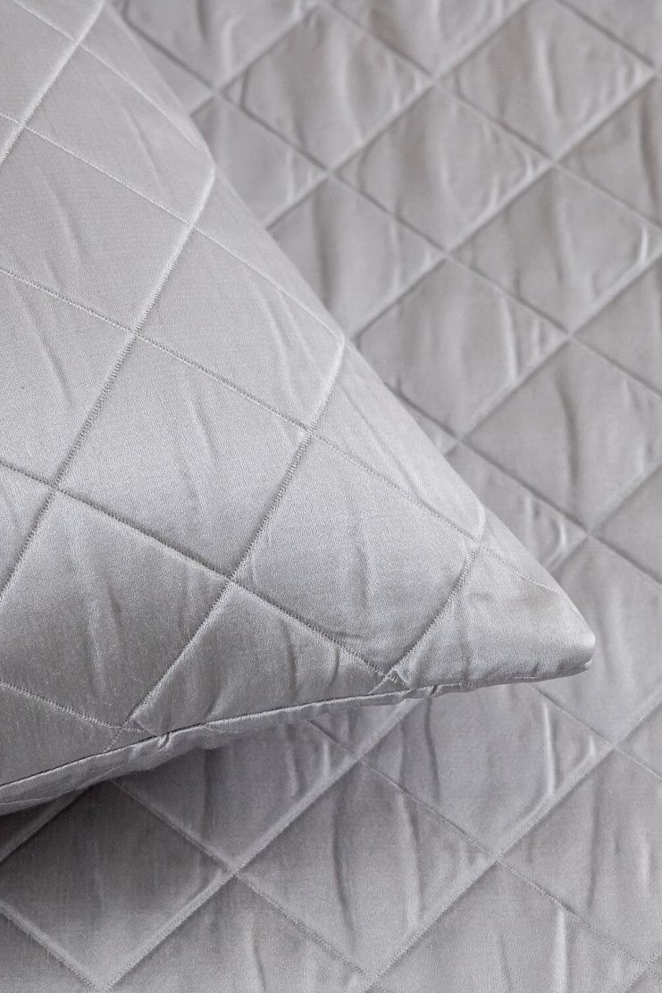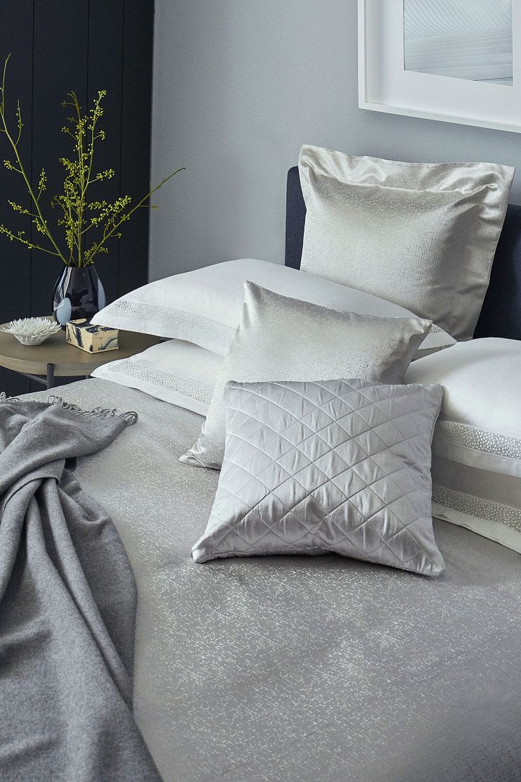 Декоративная наволочка Luxury Lozange серого цвета с легким блеском и узором аргайл идеально подойдет для элегантной спальни. Модель шикарно дополнит покрывало из той же коллекции.