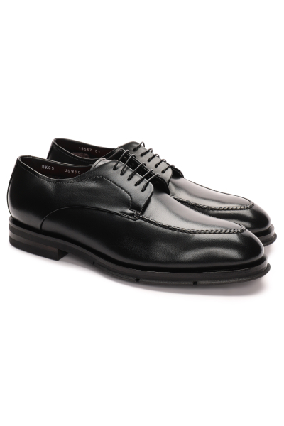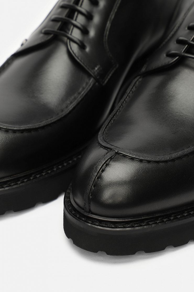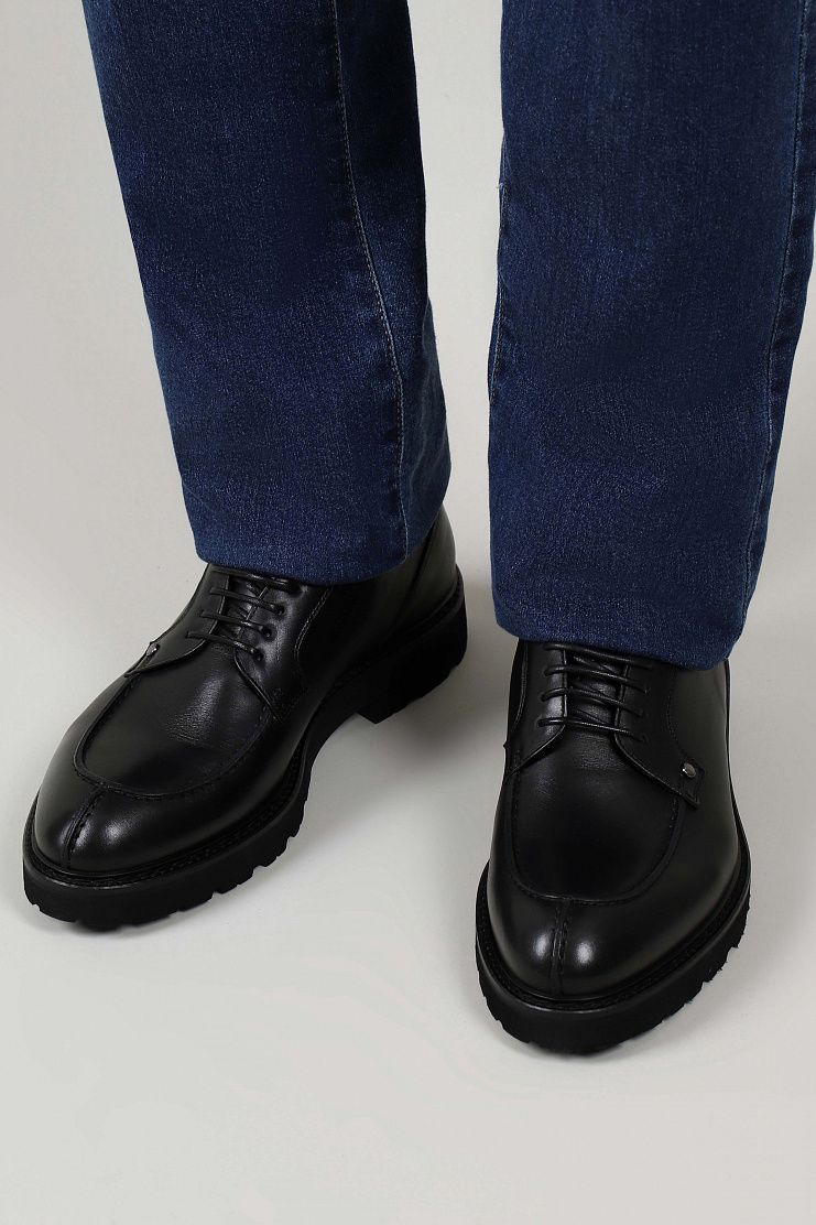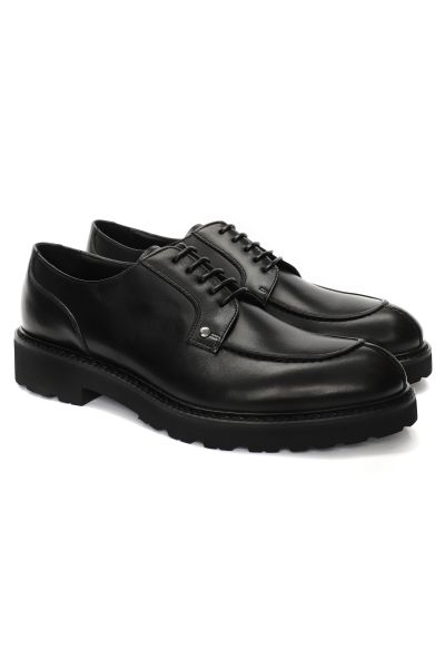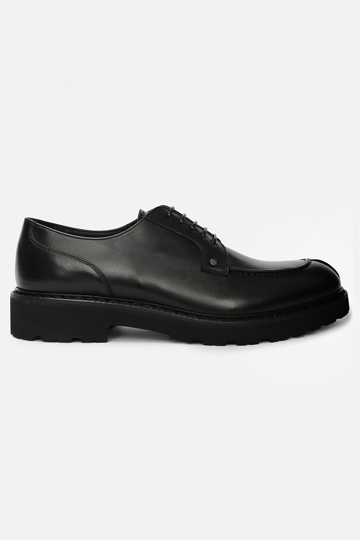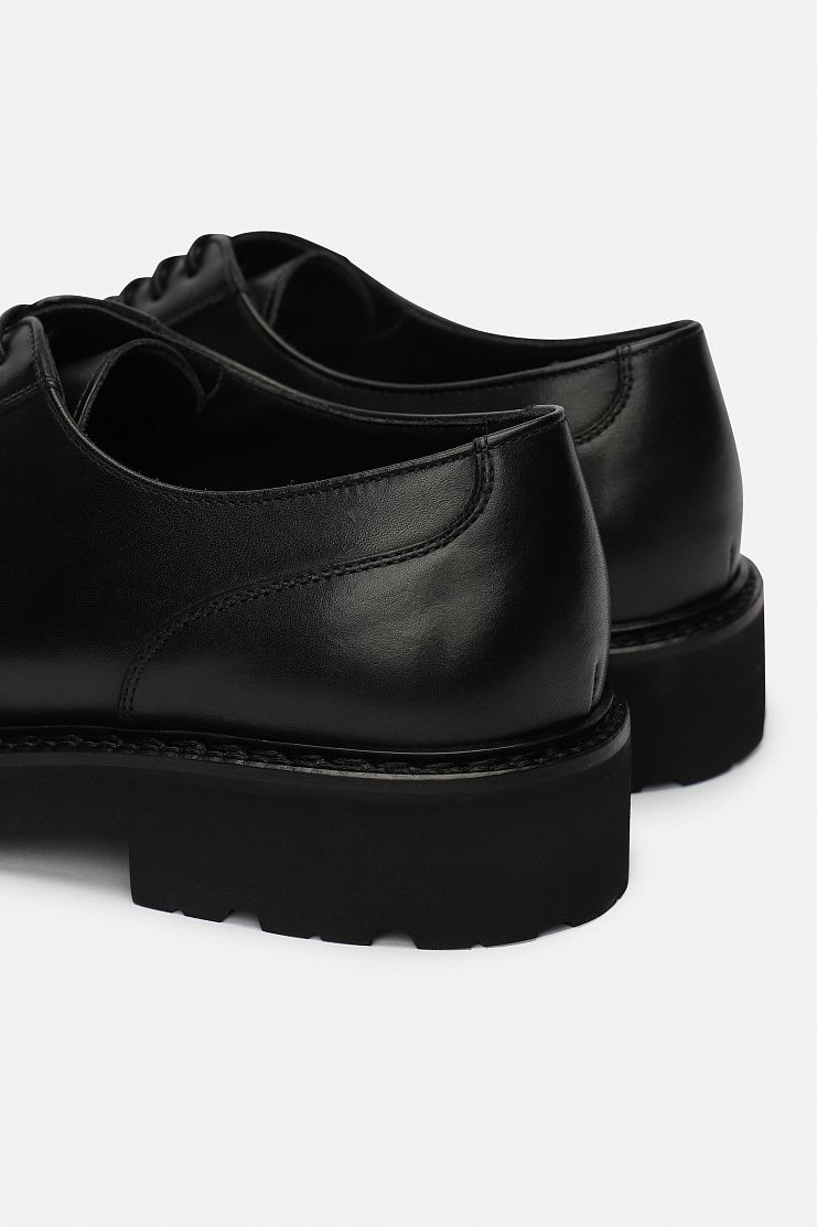 Кожаные дерби с декоративной строчкой и металлическими заклепками по бокам отлично подойдут для повседневного образа. Модель на кожаной подкладке и толстой резиновой подошве с протекторами.