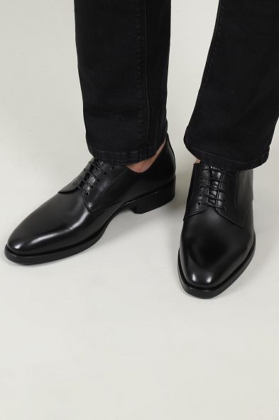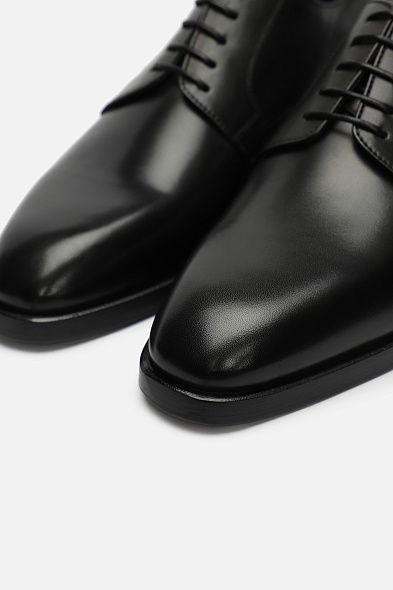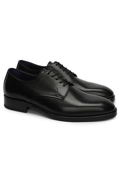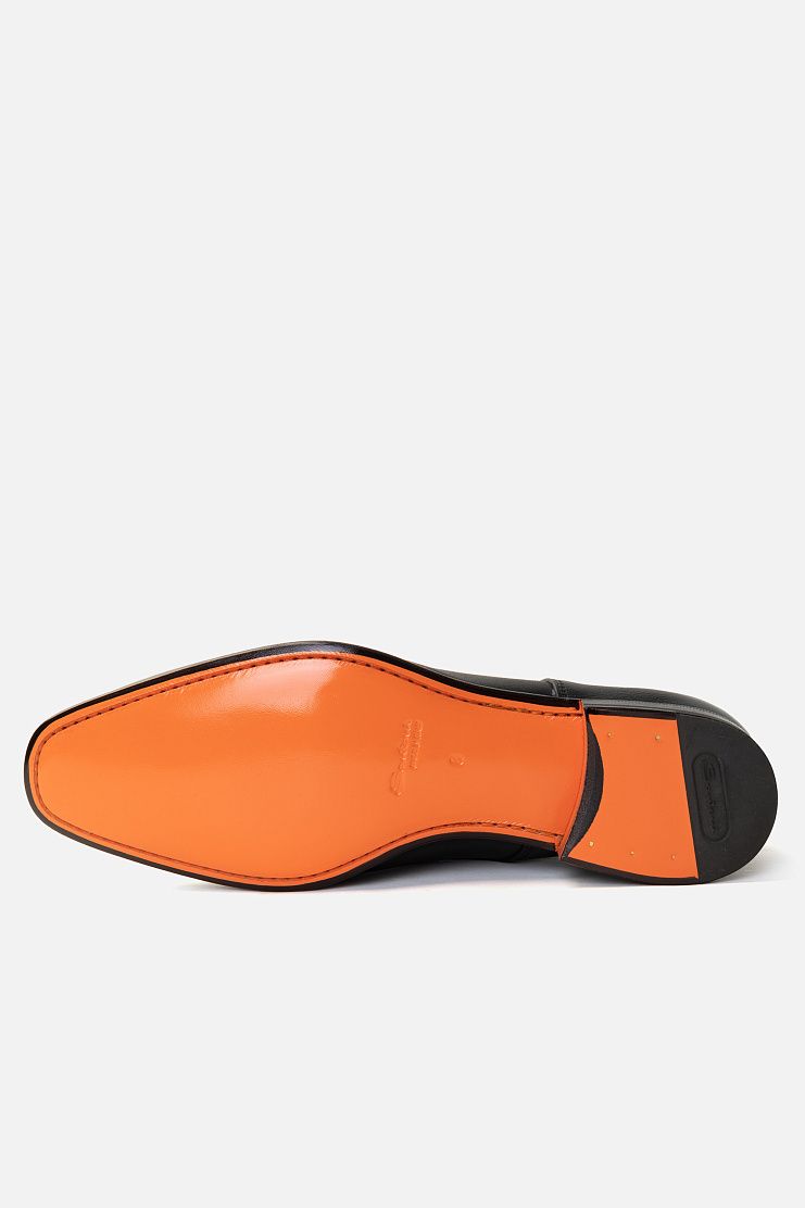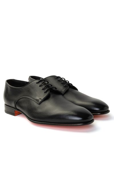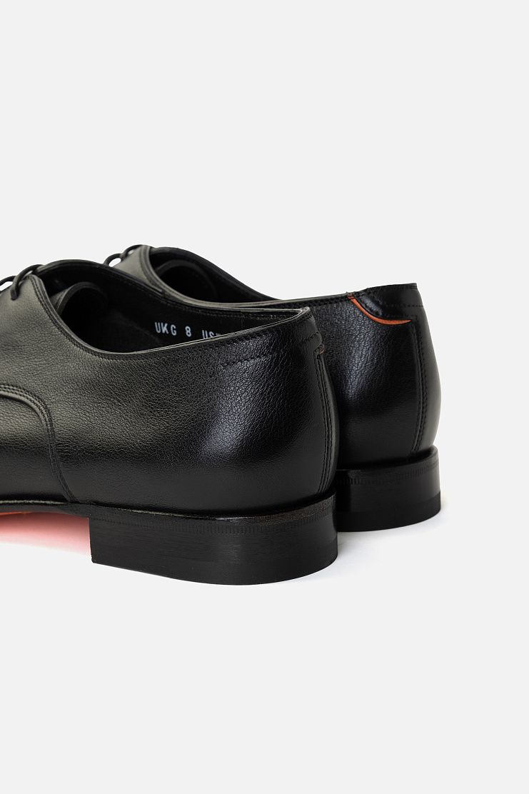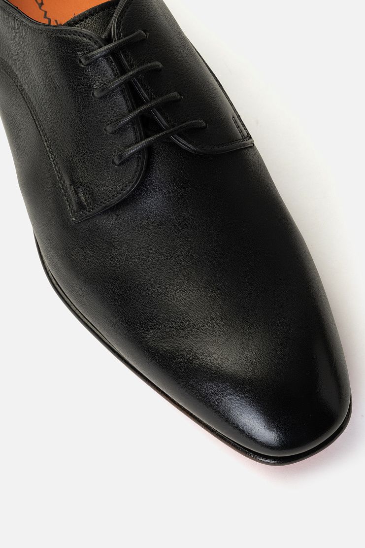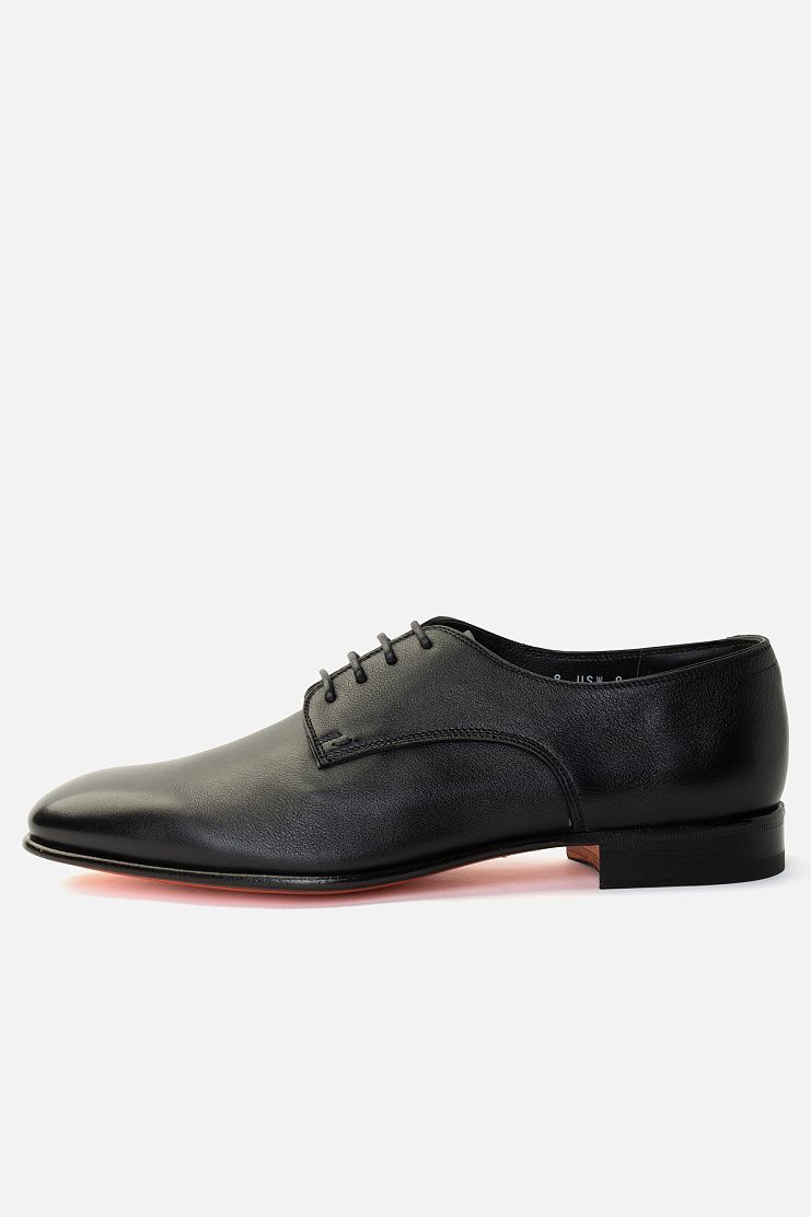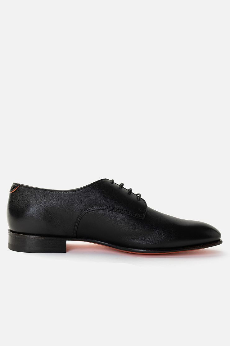 Лаконичные дерби с отполированным глянцевым мысом выполнили из гладкой телячьей кожи. Стелька и подошва фирменного оттенка Arancio Santoni придают модели фирменный акцент.